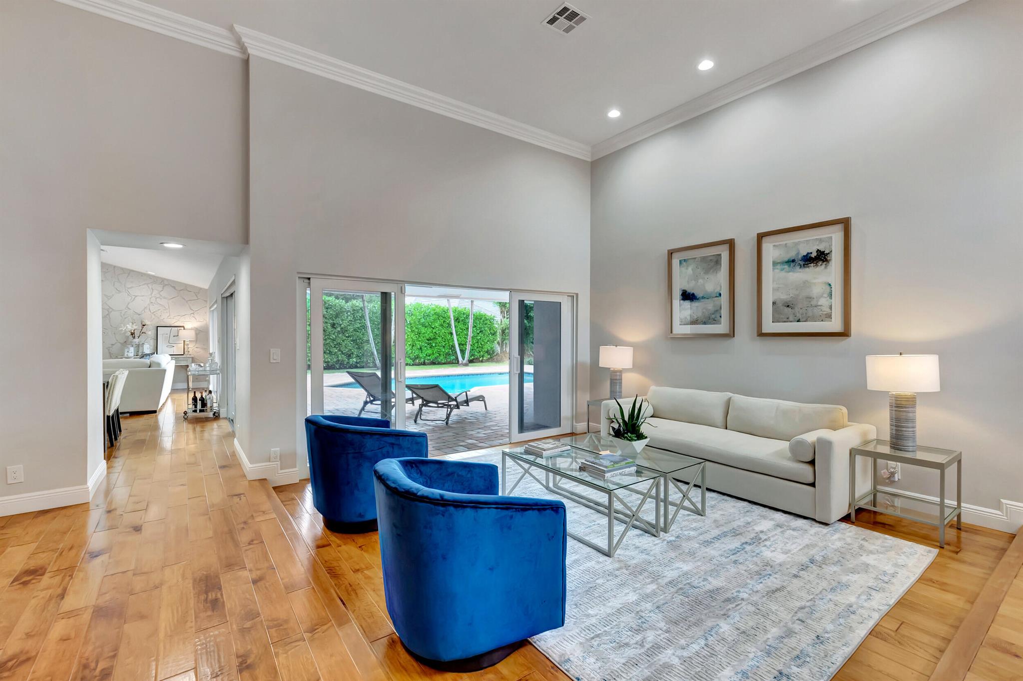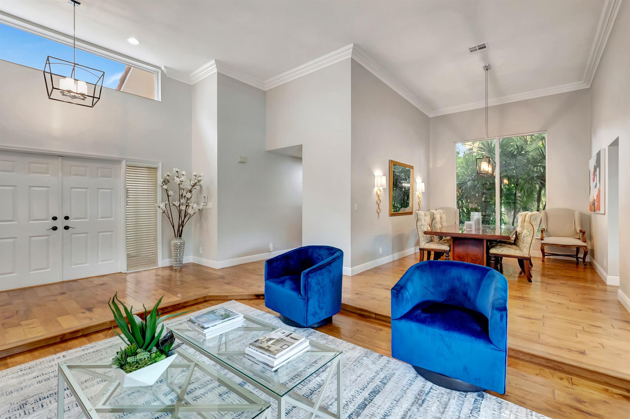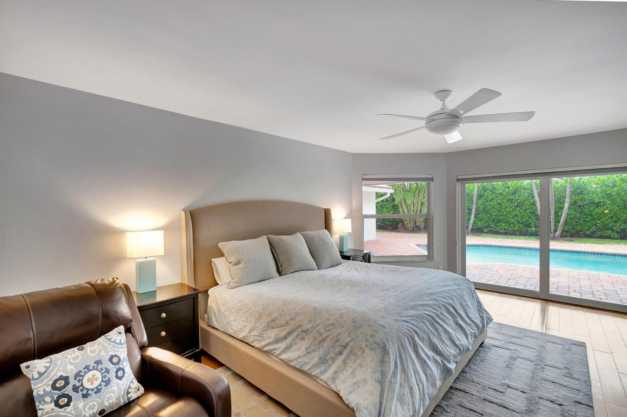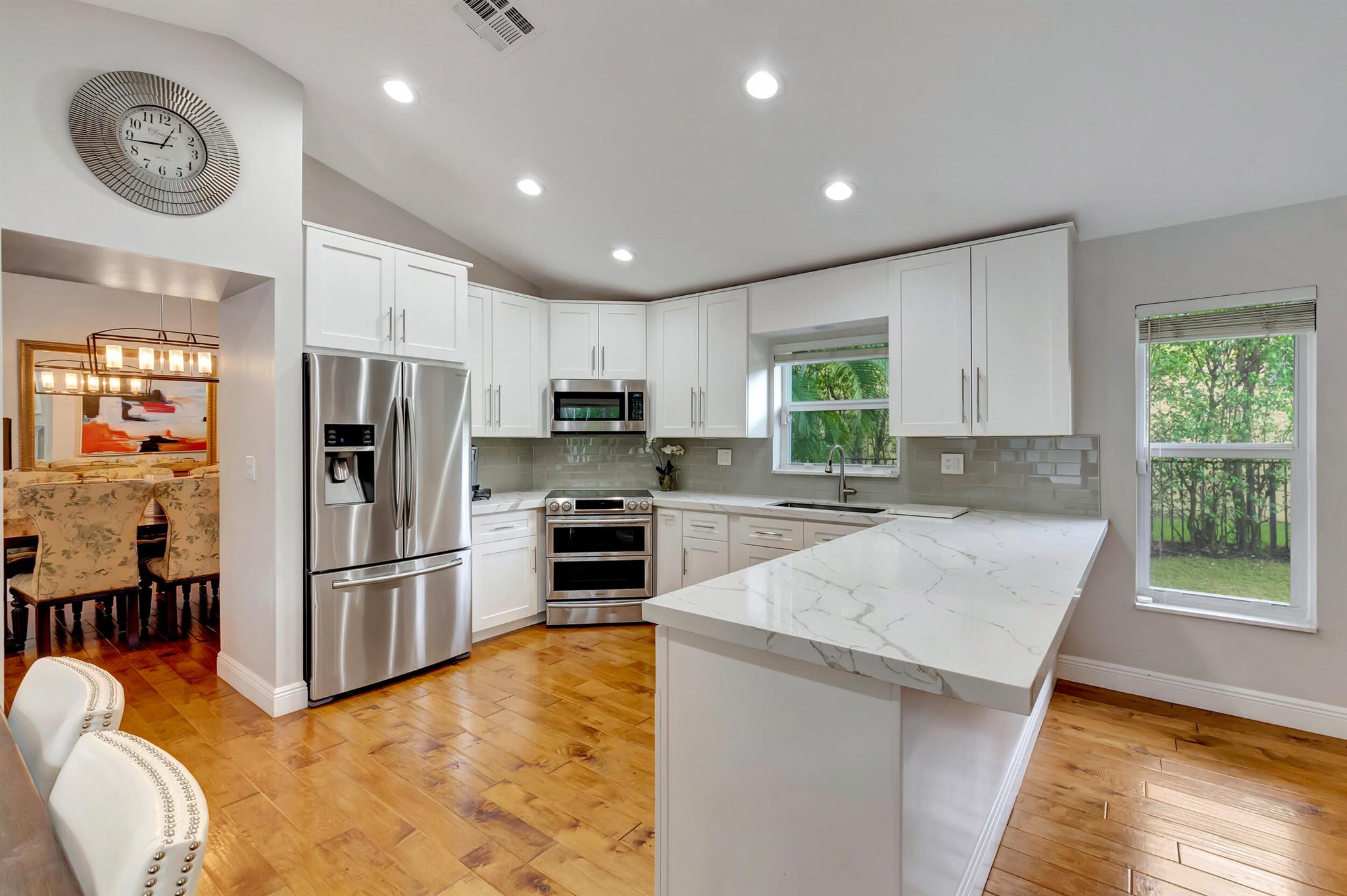 Located in The Colonnade in the heart of Boca Raton, this renovated 4 bedroom, 2.5 bath home, situated on over 1/3 acre lot, is an opportunity you won't want to miss! You'll love the open flow found inside the formal living and dining rooms with over 13 ft ceilings, smooth walls, crown molding, and hardwood floors all protected by impact windows and doors. Designed with entertaining in mind, the gourmet-style kitchen is open to the family room and features quartz counters, stainless appliances & plenty of storage. Enjoy pool views from the primary suite with large walk in closet and relax in the spa like master bath with freestanding tub, marble floors and frameless shower. The brick paved sundeck outback offers