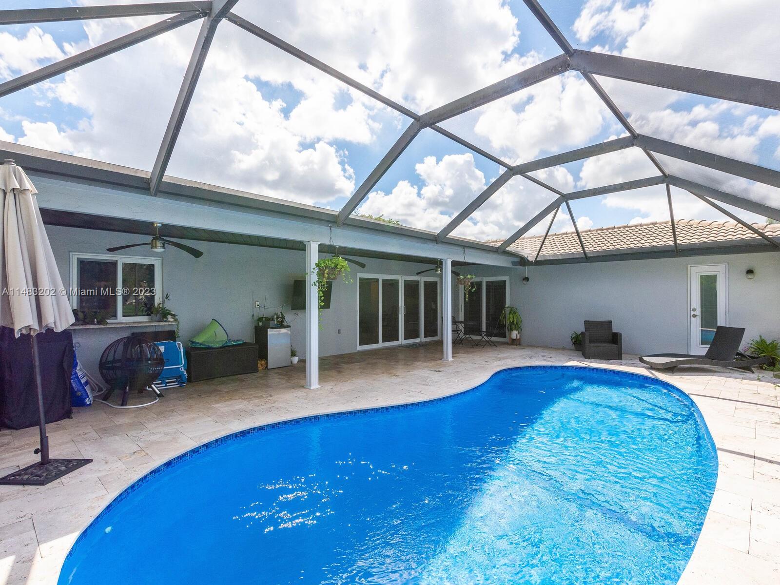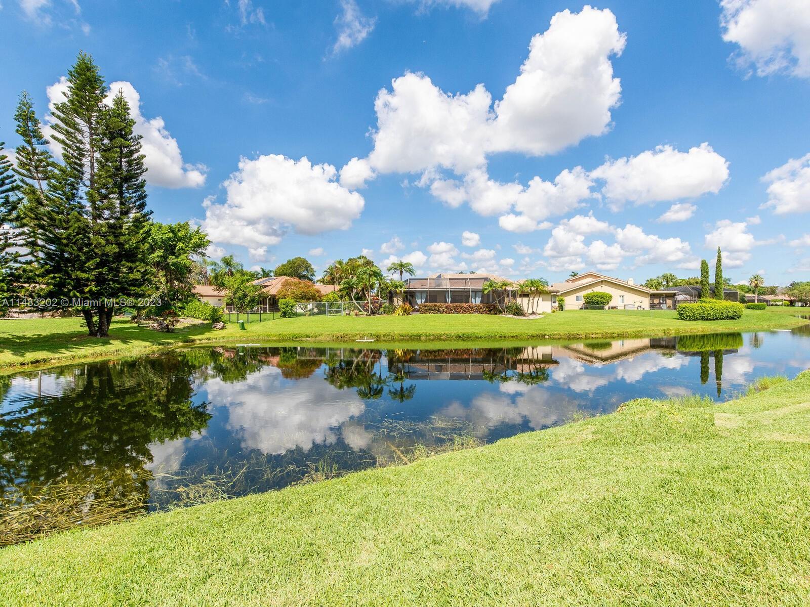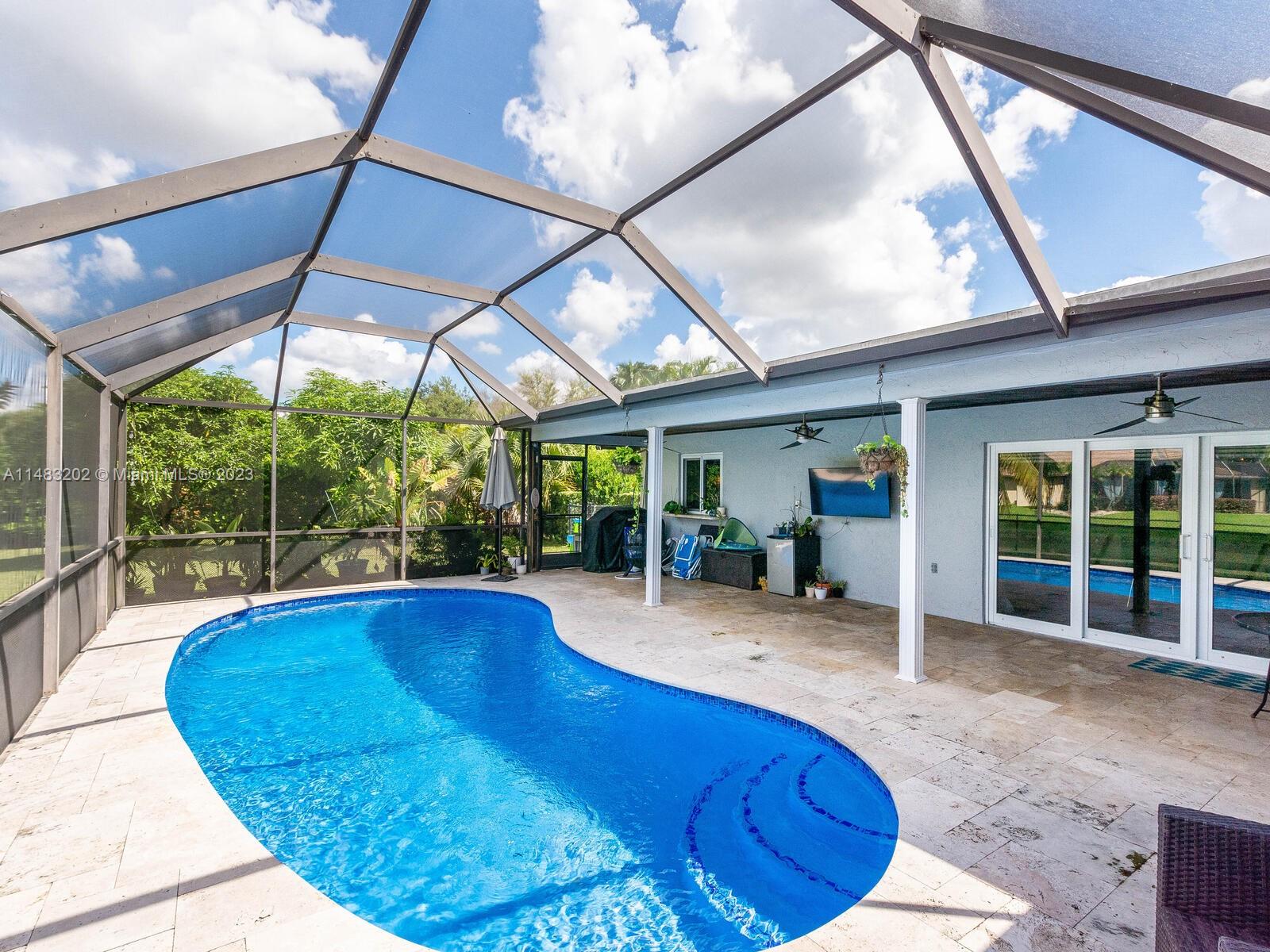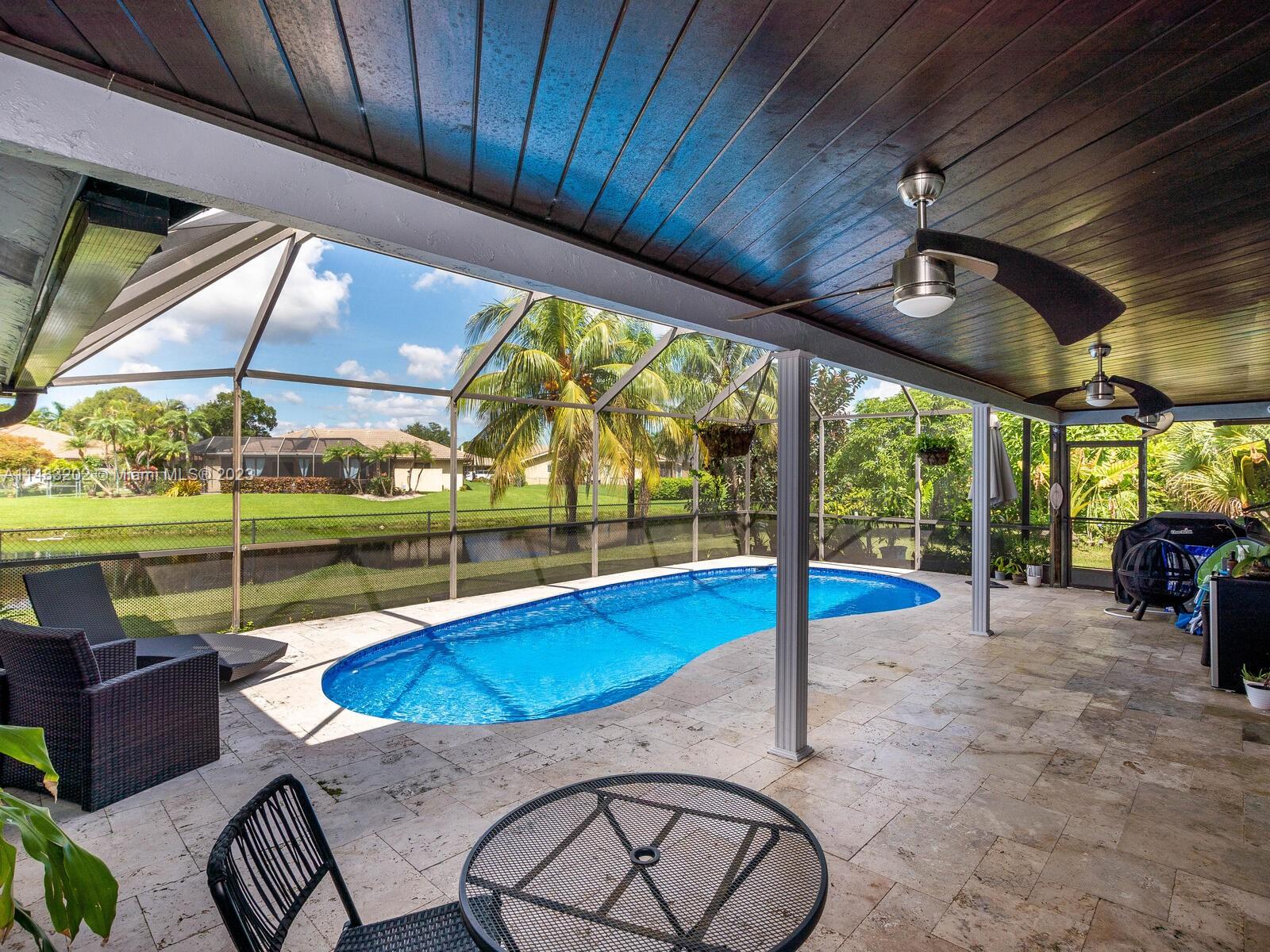 Stunningly updated 4/3 home on the water. Enjoy breathtaking sunsets from the living room, kitchen and back patio or under the mango trees! Located on a quiet street in highly desired community in Coral Springs, this home has all of the improvements you could ever want. Newer roof, & impact doors & windows for maximum safety, security and insurance discounts. Upgrades galore from the extended paver driveway to the front door, also floor to ceiling upgrades with high end laminate in the bedrooms & tile throughout, plantation shutters, fresh paint, & textured ceilings with updated lighting. The huge custom kitchen includes a work area, high end appliances, & storage all around the island. The sparkling blue pool is surrounded by a travertine deck, screened in patio & baby fence installed.