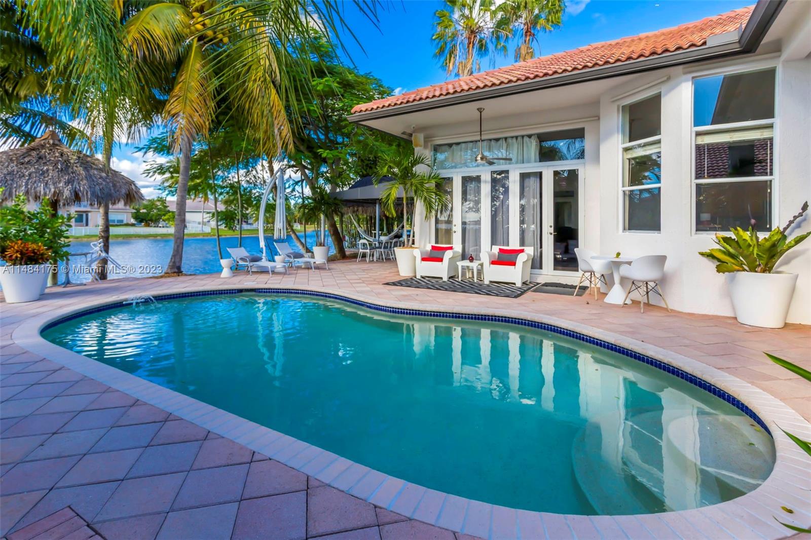 Exquisite single-story home boasting 5 bedrooms, 3 bathrooms, and a charming loft in the beautiful neighborhood of Sunset Lakes! This coveted model showcases a thoughtfully designed triple split floor plan, enhancing both privacy and functionality. Step into your backyard paradise, complete with a refreshing pool overlooking a picturesque lake. The outdoor retreat is enhanced by a Tiki hut, equipped with electric hookups, creating an ideal setting for seamless outdoor entertainment and relaxation.