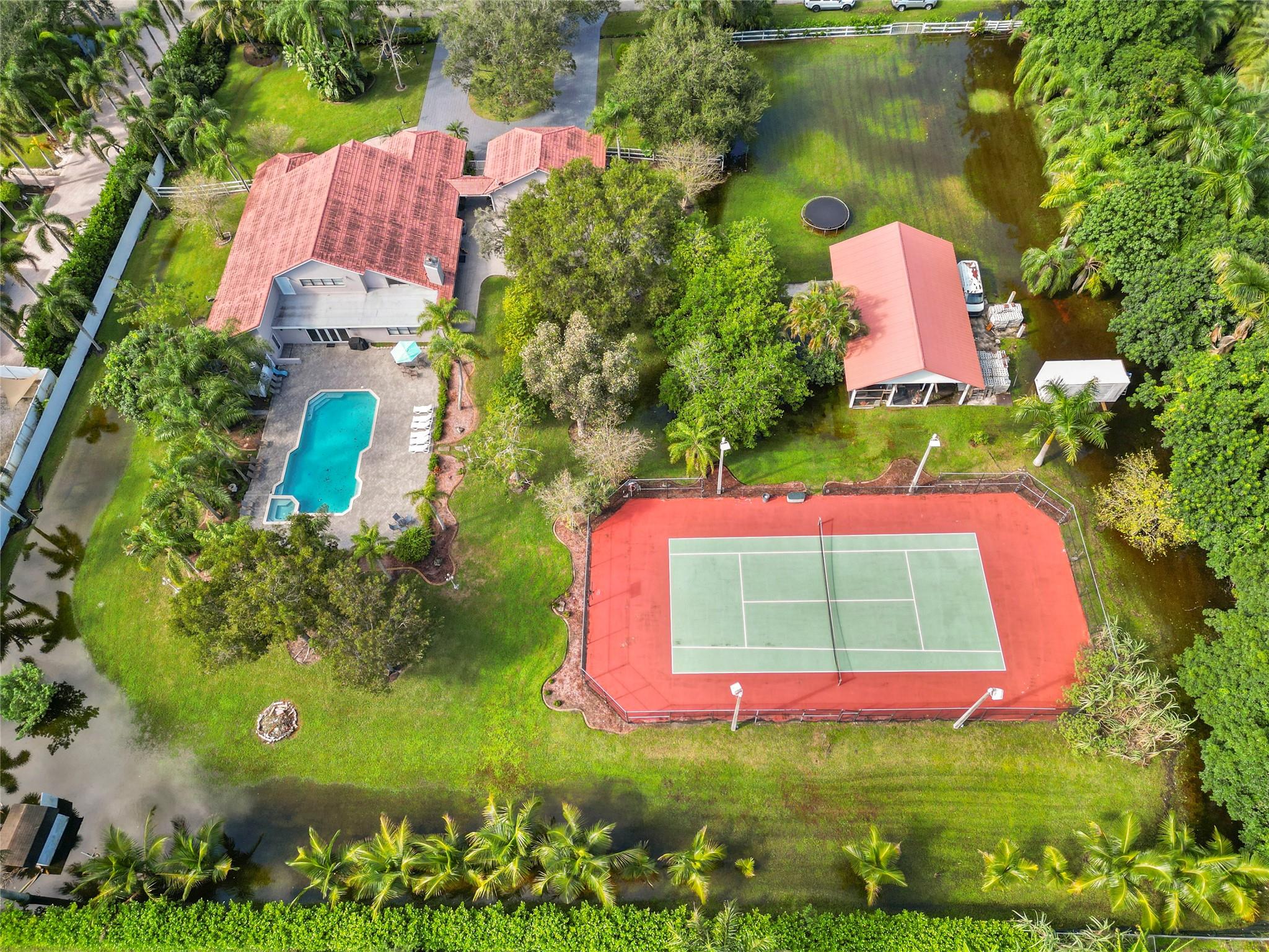Stately Residence on 2.34-acres with Unique Architecture & Curb Appeal in Sought-after Southwest Ranches! Mature Oak Trees adorn pavered grandiose driveway leading to a full Guest House & 3-vehicle deep garage. Foyer entry welcomes you home to 20' high vaulted ceiling over formal living room, dining room & spacious gourmet kitchen with granite counters & S/S appliances package. Florida family room designed perfectly for billiard entertaining & sports TV viewing with outdoor sights of the oversized pool, greenest of grounds, detached barn & private tennis court. This 5Bed/3Ba Main Residence with separate 1Bed/1Ba full Guest House is priced right allowing for a new owner to update if so desired. This home in SWR well under $2M is a treasure! Finder's keepers... won't last long! A must see!