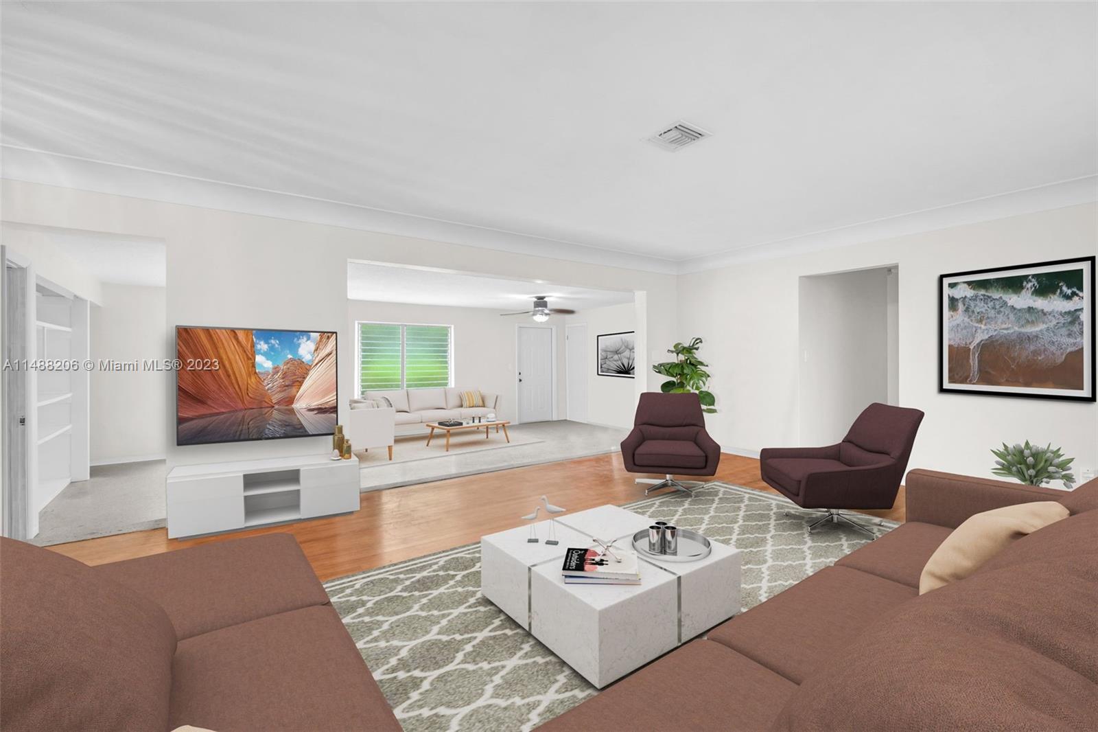 This Hollywood gem boasts over 2,000 sq ft of space with gleaming wood floors throughout. The spacious living room and dining room combo feature charming round molding and the Florida room fills the space with natural light. There's an additional bonus room that can serve as a 4th bedroom, den, or office. The kitchen is a delight, featuring quartz countertops, a double sink, wood cabinets, and a stylish tile backsplash. An updated primary bathroom with porcelain tiles and glass accents in the walk-in shower. A carport for one car and ample parking at the back, a fenced yard, and room for a pool add to the property's allure. The laundry room comes with a newer washer and dryer, and a new water heater. Landscaping adorned with stones on walkways and a 10X20 shed for extra storage.