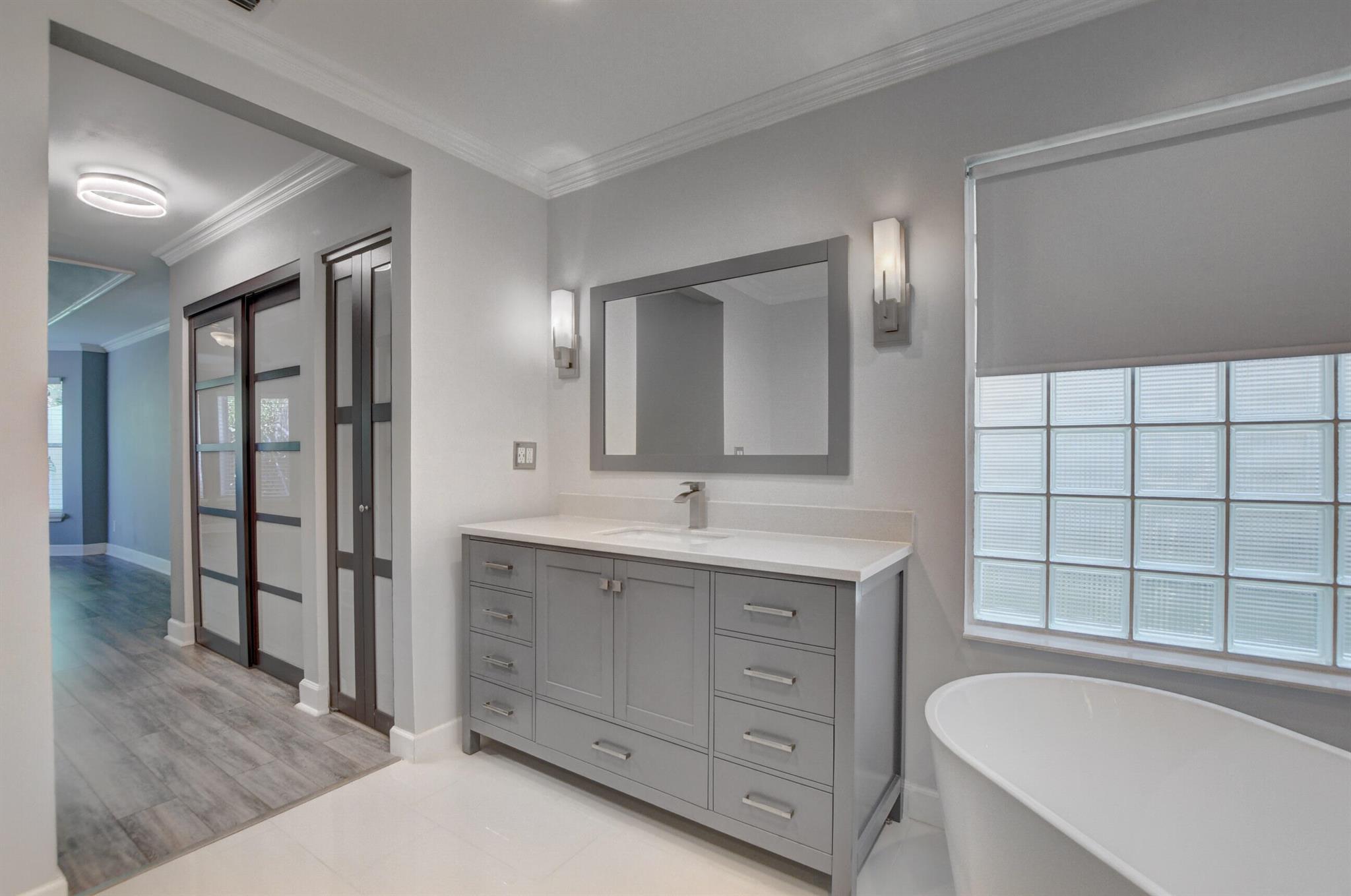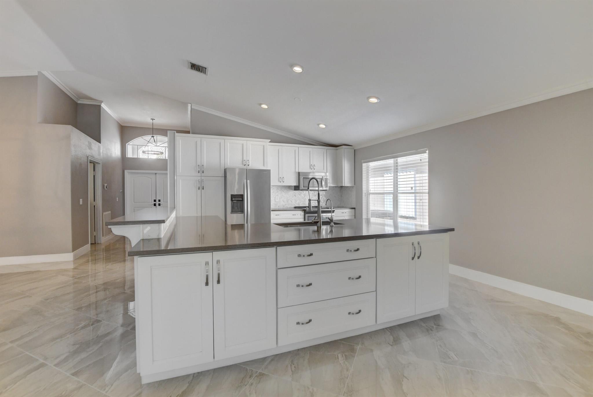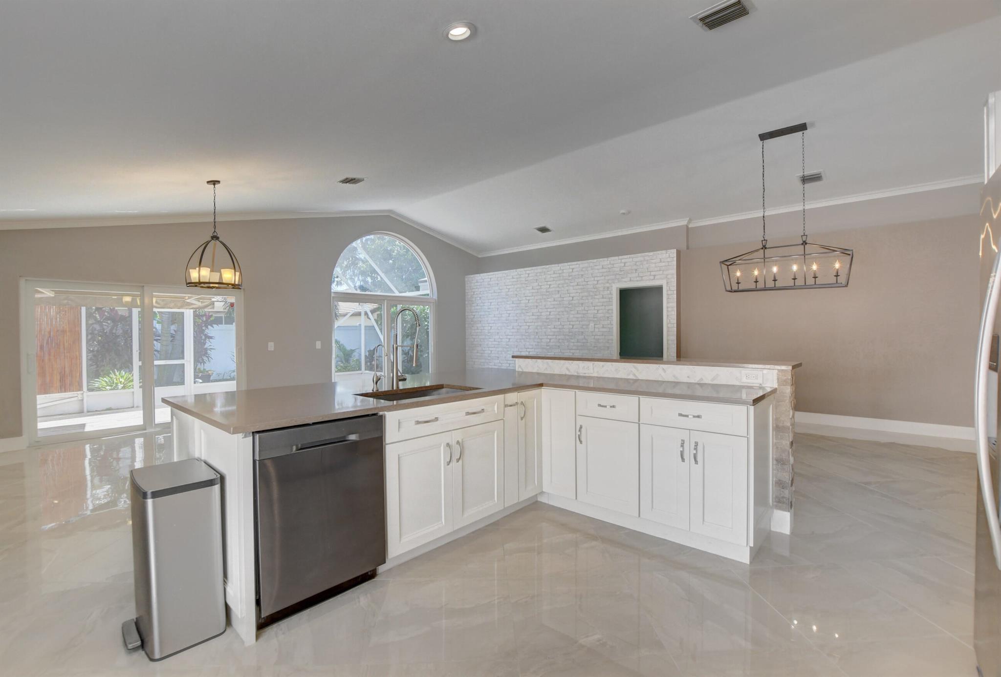 Your Symphony Bay dream home awaits! This home has been updated throughout including exterior paint (2023) and a newer roof (June 2021). Inside, you'll find a split-bedroom floor plan with a spacious great room, perfect for entertaining. The modern kitchen features white cabinets, quartz counters, stainless appliances, and add'l storage under the island. The large master suite is a true haven, offering a walk-in closet with built-ins and two add'l closets. The updated master bath has a freestanding soaking tub and dual sinks. Enjoy the lush tropical landscaping and beautiful South Florida weather from your screened patio. The sliding glass doors and arched window are both impact glass providing safety and security. Smart home features include a Nest thermostat and MyQ garage door opener.