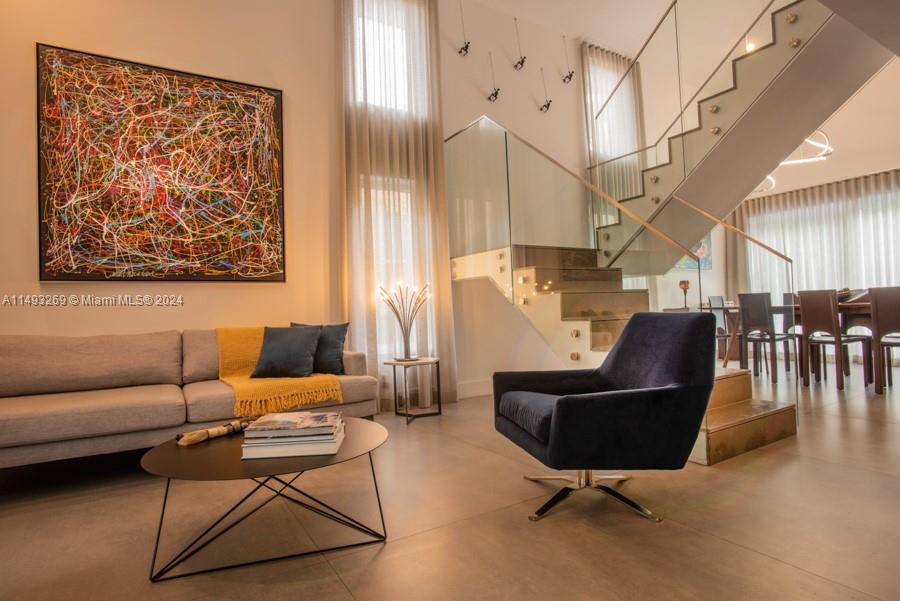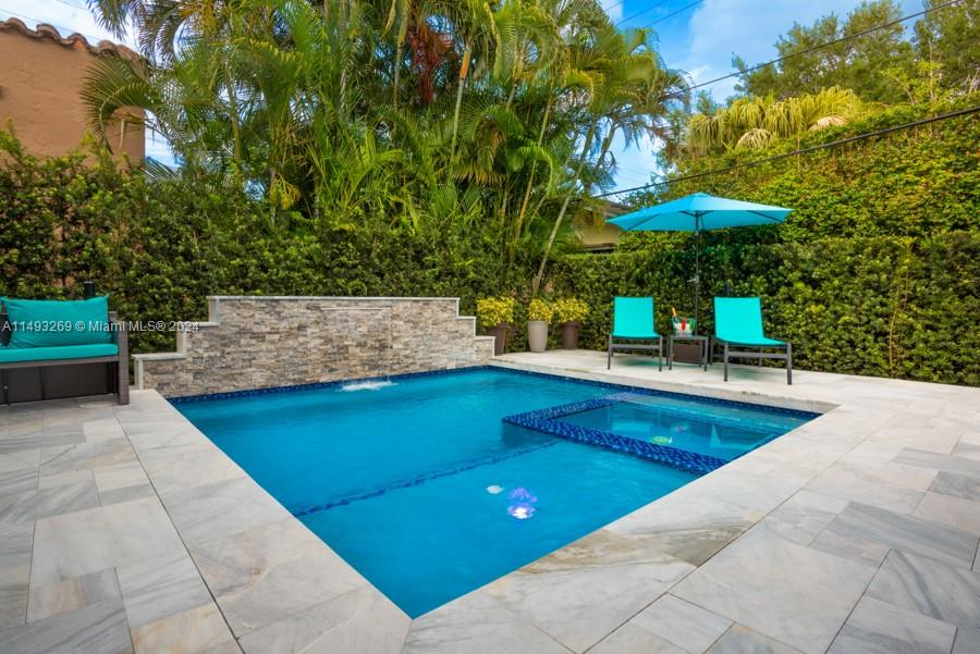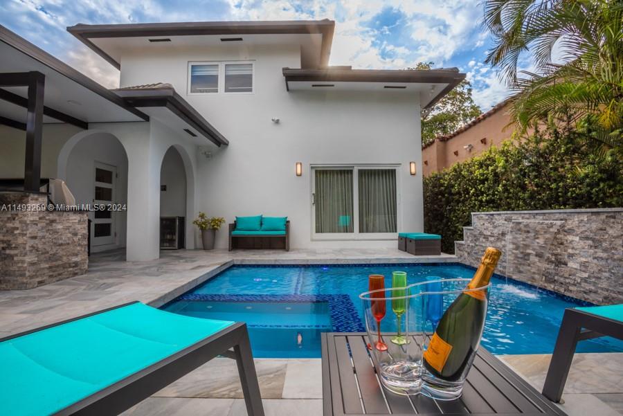 It is a stunning two-story home with a Pool & SPA— The property is fully remodeled with high-end materials. It is an open floor plan with a 3/3 plus a home-office area in the primary bedroom and a climatized 2-car garage with a laundry and extra storage. It has impacted doors and windows. Has a water filter system, a new roof, new electrical wiring, a central vacuum, a tankless water heater, 2 A/C units with new ducts and modern linear vent grills, LED lighting, and an irrigation system with automation. As soon as you walk in you will see a high-ceiling living and dining room with recessed lighting and a modern chandelier, a cozy family room, a full bathroom, and a spacious kitchen.