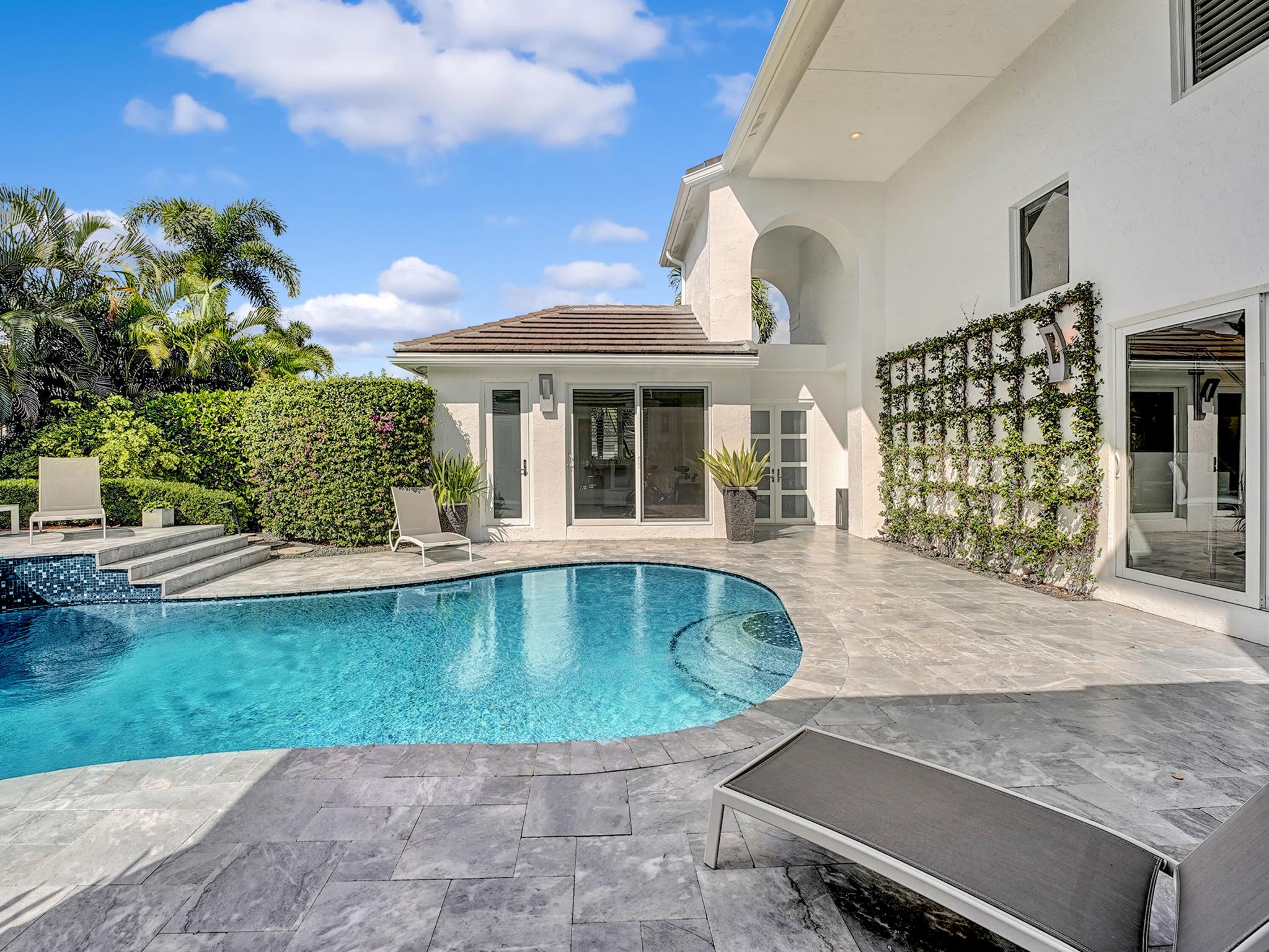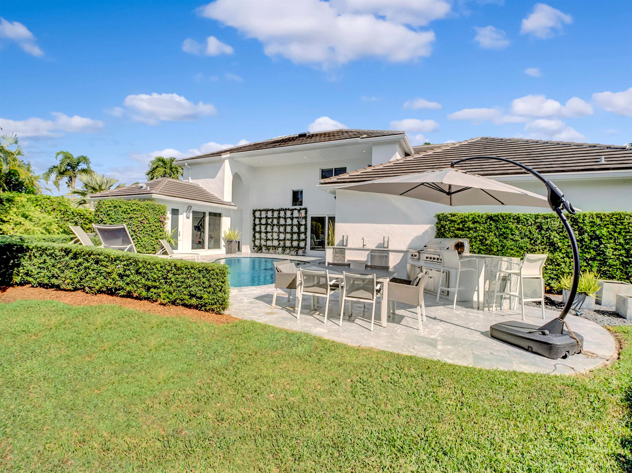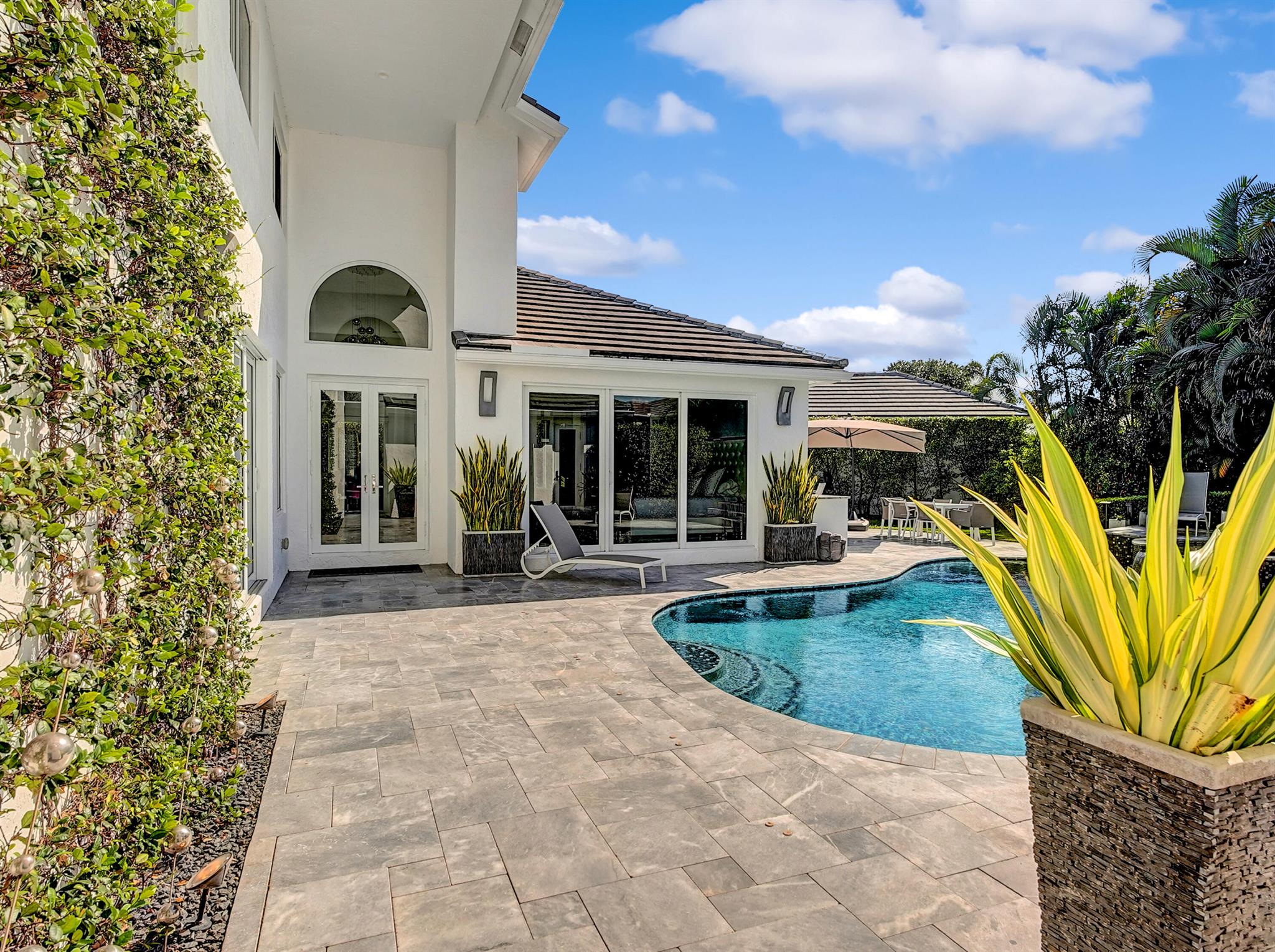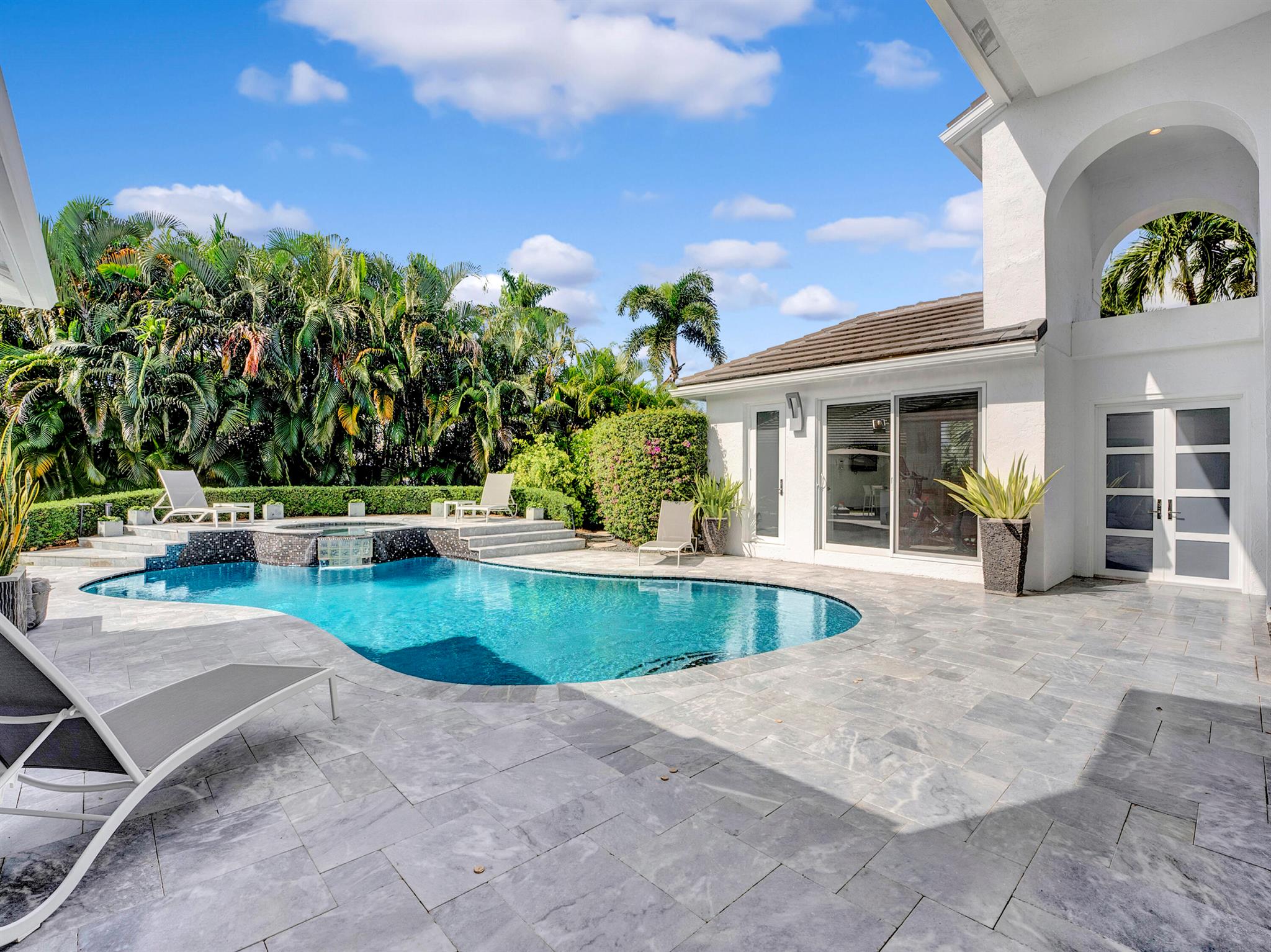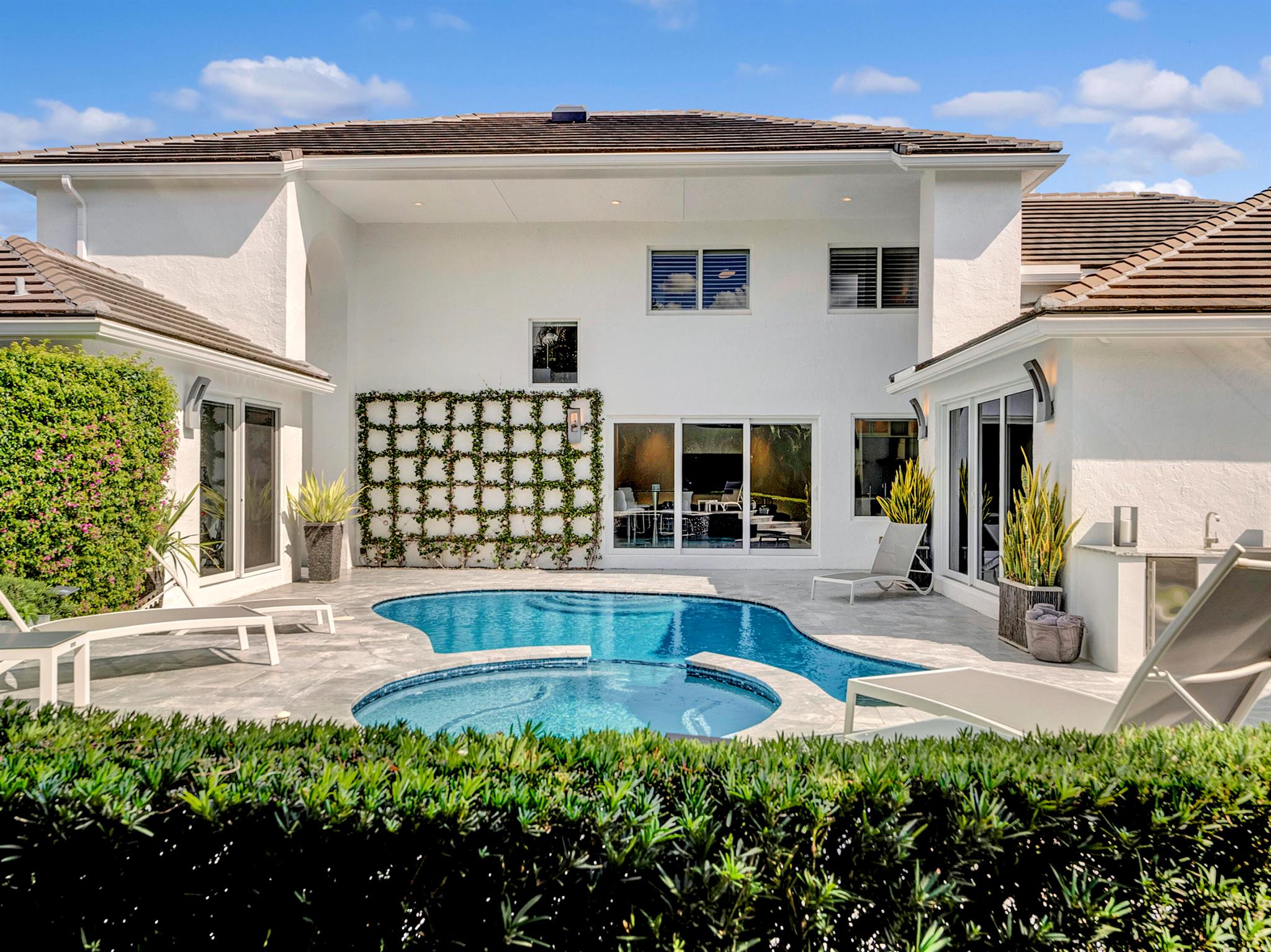 Stunning contemporary courtyard two story home on oversized private lot with a guest house, that includes bedroom and bath. Free form floating pool with waterfall and spa. The patio has marble pavers and a summer kitchen with DSS appliances. Total renovation, primary main floor bedroom en-suite with walk-in closets, second floor bedroom en-suite with walk-in closet, kitchen with exquisite cabinetry and countertops, all remodeled bathrooms, 4 x 6 Italian porcelain flooring on main floor, plantation shutters/remote blinds, impact hurricane windows, 2019 roof with 10 yr warranty. Amenities include a championship golf course, tennis and pickleball courts, a state-of the art fitness center, kids club, restaurants, clubhouse and newly renovated spa. Membership in Woodfield is required