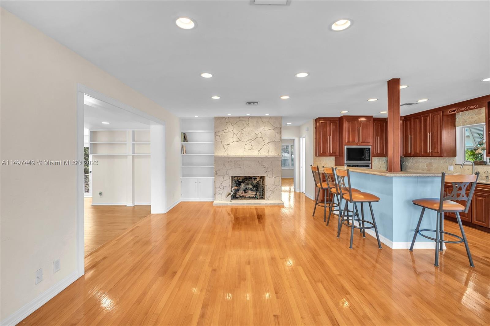 A truly remarkable residence in the heart of Hollywood Lakes. This two-story pool home, with 3 beds, 2 baths, and a 1-car garage, sits on a deep lot, extending to the prestigious north South Lake Drive. Has a unique open floor plan with red oak floors leading you to an open kitchen. Kitchen features are endless with an open island, granite countertops, a Subzero fridge, a Wolf stove top, a wall oven with a built-in microwave, and a warming door. This home offers flexible living space with 2 beds/1 bath downstairs and 1/1 upstairs. A gas fireplace with coral tile adds charm to the living room. The A/C was replaced in 2018 and the home has a connection for a portable generator that will be included.200 amp electrical with a surge protector, and shutter panels for all windows enhance comfort.
