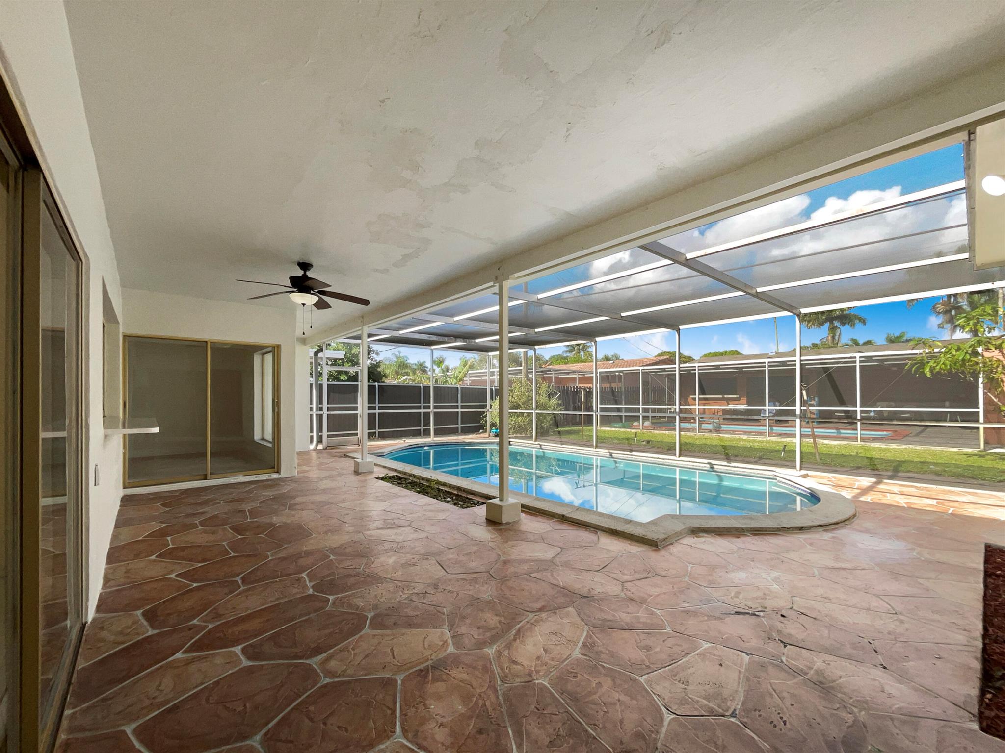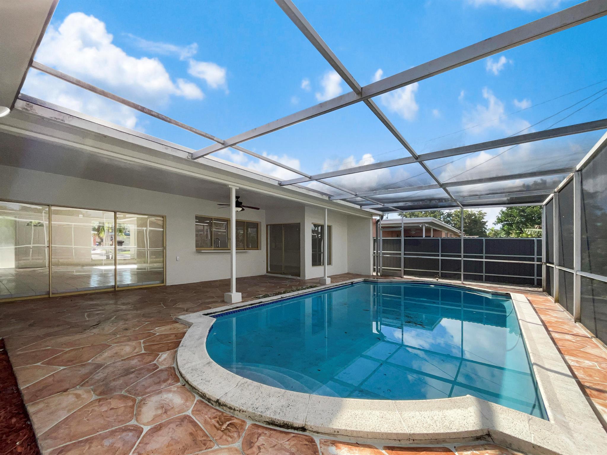 Welcome to this beautiful property that offers an inviting and serene living environment. The natural color palette throughout the home provides a calming ambiance, while the nice backsplash in the kitchen adds a touch of elegance. The master bedroom boasts a spacious walk-in closet, ensuring ample storage space. With additional rooms for flexible living, you have the freedom to create a personalized setup that meets your needs.The primary bathroom offers good under sink storage, keeping all your essentials organized and easily accessible. Enjoy the peace of mind provided by the fenced-in backyard, creating a safe space for outdoor. Indulge in the luxury of a private in-ground pool in the backyard. The covered sitting area in the backyard is ideal for unwinding and entertaining guests.