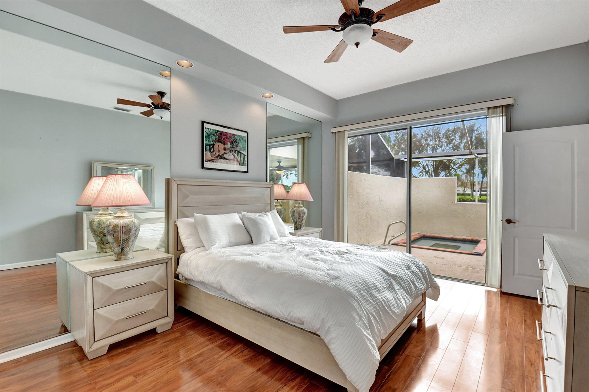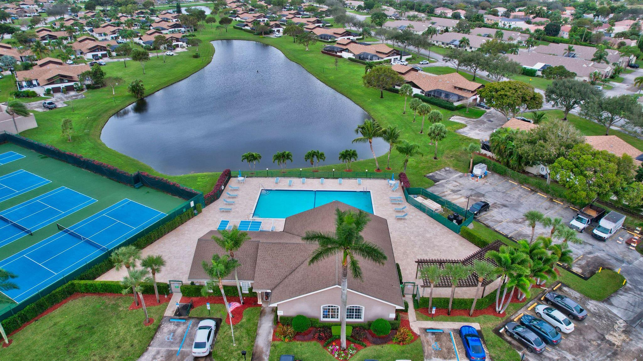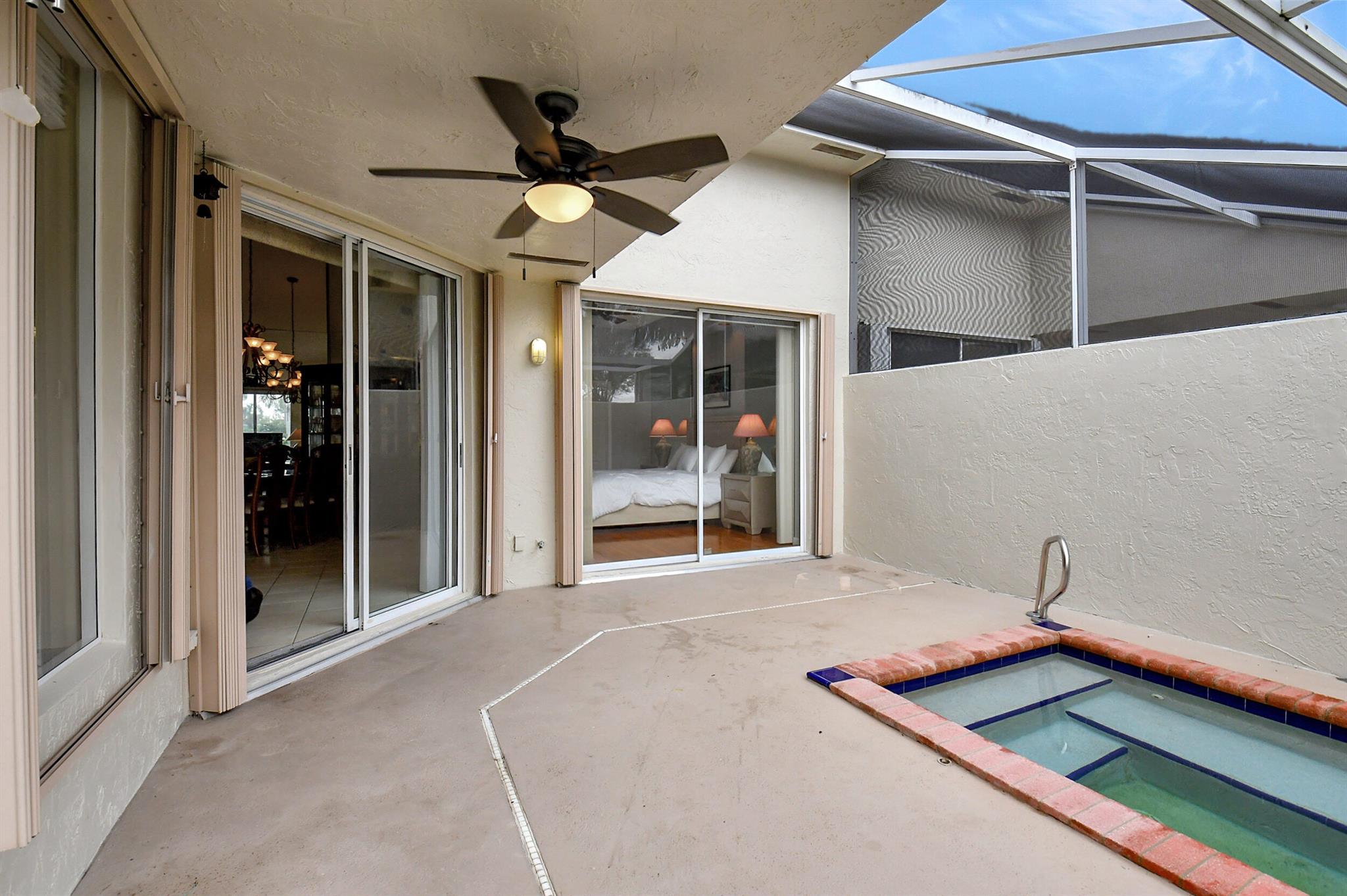 JACUZZI PATIO, NEW ROOF, HUGE SIDE YARD! Tile and laminate floors throughout. Gorgeous bathroom remodels . Kitchen is huge with wood cabinets and large island. Big 1 car garage and top Boca location for schools and shopping. Only townhome in Boca with pool/spa at this price. Huge screened patio with large grass area next to townhouse. no direct neighbors . Quiet neighborhood.Low HOA.End unit. Complete hurricane accordion shutters. Located next to community pool ,, gym , basketball court, pickleball court .Pet friendly.HOA pays for roof maintenance and replacement, all lawn maintenance, exterior painting, and cable TV.