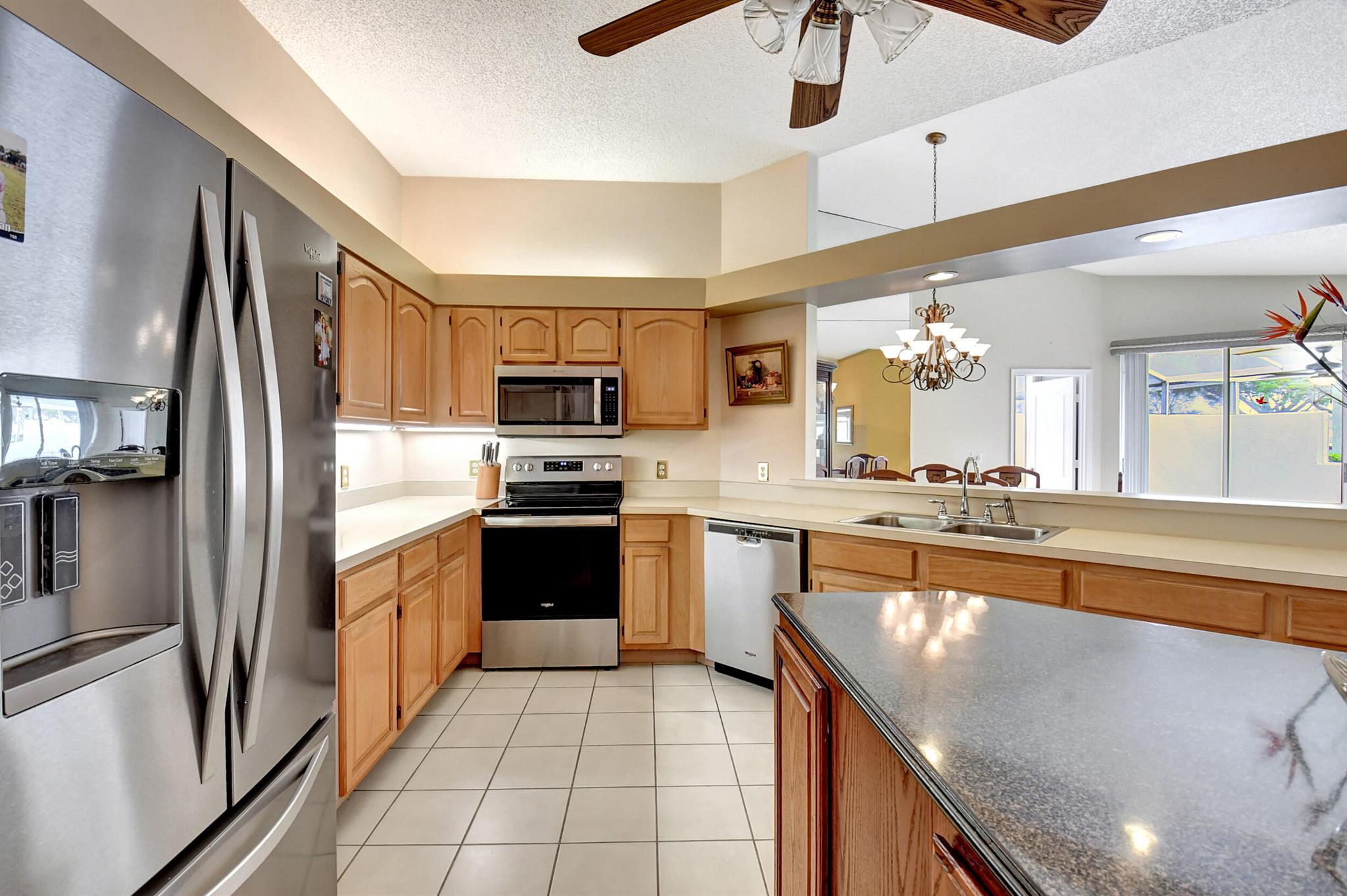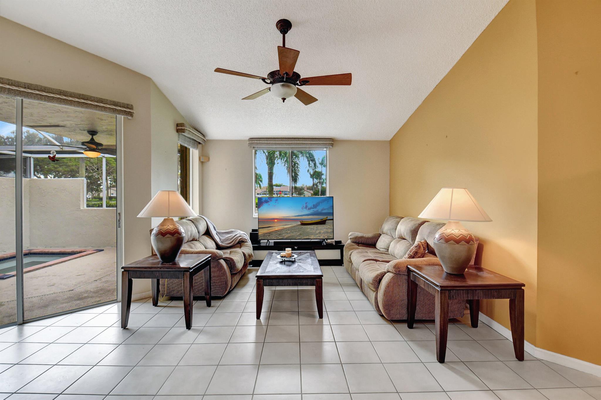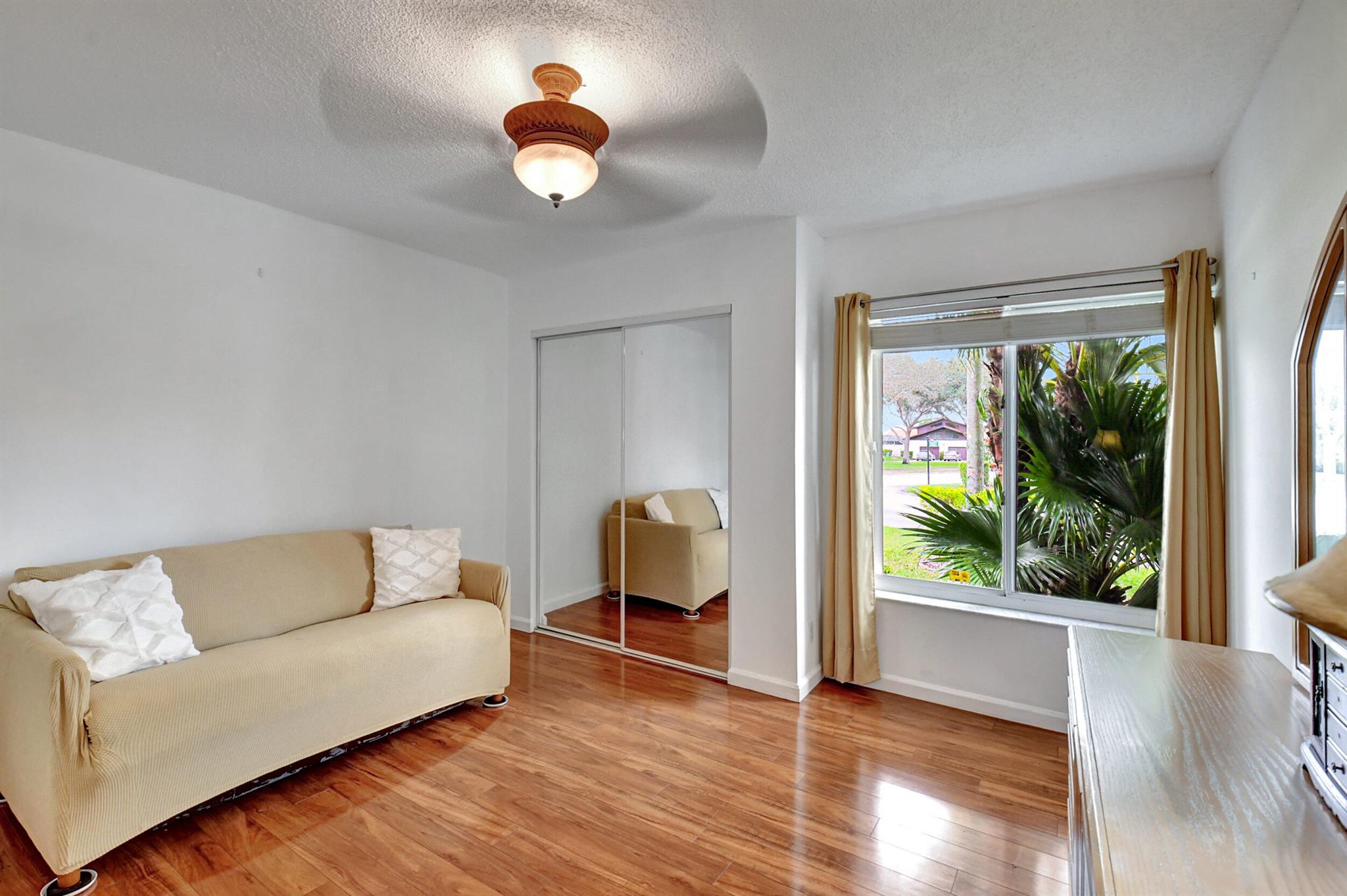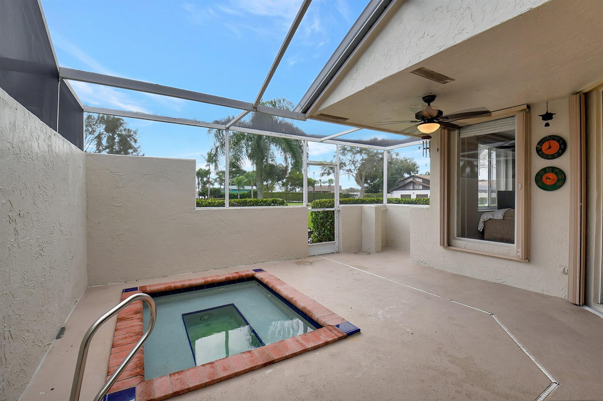 JACUZZI PATIO, NEW ROOF, HUGE SIDE YARD! Tile and laminate floors throughout. Gorgeous bathroom remodels . Kitchen is huge with wood cabinets and large island. Big 1 car garage and top Boca location for schools and shopping. Only townhome in Boca with pool/spa at this price. Huge screened patio with large grass area next to townhouse. no direct neighbors . Quiet neighborhood.Low HOA.End unit. Complete hurricane accordion shutters. Located next to community pool ,, gym , basketball court, pickleball court .Pet friendly.HOA pays for roof maintenance and replacement, all lawn maintenance, exterior painting, and cable TV.