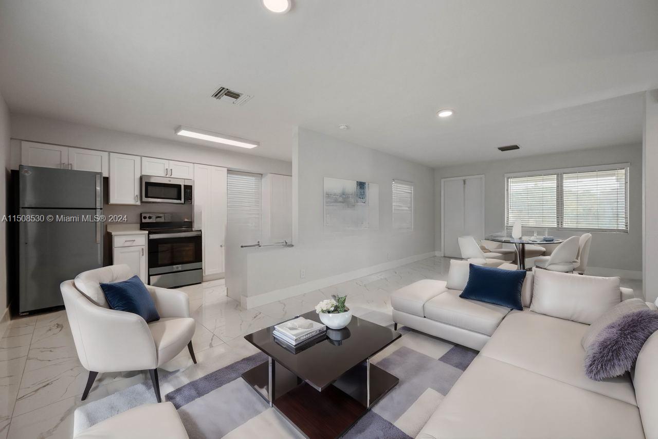 Remodeled home where every detail has been meticulously updated. Upon entering, you are greeted by a bright & airy open floor plan. The living room flows seamlessly into dining area, making it an ideal space for entertaining. The floors throughout the home have been upgraded with new porcelain tiles. Kitchen is equipped with brand new stainless steel appliances & ample cabinet space. White quartz countertop adds a modern touch. The two bedrooms are generously sized & bathroom has been tastefully updated with modern fixtures & finishes. The home also features a separate laundry & storage room. Fresh paint & updated lighting fixtures create a warm & inviting atmosphere throughout the home. Large yard for outdoor activities. Carport provides covered parking. Pictures are Virtually staged