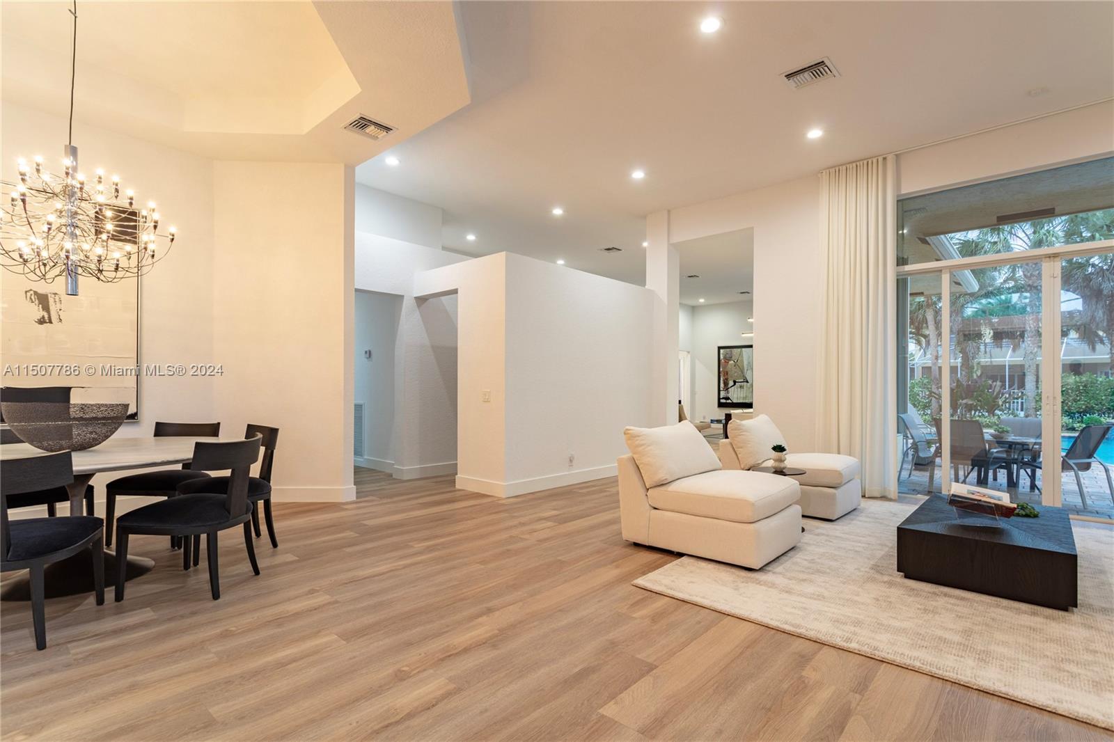 Stunning, renovated (2021) single story residence boasts five generously sized bedrooms, three beautifully updated bathrooms, and a 3 car garage offered by original owner in Weston Hills Country Club's newest enclave, Victoria. Professional interior design exudes a casual sophistication showcasing a contemporary kitchen adorned with white quartz countertops, contrasting espresso cabinetry, stainless appliances, and modern range hood. Exquisite lighting and custom white drapery amplify the high ceilings and open floor plan. A 36 x 22 renovated (2020) sparkling blue freeform swimming pool with spillover spa charm in the fully fenced backyard tropically landscaped for privacy. Zoned for Weston's A+ rated schools, shows like a model exemplifying true pride in ownership.