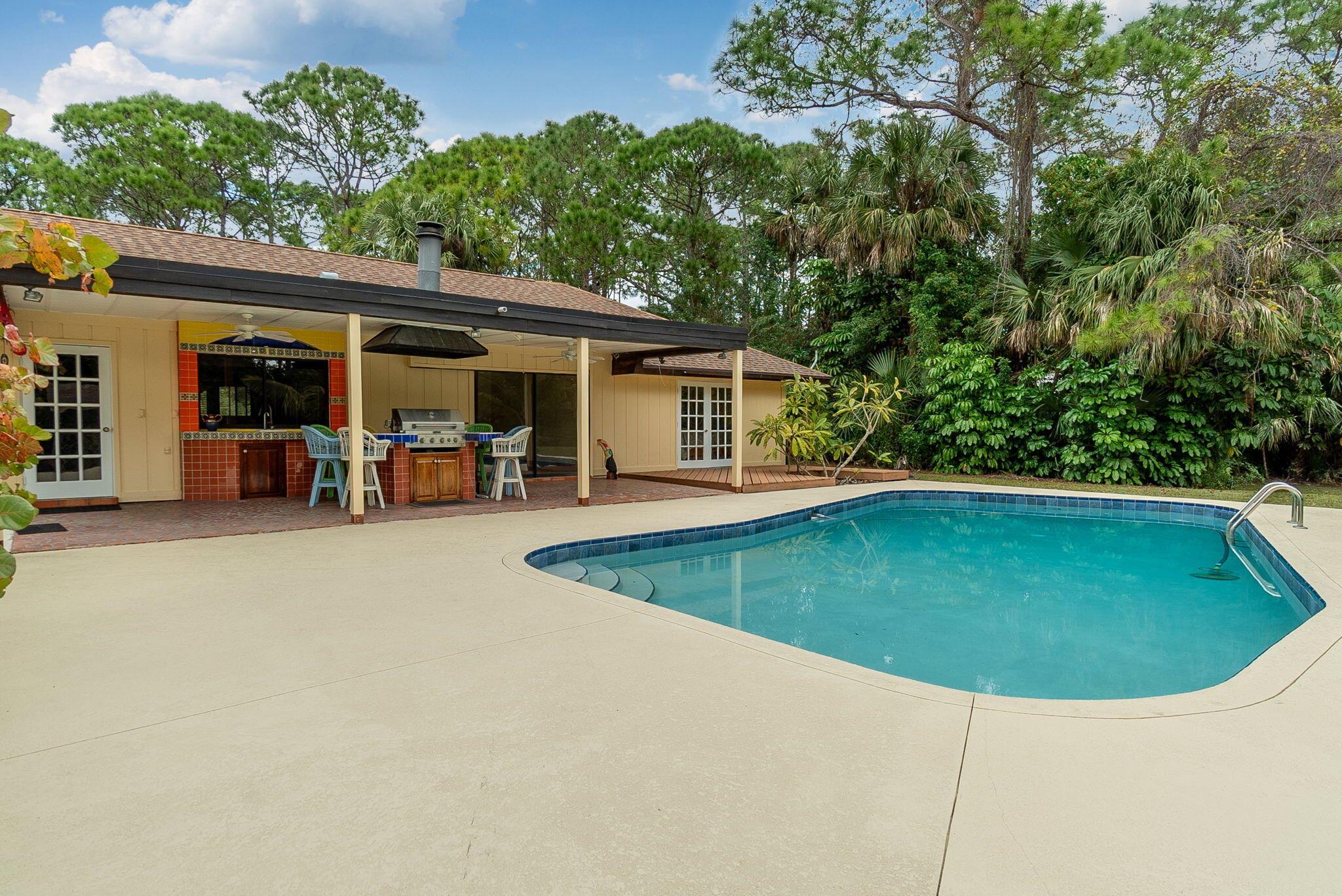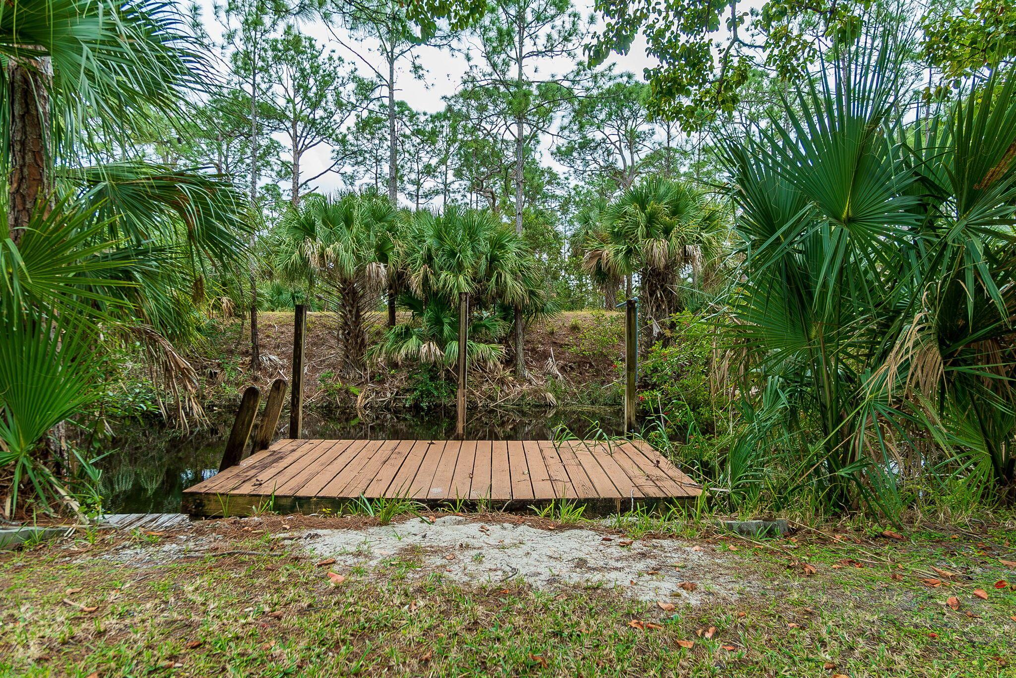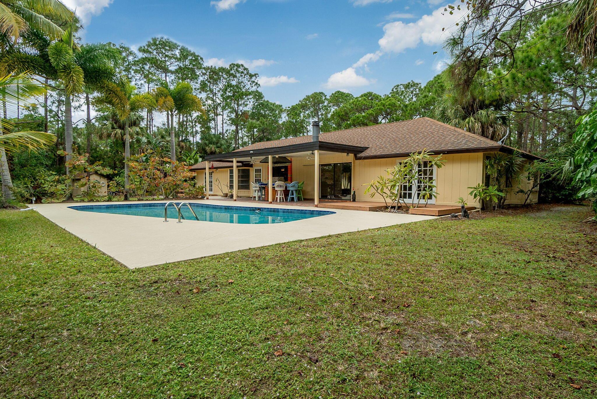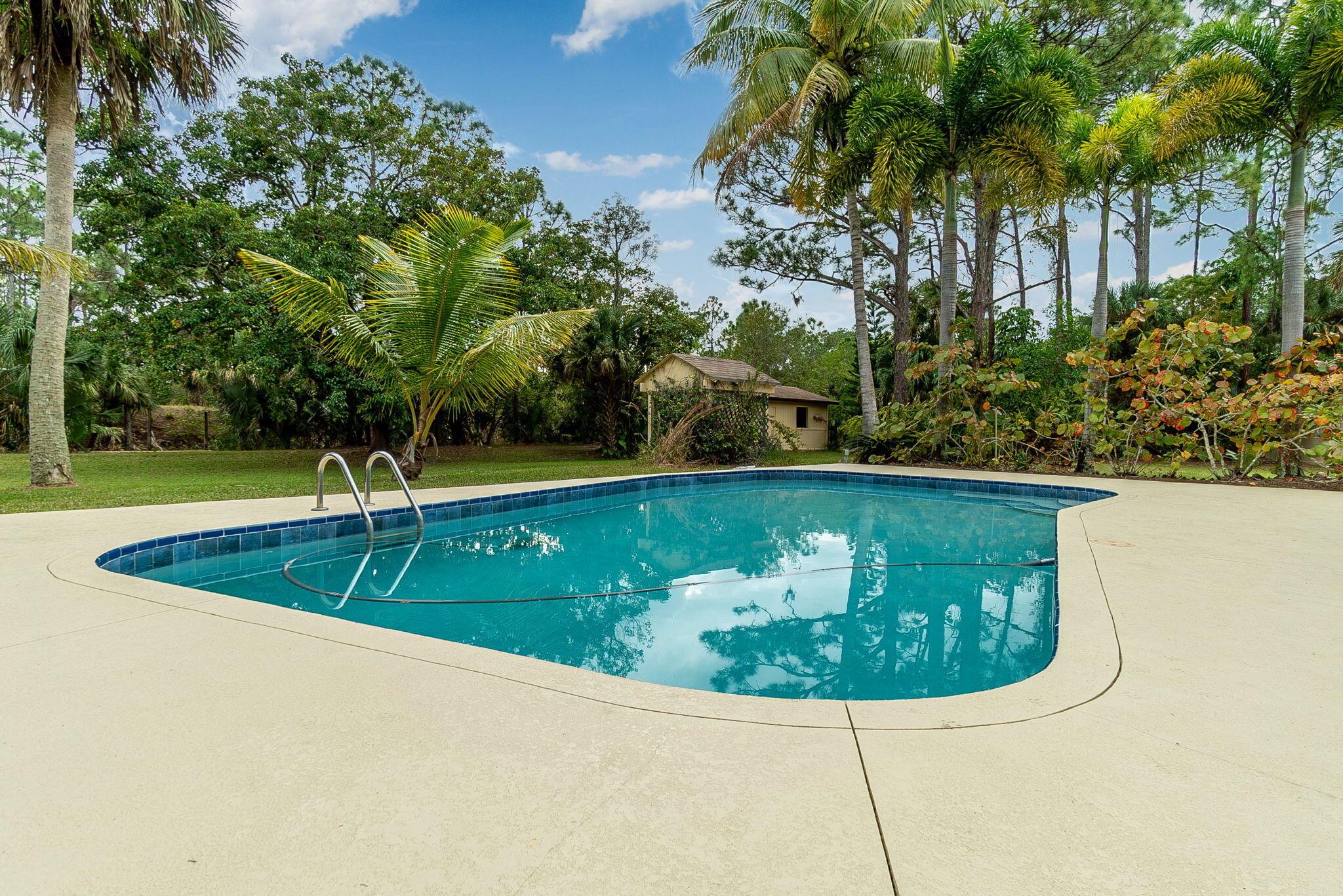 Rare Find *CANALFRONT* 4/2/2 in Palm Beach Country Estates PLUS there is a County 30' Easement on the West Side for added space & CORNER LOT!! This fabulous home backs up to a canal w/a private boat dock. This 1.34 acre private & secluded lot (as behind the canal is the 2700-acre Sandhill Crane Wildlife Refuge. The home features a newly refinished large pool & patio deck w/ 30' covered patio & summer kitchen w/bar. Newer A/C & Water Softener System-City H2O Avail., Lg Bedrooms, Stainless Appliances, Wood Cabinets, Granite Countertop, Pass Thru to Patio. Real Wood Burning Fireplace, Real Wood Exposed Beams, Interior Laundry Room, French Doors, Crown Molding, Lg Entry Way, New Epoxy Garage Floors. Plenty of Storage w/exterior shed & Horse Barn! Paved Road! Lots of New! NO HOA! Must See!!