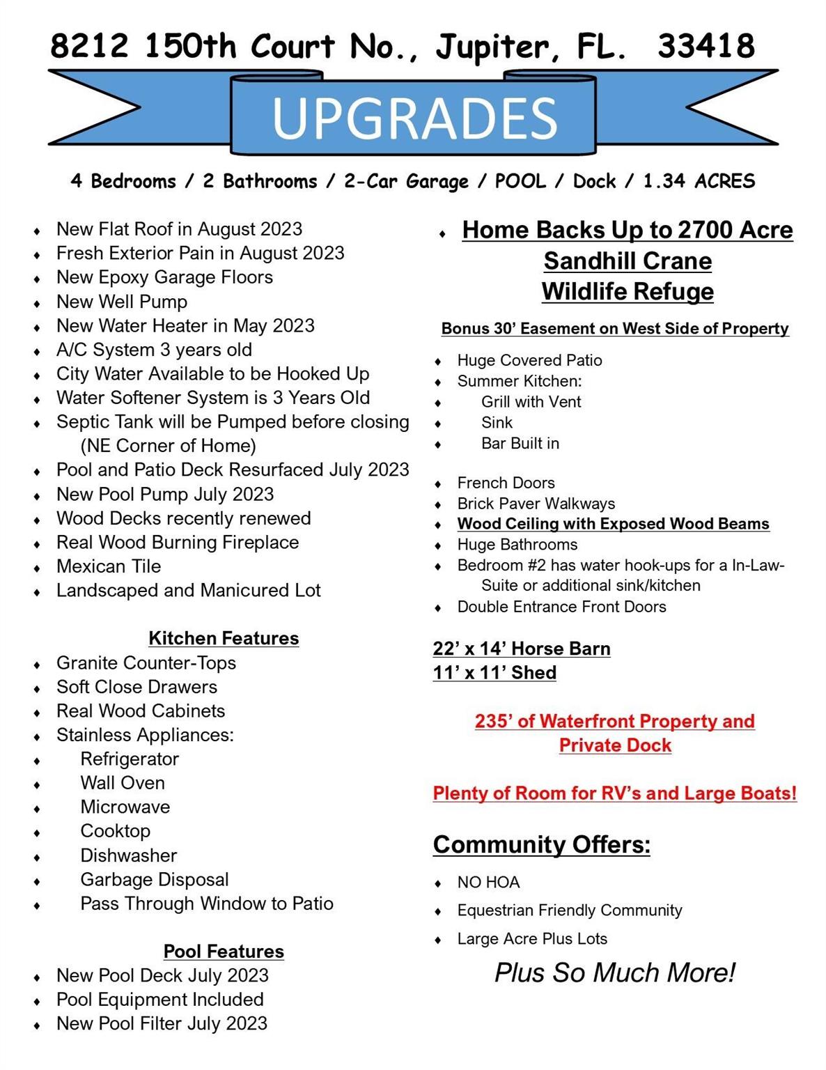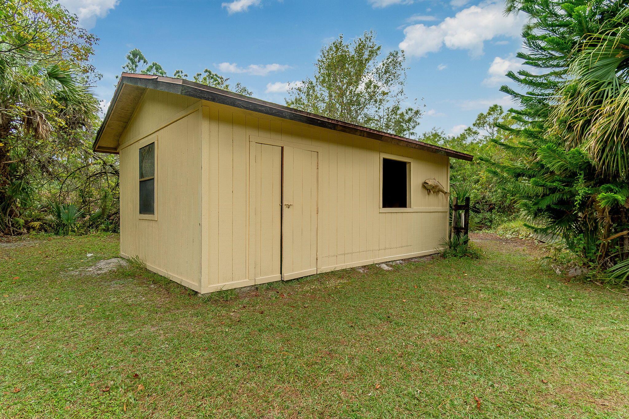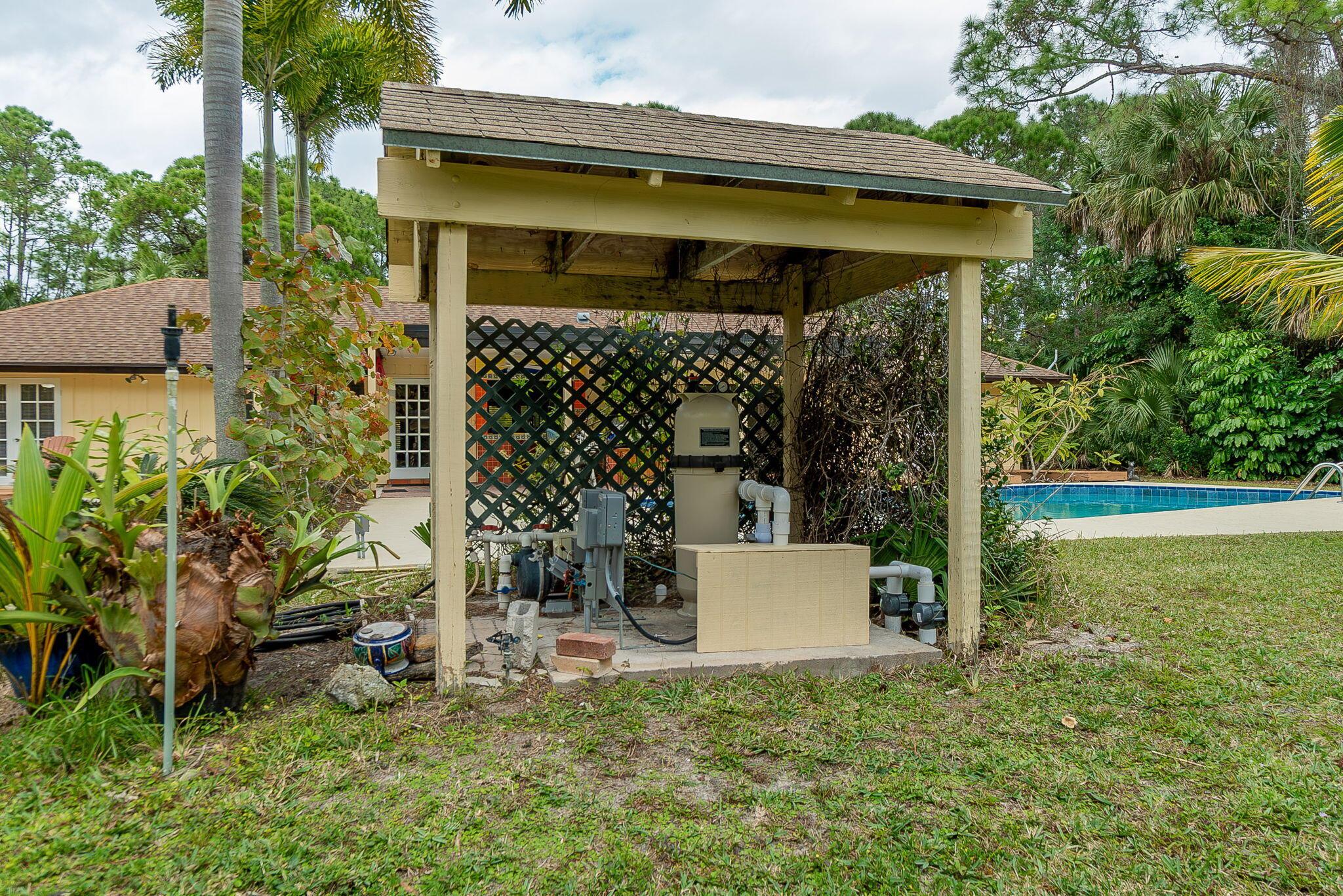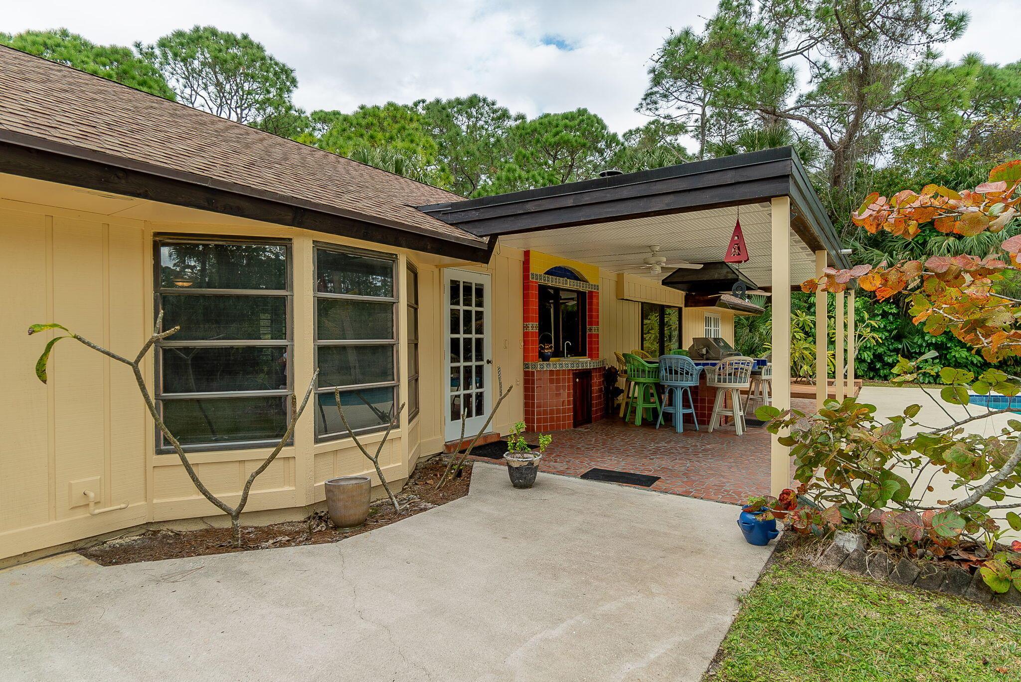 Rare Find *CANALFRONT* 4/2/2 in Palm Beach Country Estates PLUS there is a County 30' Easement on the West Side for added space & CORNER LOT!! This fabulous home backs up to a canal w/a private boat dock. This 1.34 acre private & secluded lot (as behind the canal is the 2700-acre Sandhill Crane Wildlife Refuge. The home features a newly refinished large pool & patio deck w/ 30' covered patio & summer kitchen w/bar. Newer A/C & Water Softener System-City H2O Avail., Lg Bedrooms, Stainless Appliances, Wood Cabinets, Granite Countertop, Pass Thru to Patio. Real Wood Burning Fireplace, Real Wood Exposed Beams, Interior Laundry Room, French Doors, Crown Molding, Lg Entry Way, New Epoxy Garage Floors. Plenty of Storage w/exterior shed & Horse Barn! Paved Road! Lots of New! NO HOA! Must See!!