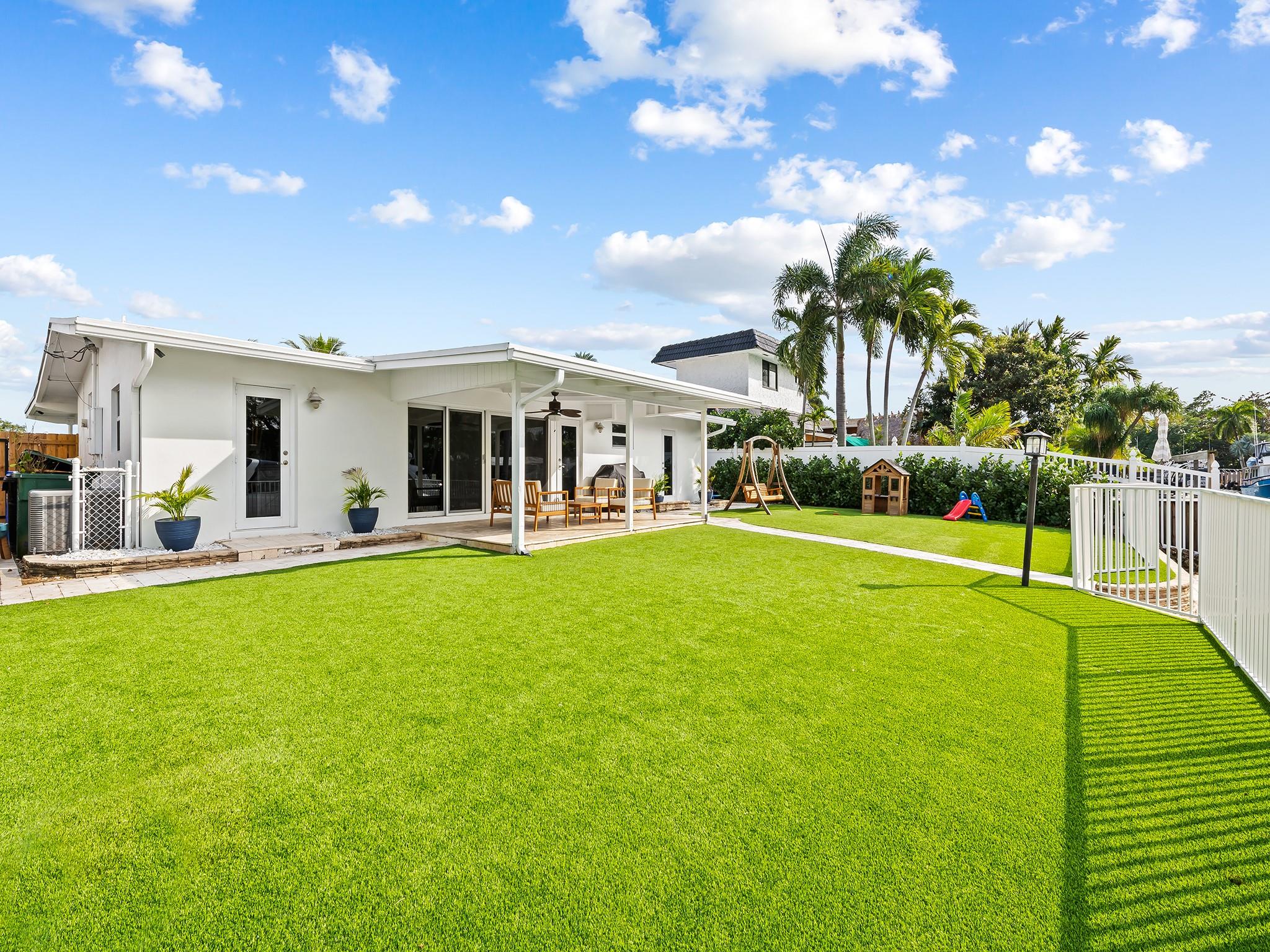 Waterfront home in Lauderdale Isles 2 BD | 2 BA | 70' of waterfront nestled in a great community in Fort Lauderdale. Open floor plan with Italian tile throughout the living and dining room. Enjoy entertaining and cooking in a newly 2023 renovated kitchen with new cabinets, quartz countertops and appliances. Relish in the maintenance free backyard with artificial grass. If you are a boater there is nothing better than getting straight on your boat from your own backyard and having direct access to the ocean for some fun on the water. Cherish the afternoons with views of the sun setting where the skies light up with spectacular colors. Avoid the sun and rain with your covered parking. New AC installed in 2021. Impact windows/doors No fixed bridges/Ocean Access/Deep Canals
