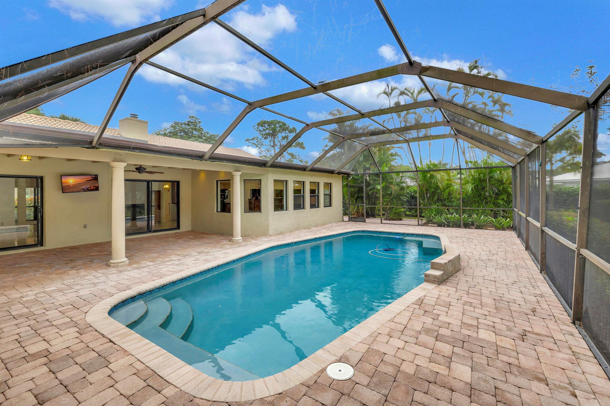 Discover this rare find nestled on a half-acre lot in the heart of Boca. A hidden gem, this absolutely beautiful home is discreetly tucked away in the back of the community, ensuring tranquility and privacy. The property boasts a sprawling fenced 1/2 acre lot, providing a sense of exclusivity and space. Security is paramount with a 24-hour manned security gate, offering peace of mind for residents. The large screened patio & pool area create a perfect retreat for relaxation and entertainment, surrounded by lush greenery for added serenity. Inside, the home showcases vaulted pickled cedar ceilings, adding a touch of sophistication and warmth. The expansive layout includes a large family room, a formal dining room, ideal for hosting gatherings and creating lasting memories. *CLICK MORE*