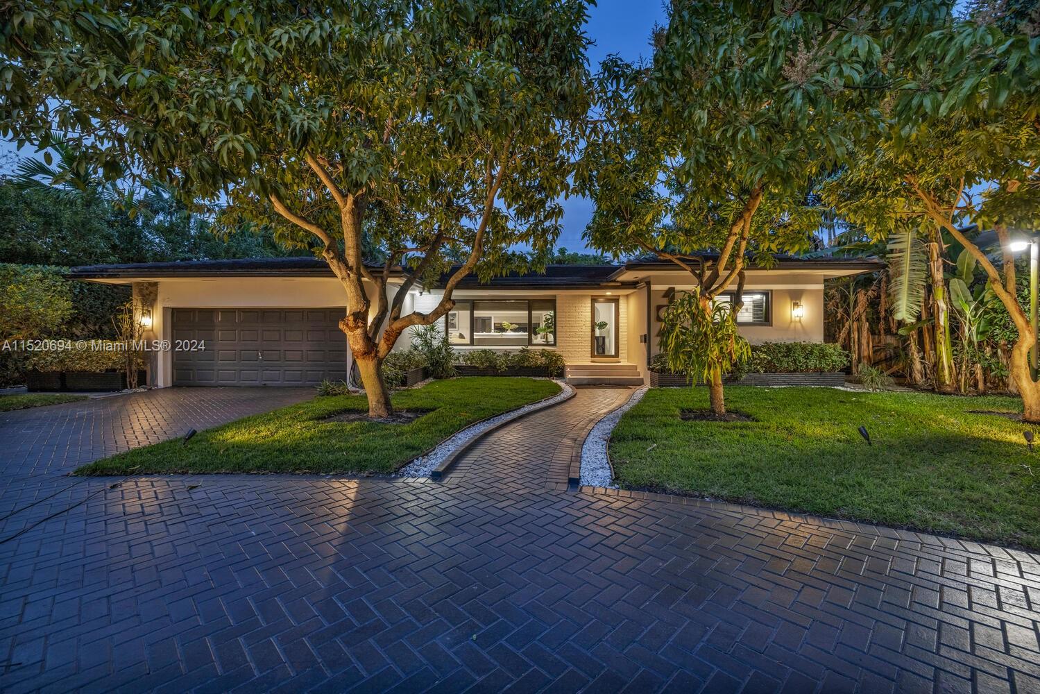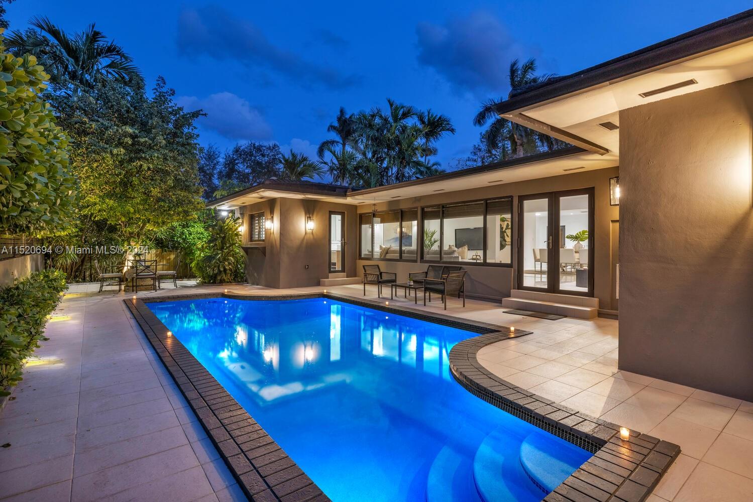 Welcome to Vila Brio! Come experience carefree luxe living in this beautifully updated sprawling mid-century modern designer pool home. Spectacular open-flow living, formal dining, grand media room and incredible double-sized custom eat-in dual-island gourmet kitchen with storage galore. Three spacious bedrooms in the main house, plus a fourth private entrance bedroom/legal in-law quarters with its own bath. Escape outside to the cleverly curated resort garden paradise with a sparkling pool, mature privacy landscaping, entertainment patios and space for relaxation. Totally turn-key: impact windows-doors; updated kitchen, baths, plumbing, electric, and porcelain tile floors; plus new A/C and pool equipment. All in Miami Shores' most prestigious neighborhood, on a quiet cul-de-sac