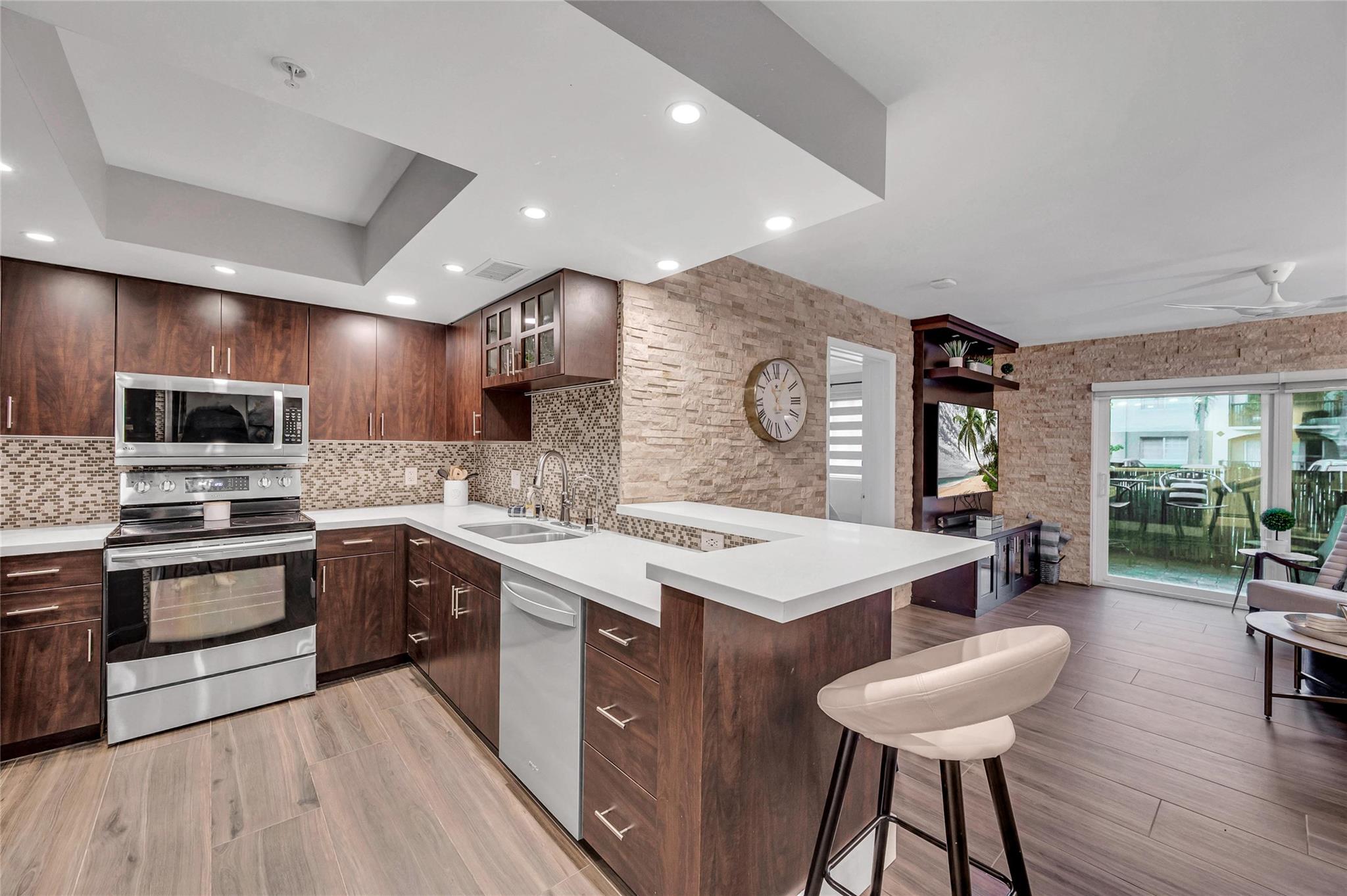 Rarely available and highly sought after 2BR/2BA condo in one of the few gated communities found east of US1, Village East! This ground floor, single-level, Royal Palm model offers the ambiance of single-family living with private laundry, a garden patio and an attached 1 car garage! Split floor plan includes an open living area with stone accent walls & tray ceilings along with an updated kitchen featuring stainless steel appliances, quartz countertops, gorgeous decorative backsplash as well as an abundance of new cabinetry! Impact glass throughout. Excellent eastside location just minutes from the airport, Port Everglades, Las Olas, downtown and the beach!