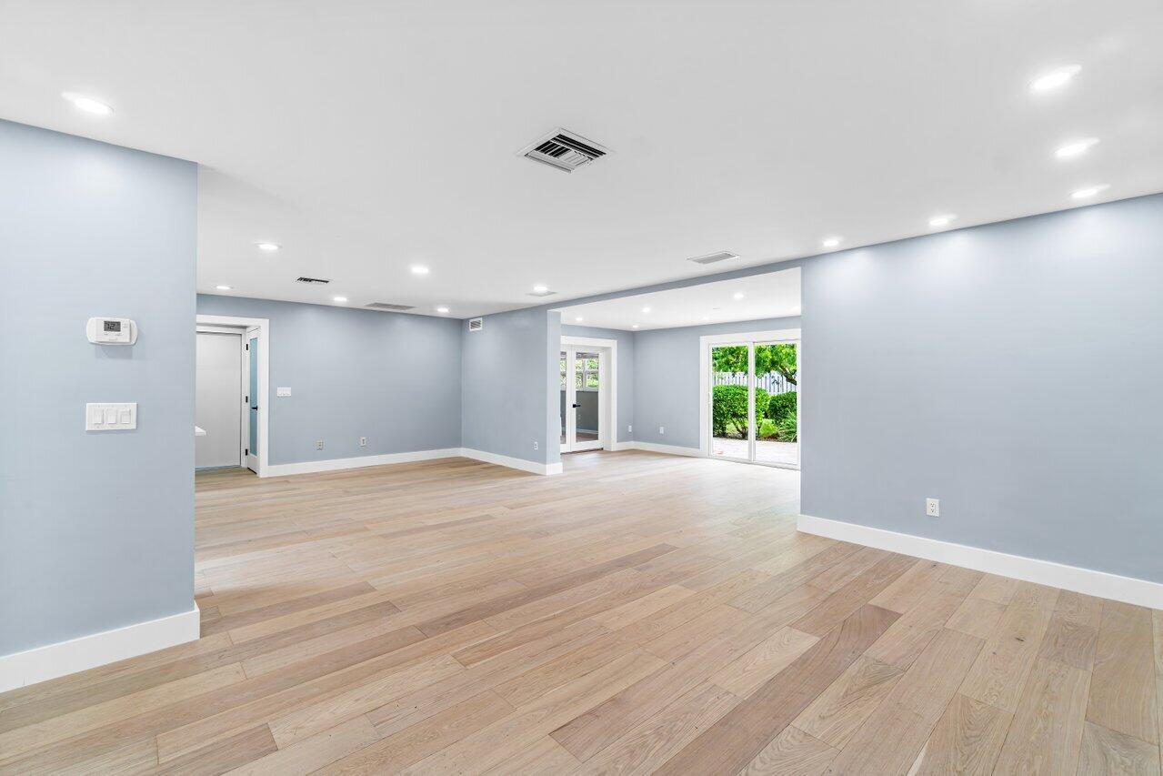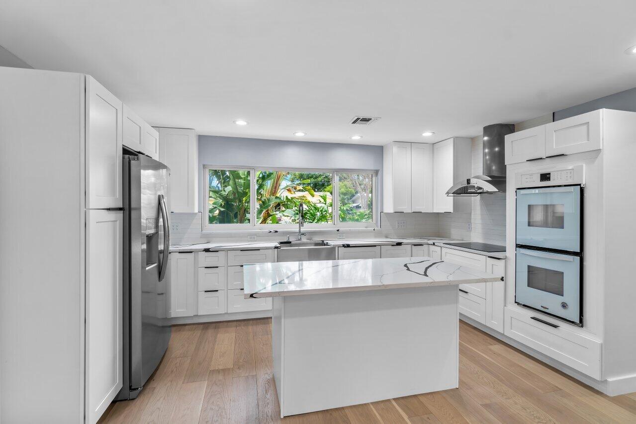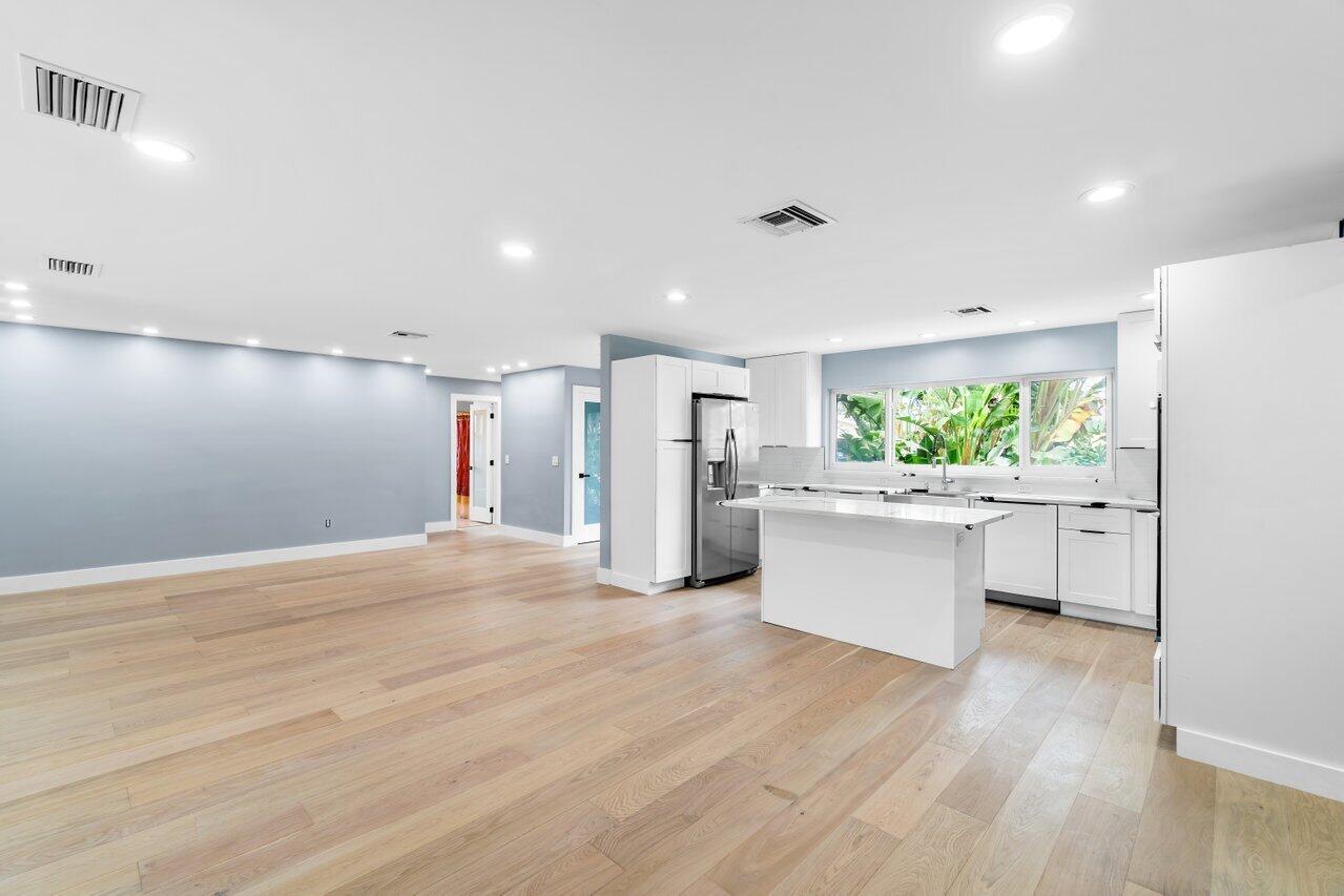 BOCA SQUARE GEM! One story ranch home with all NEW kitchen, shaker style wood cabinets, quartz countertops, stainless-steel appliances, double wall ovens, walk-in pantry and breakfast island. Features impact glass windows and sliding glass door, elegant wood floors in a light and bright open-concept design. Includes ALL NEW insulations, high hats, vents, interior doors, door hardware, washer, water heater and gutters. Internal laundry room for convenience. Spacious fenced in backyard, ideal for pool or lush garden. Near top rated public and private schools, beaches, shopping, entertainment. Prime location in East Boca Raton. Move in ready.