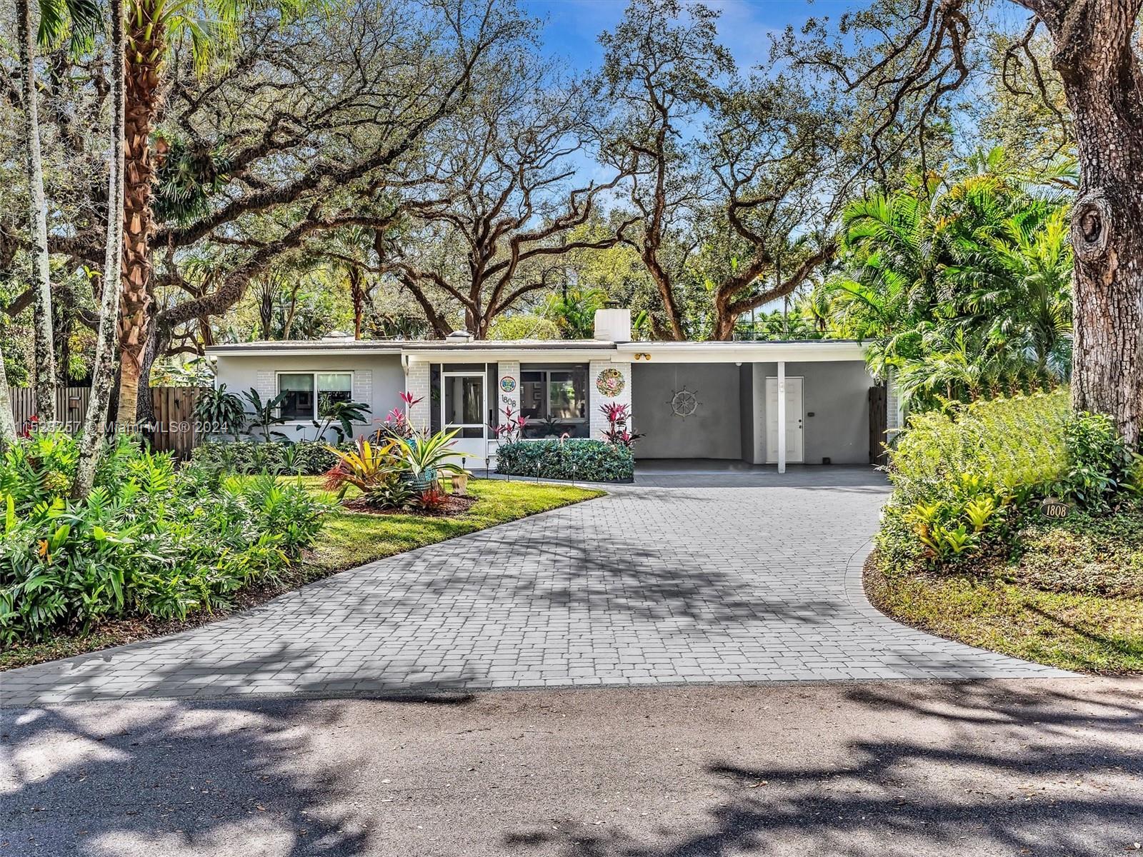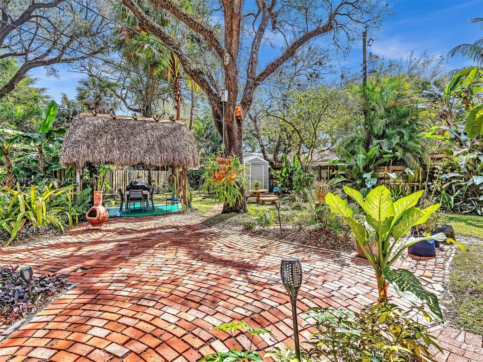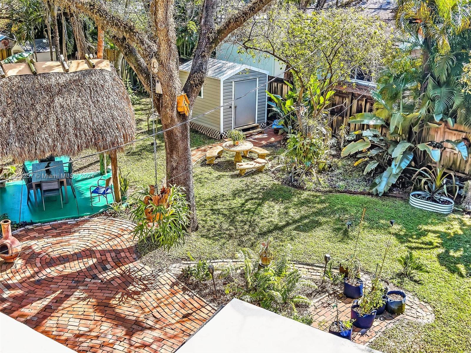 Peaceful and Inviting, this super clean 2 bed 2 bath home is upgraded and move-in ready! Extra large lot with majestic oak trees keep you cool. Unbelievable swirling brick pavers lead through the Fully Fenced Private Yard to your Tiki Hut and on to your 12' x 14' Storage Shed, both with electricity! Mature fruit producing mango, loquat and banana trees. Landscaping makes this oversized yard a Tropical Paradise! Plenty of room for a pool! New driveway pavers, covered carport, and front screened porch. 2022 Jaco Coated Roof and updated weatherproofing to chimney and high impact skylights. Newly painted, New Custom Cabinetry, Refrigerator and Gas Stove. Hurricane Impact Windows and Doors. Walk to Parks and Nature Preserve! Minutes to the Beach, Downtown, Transportation, and much more!
