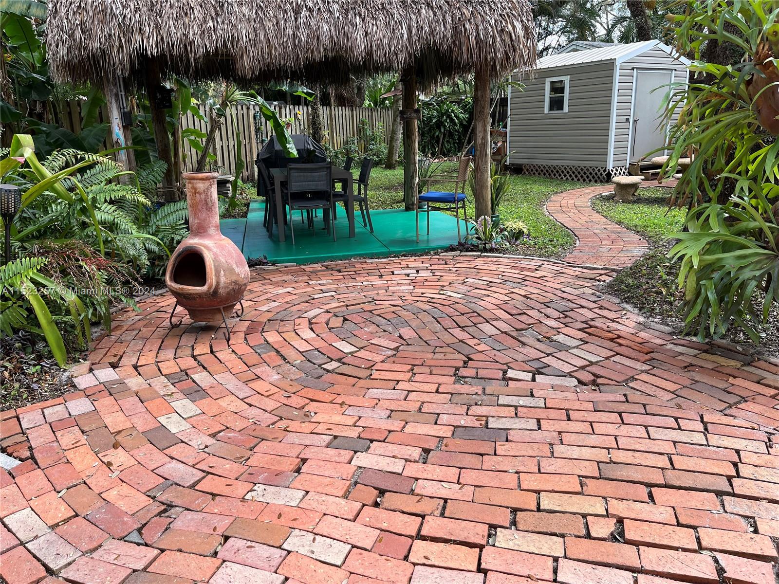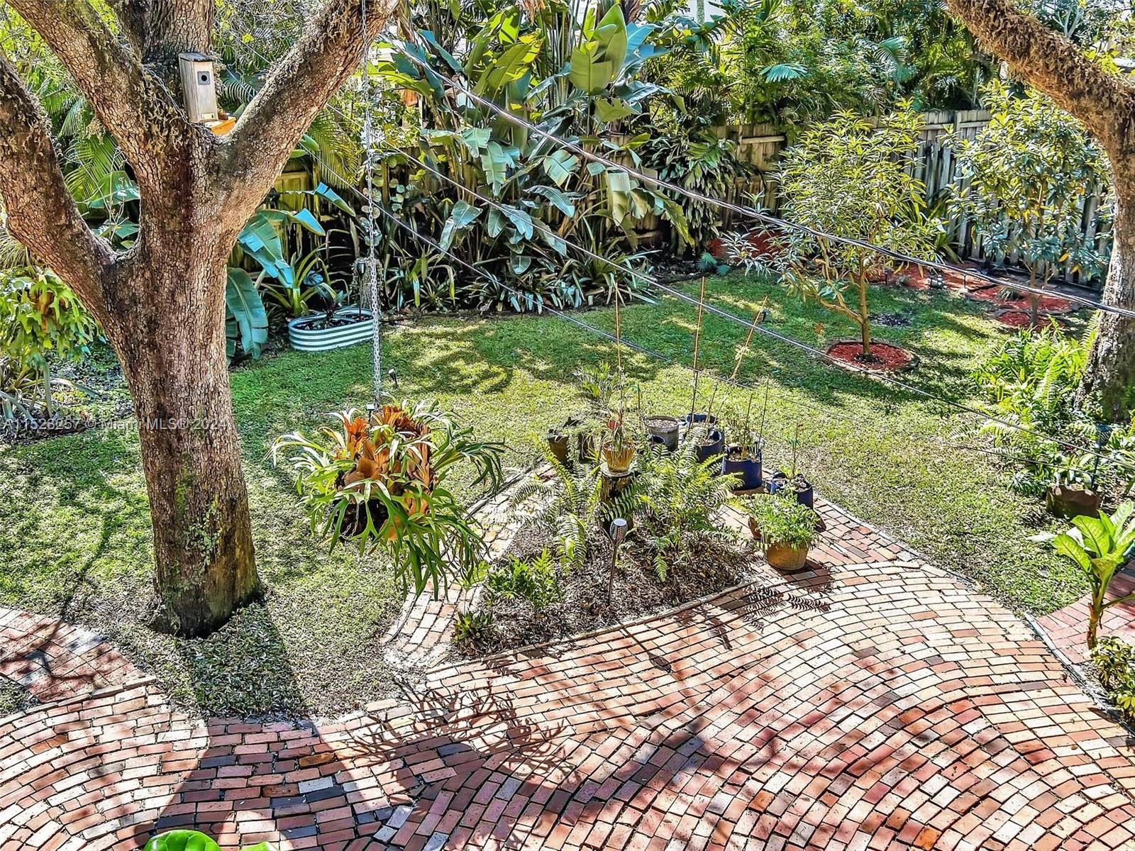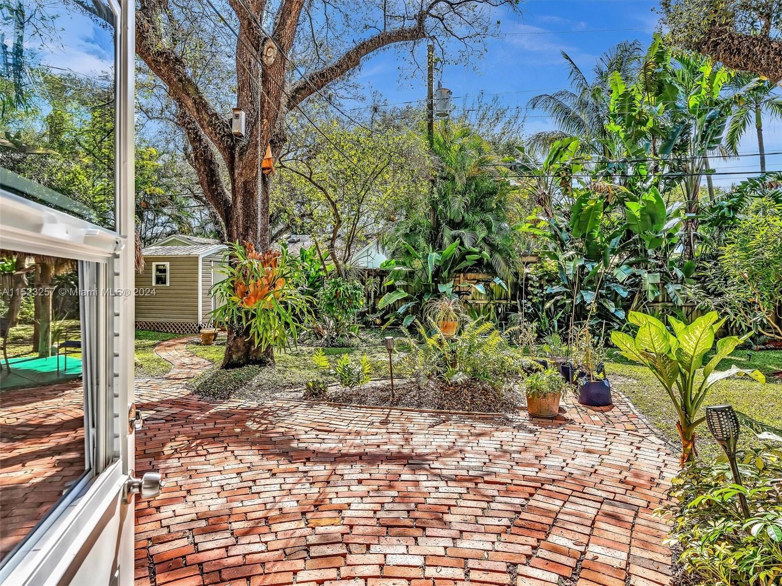 Peaceful and Inviting, this super clean 2 bed 2 bath home is upgraded and move-in ready! Extra large lot with majestic oak trees keep you cool. Unbelievable swirling brick pavers lead through the Fully Fenced Private Yard to your Tiki Hut and on to your 12' x 14' Storage Shed, both with electricity! Mature fruit producing mango, loquat and banana trees. Landscaping makes this oversized yard a Tropical Paradise! Plenty of room for a pool! New driveway pavers, covered carport, and front screened porch. 2022 Jaco Coated Roof and updated weatherproofing to chimney and high impact skylights. Newly painted, New Custom Cabinetry, Refrigerator and Gas Stove. Hurricane Impact Windows and Doors. Walk to Parks and Nature Preserve! Minutes to the Beach, Downtown, Transportation, and much more!