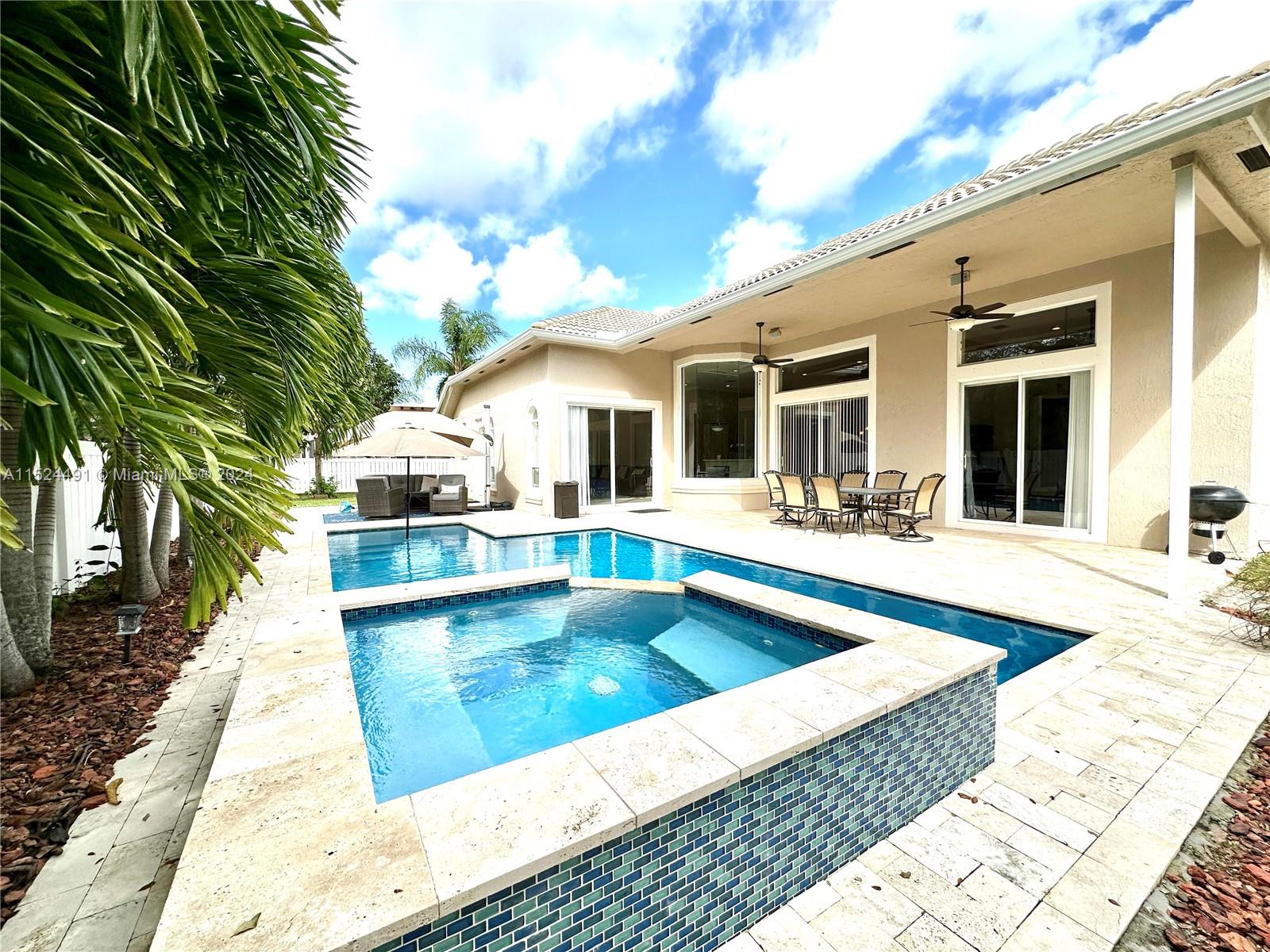 This is the one! This house is all about the lifestyle at Grand Reserve/Chateau. 24 hour manned guard gate. Stunning newer heated salt-water pool and spa, fencing and professional landscaping. HUGE LOT 10,202SF. Grand Reserve/Chateau-biggest lot sizes. Unique-private gate access to the park, walk your kids to school & save 2 hours from car line! This home has a triple-split floorplan, ideal multi-generational with 5 bedrooms, 3 bathrooms, 3 car garage with room for 6 cars in the driveway! Upgraded travertine and wood floors throughout the house, neutral paint colors, high ceilings, huge master bathroom & bedroom suite with slider out to back patio/pool! Huge open kitchen/family room for entertaining, center island, counter bar, stainless steel appliances. RECENT PRICE ADJ, BEAT THE RUSH