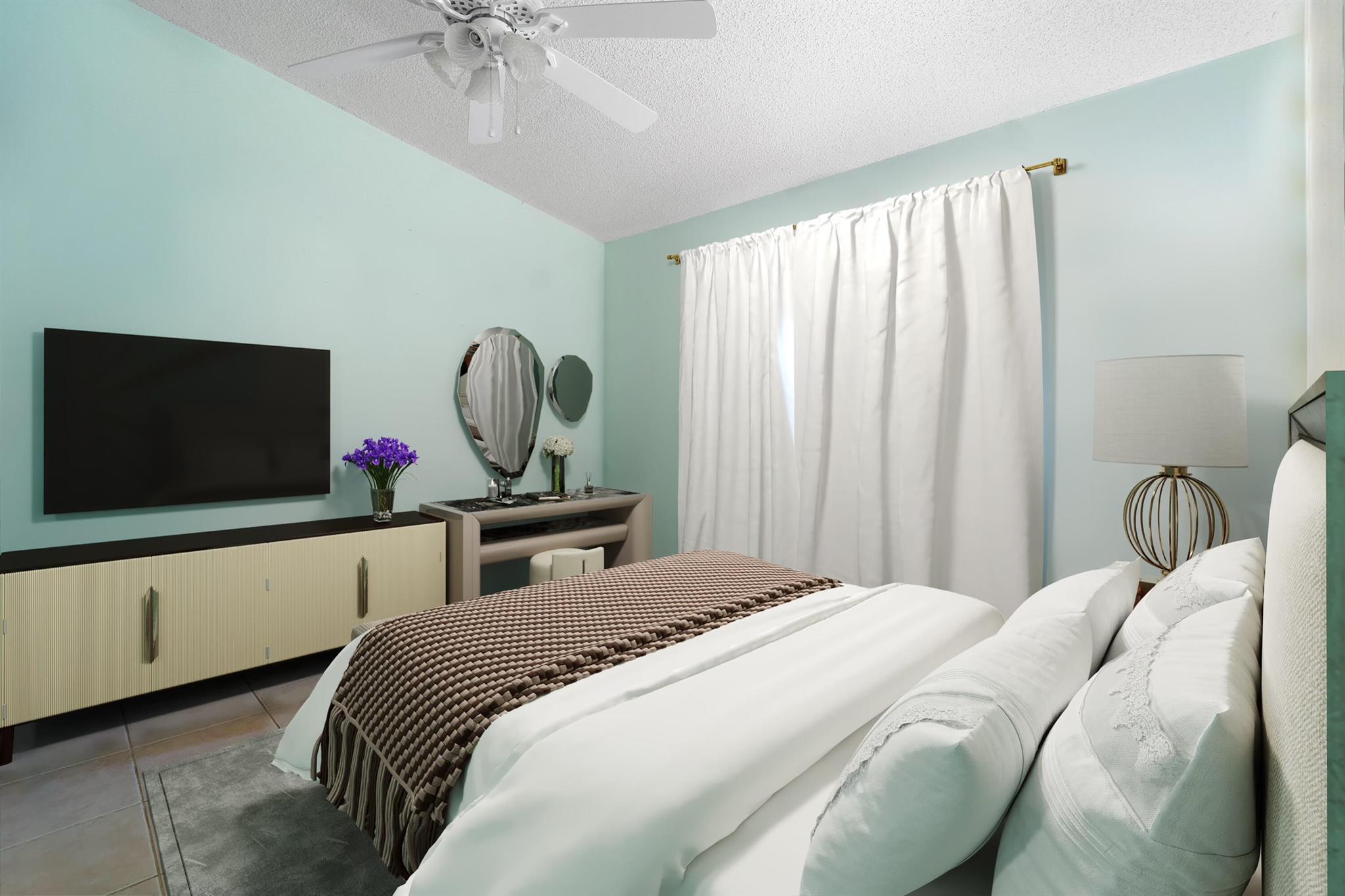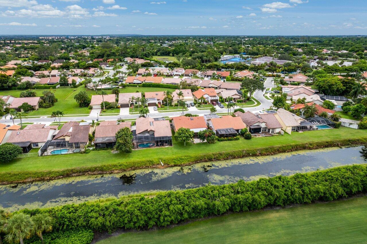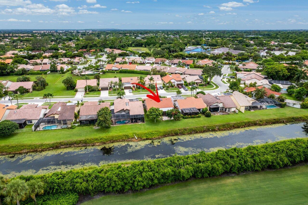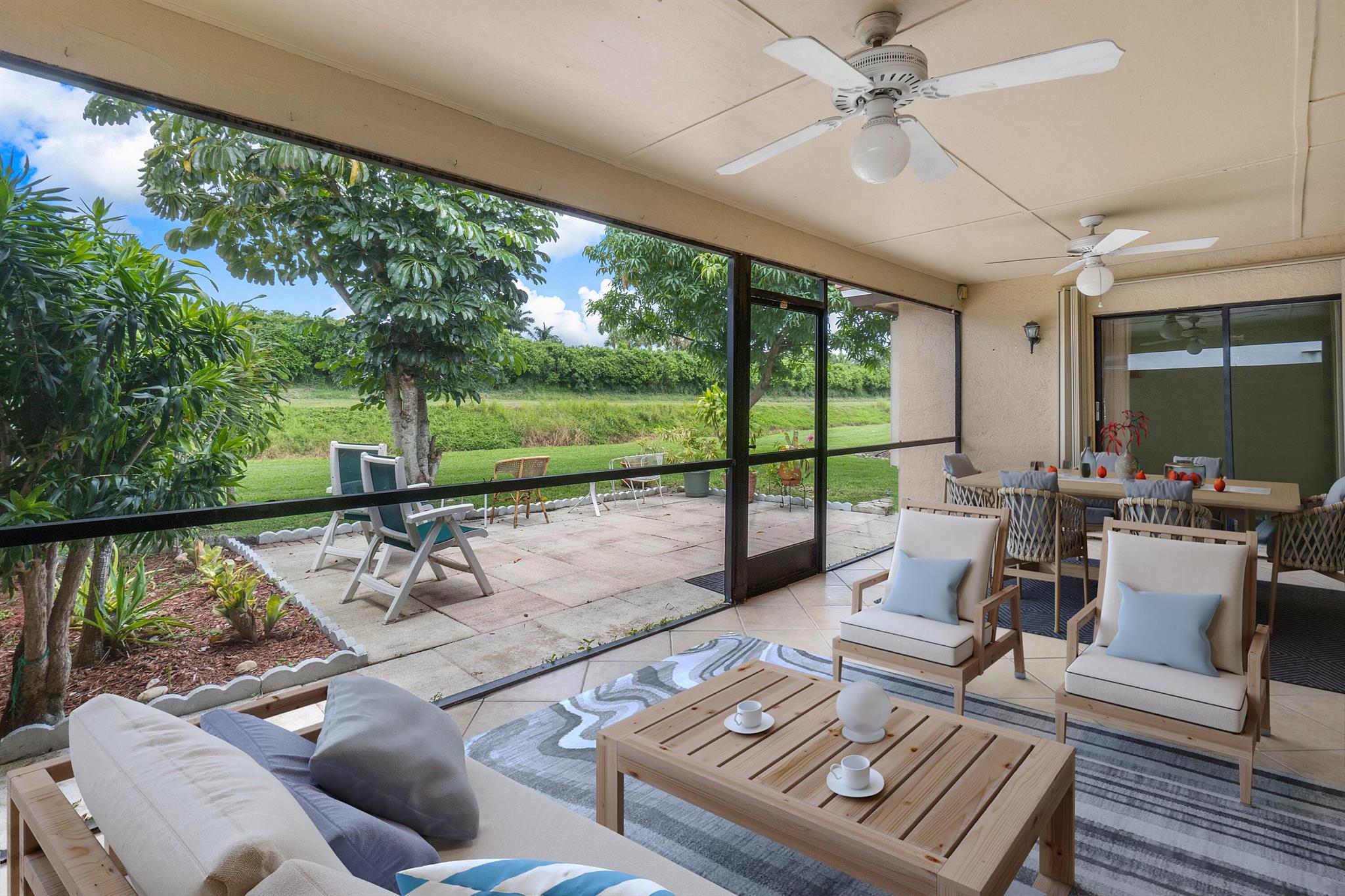 Located at 7586 Solimar Circle in Boca Raton, this beautiful 3 bedroom, 2 bathroom home has 1,578 square feet of tiled living space and boasts upgrades that make it an easy choice for a family home. This home oozes curb appeal. Its arched entrance and tiled veranda framed by landscaping brings you in through double doors, and once inside, you are drawn to the high volume ceilings and spacious living/dining area. The home features an oversized kitchen with a stainless-steel appliances and a charming view of the lush landscaping outdoors over the split-sink. Through sliding glass doors, you'll find the home's tiled, oversized patio that overlooks a large parcel of land outfitted with mango trees and views of the canal.