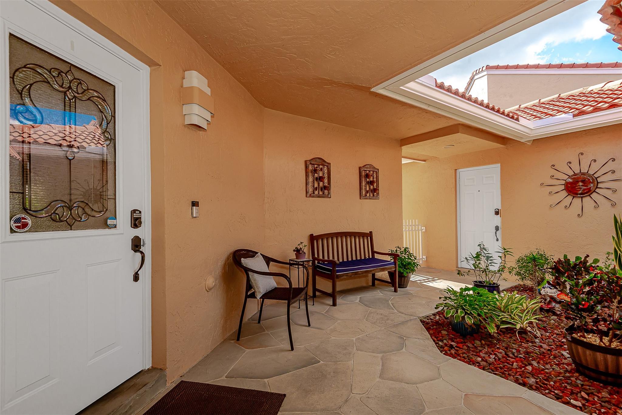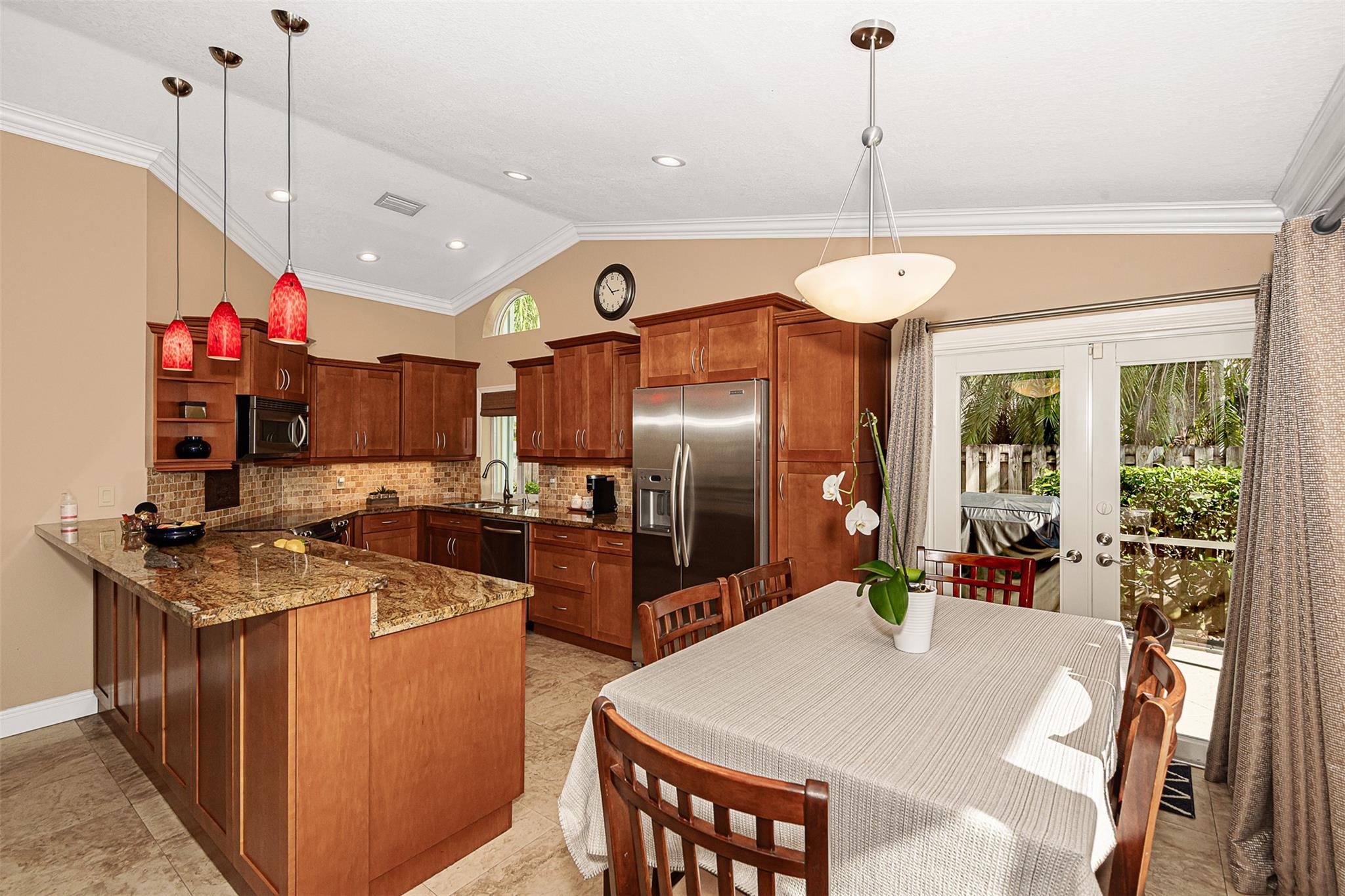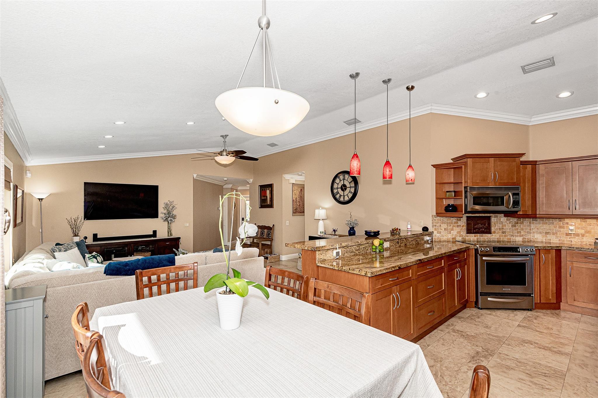 Move in condition, with expanded, remodeled kitchen with tall cabinets w/pull outs, granite counter tops, KitchenAid stainless steel appliances. Upgraded bathroom vanities. 20" porcelain tiles and 6" baseboards. Crown molding throughout main living area. The following were installed or replaced 2023: impact skylight, impact widows and door, impact overhead garage door, exterior of home painted. In 2000-2002: water heater, Craftsman garage door opener, accordion shutters. Interior doors and hardware updated. Open floor plan and split bedrooms. Custom closets in all bedrooms. Oversized, fenced backyard features sprinkler system and various plants, plenty of room for dogs and swing sets. 600 sq. ft. screened patio. 6x10 shed included. 2 car driveway. Only 3 bedroom Garden Home available.