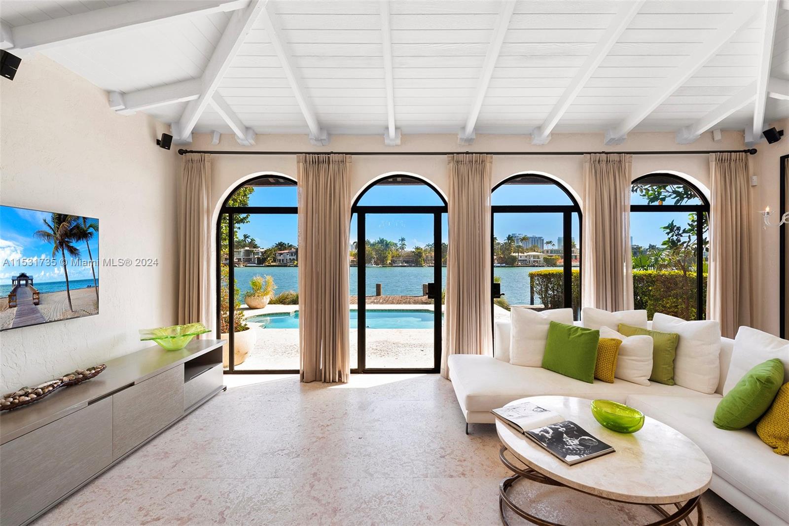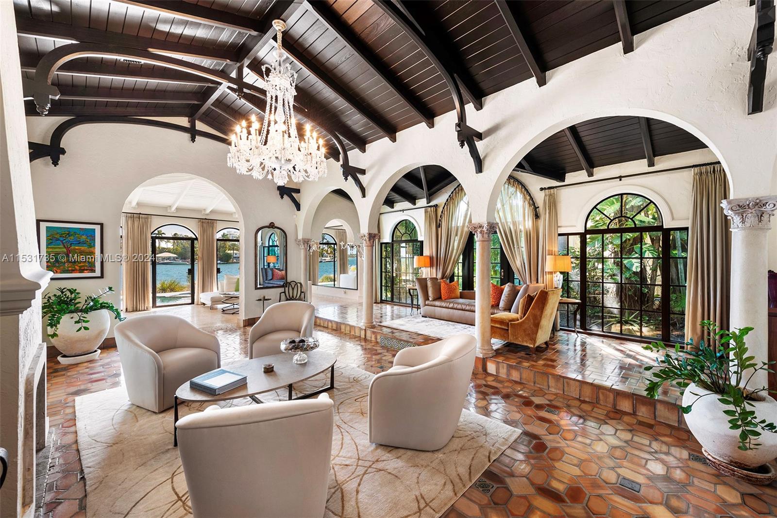 “El Escape” – an Italian Villa nestled within the lush Venetian Islands features stunning, original architectural details and panoramic vistas of Biscayne Bay from every angle! Step inside to discover majestic living spaces with soaring cathedral-beamed ceilings, oversized arched windows and doorways, fireplace, and original Arabesque tile floors. Oversized primary suite with modern bath, gourmet kitchen, family room, 3 beds in main house, “secret room”, guesthouse, and a 2-car garage awaiting discovery! Enjoy the tropical scenery of Venetian Islands and glistening water views from your secluded backyard! This home is a hidden tropical retreat offering a sanctuary for relaxation and entertainment, and ideal central location with access to all the wonders of Miami’s vibrant landscape.