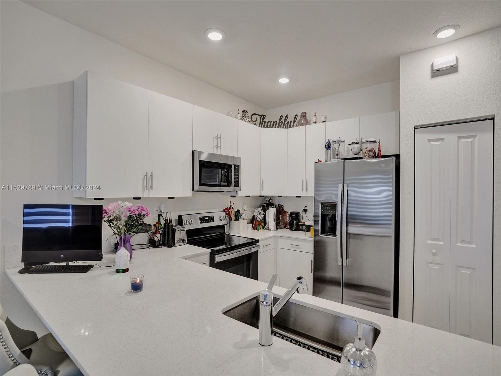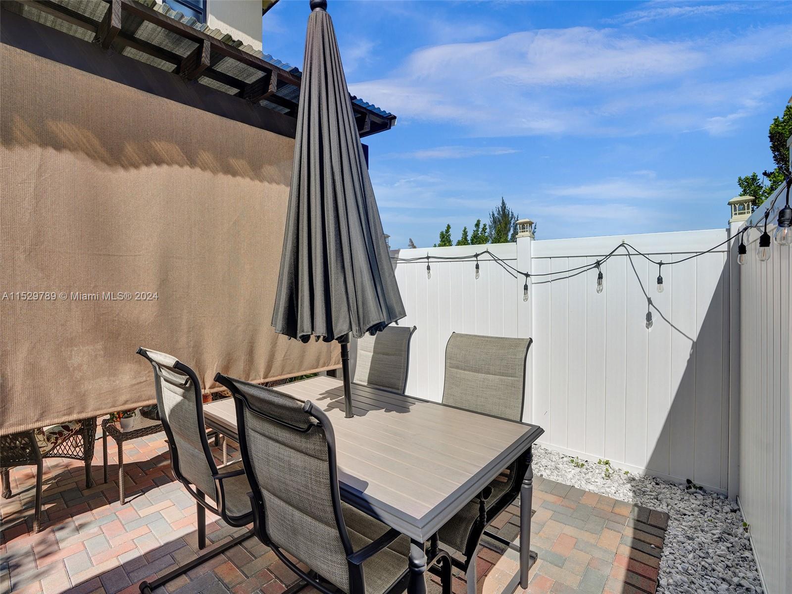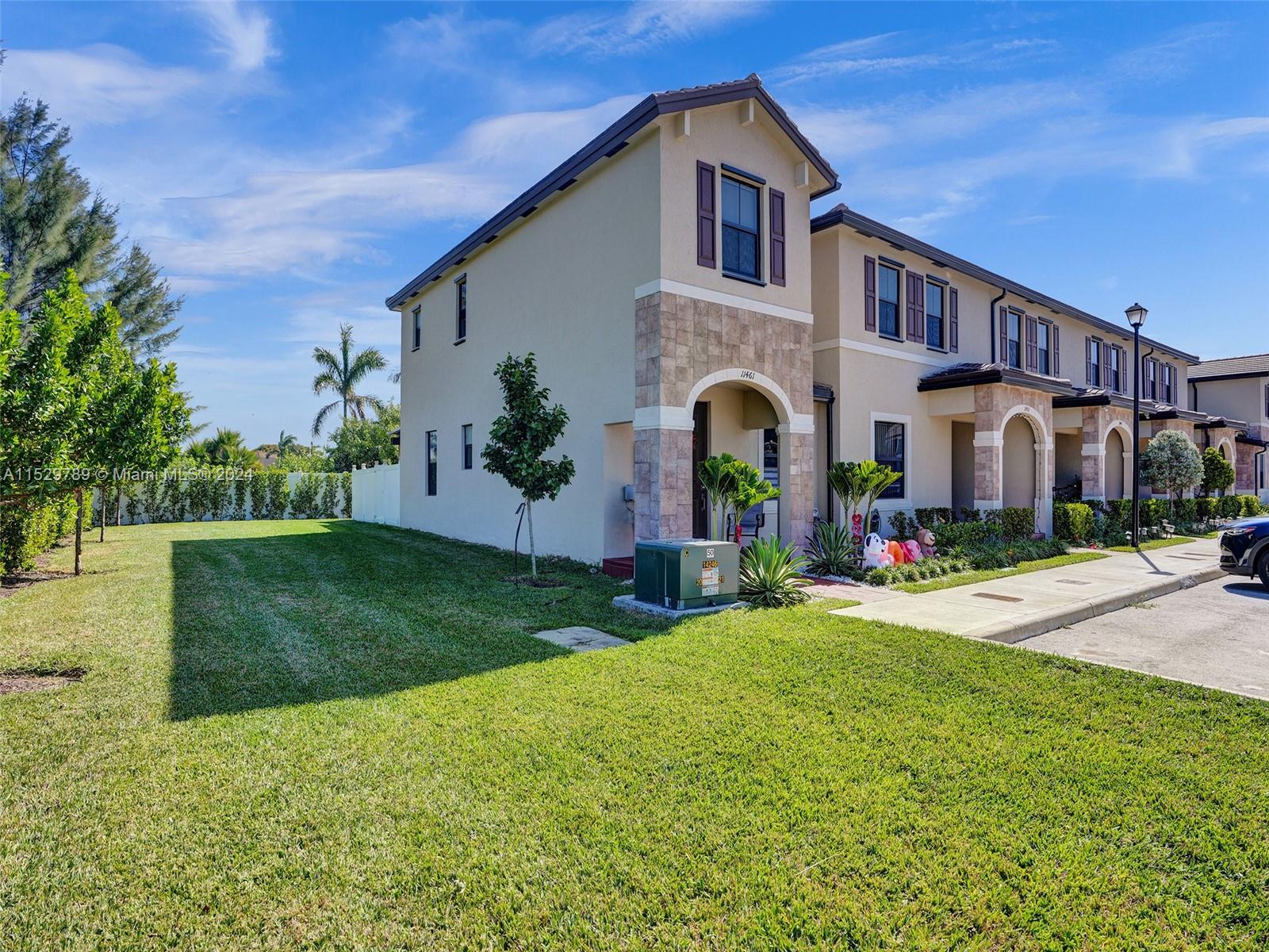 This meticulously maintained 2-story townhouse, ideally situated on a corner lot at the back of the complex, offers the perfect blend of comfort and privacy. Sleek quartz countertops elevate the kitchen, adding a touch of sophistication. Upgraded wood-like flooring on stairs adds a touch of elegance and enhances durability. Upgraded cabinet vanity in half bathroom. Private patio adorned with pavers and a charming pergola creates an inviting space for al fresco dining, stargazing, or simply soaking up the sunshine. Custom blinds, curtains, shed, and washer/dryer combo will remain with the property. Enjoy the benefits of this newly built gated community style living and all the amenities, such as pool & spa, full fitness center, game room, party room & clubhouse, tot lot & kid's splashpark.