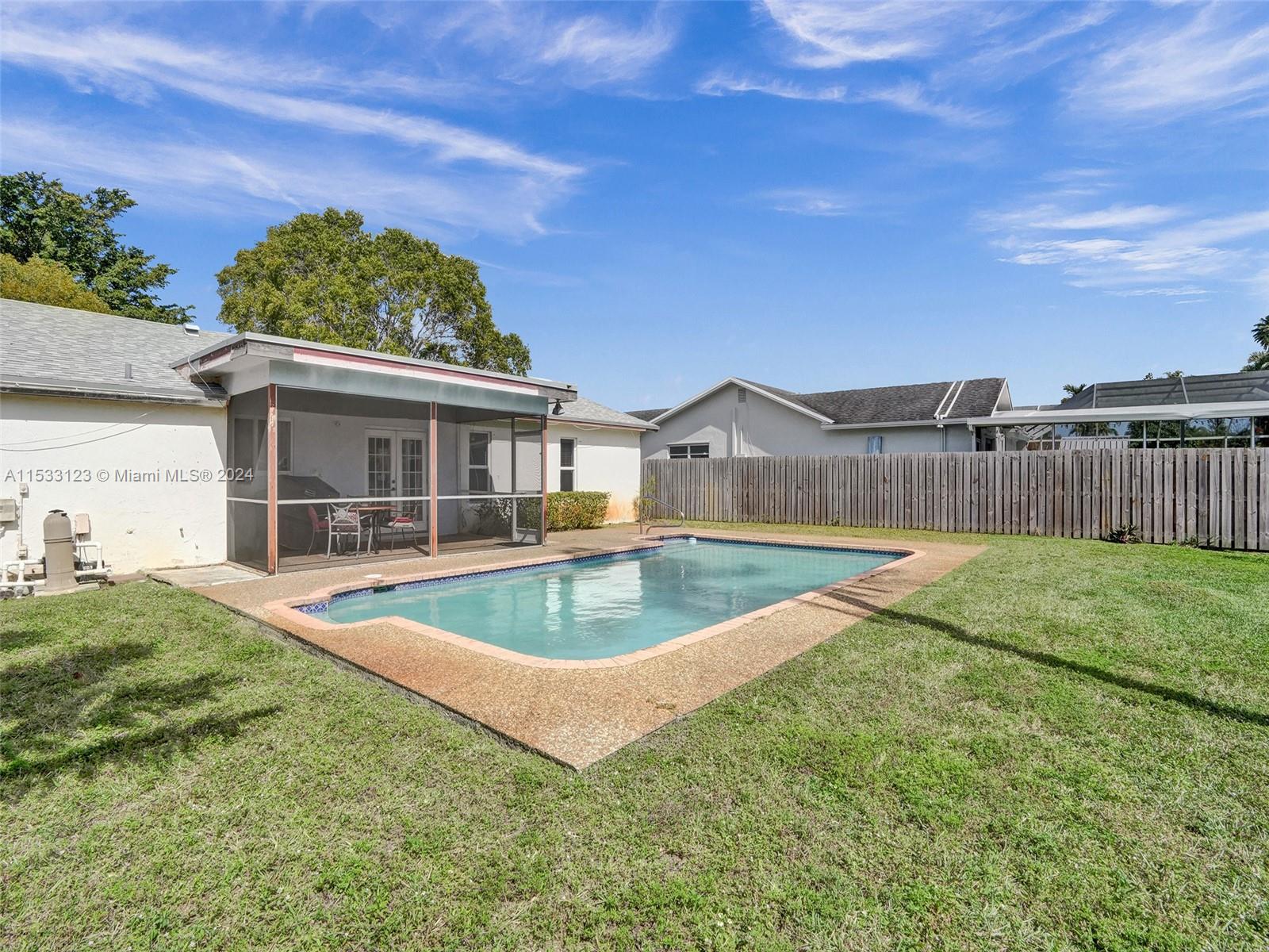 This 3 bedroom, 2 bath single story home located in Sunrise, FL offers ample room for entertainment and comfortable living. Perfectly situated on an oversized lot, this home boasts a sprawling backyard, sparkling pool, covered patio, and delicious fruit trees. This home offers tremendous potential to customize and create your perfect home. Enjoy efficient parking with the circular driveway and 1-car garage. Selling AS-IS condition. No HOA. Roof and A/C replaced in 2020. Impact windows and front door installed 2021 adding enhanced energy efficiency. Sawgrass Mills Mall is minutes away. Come quickly to secure this gem and imagine the possibilities!