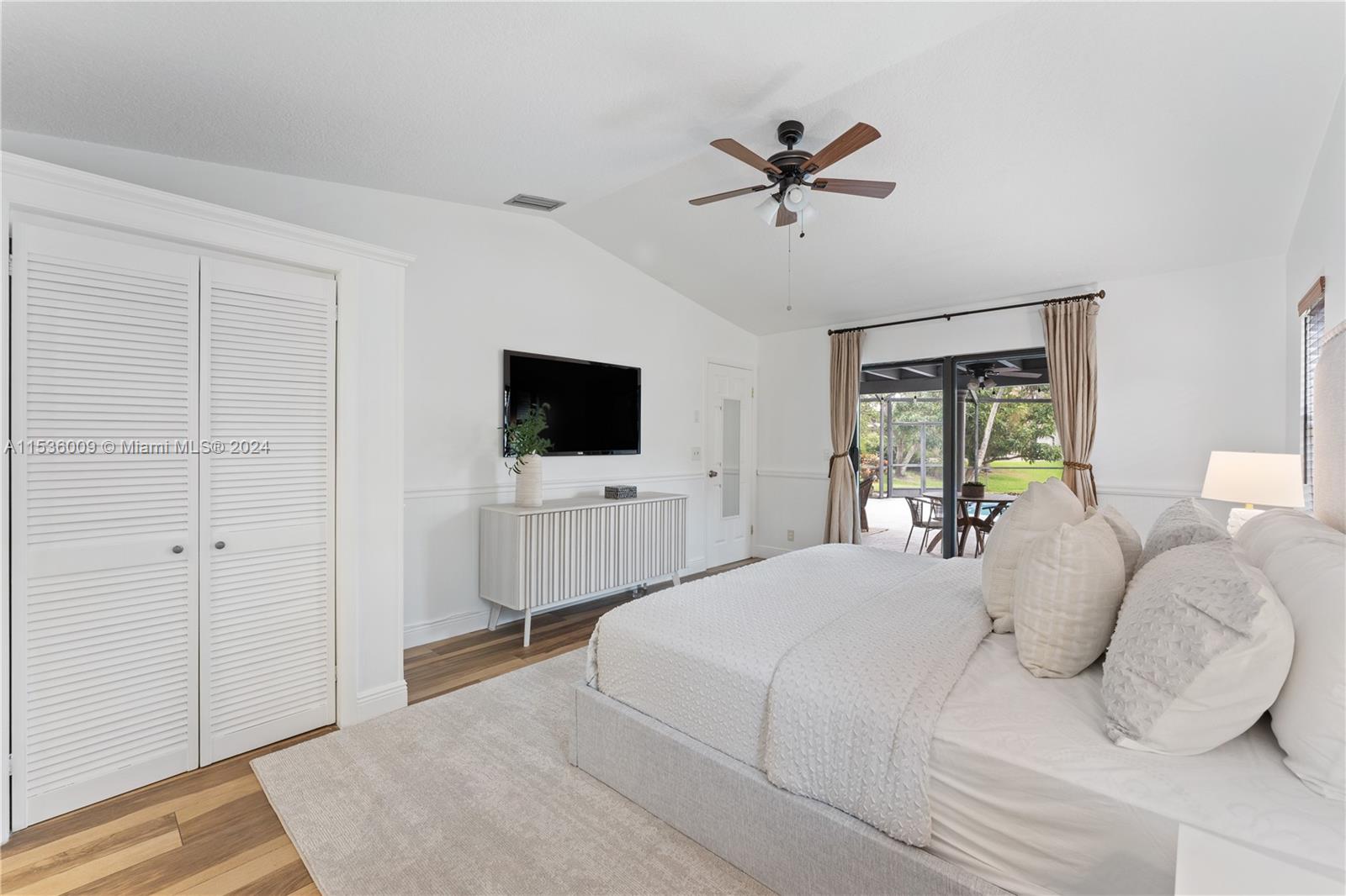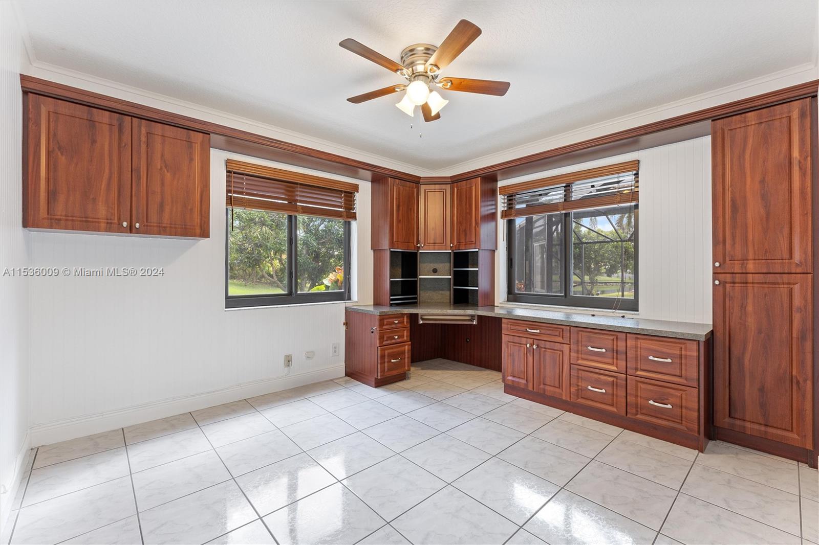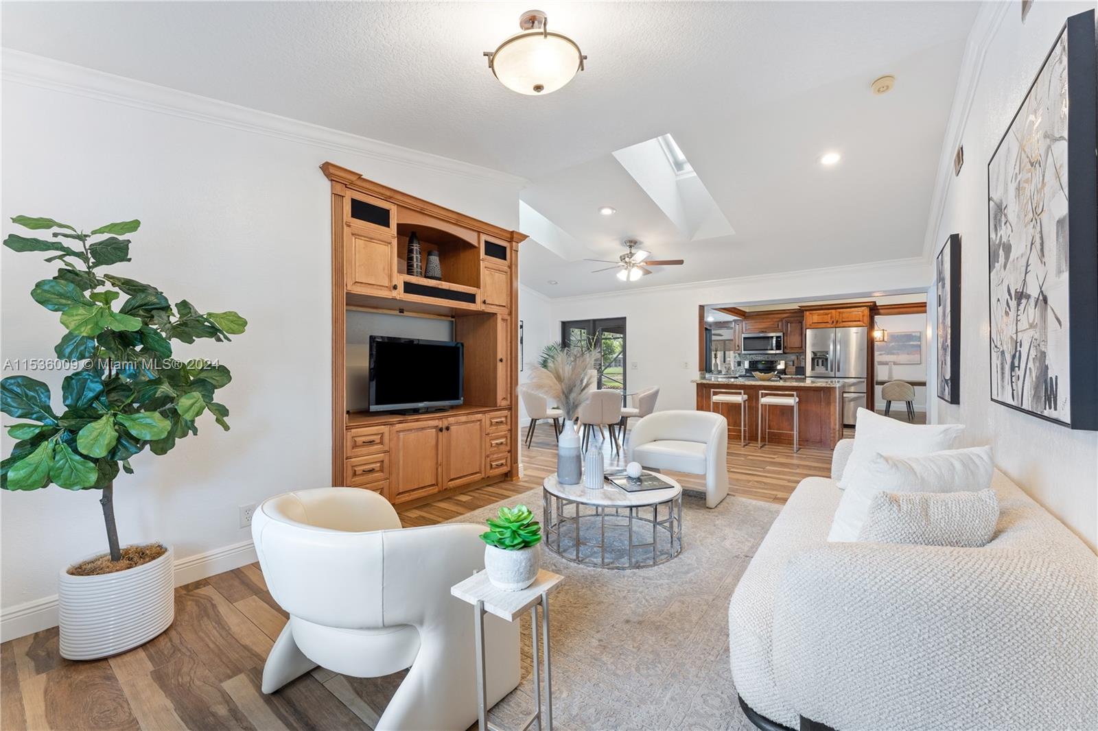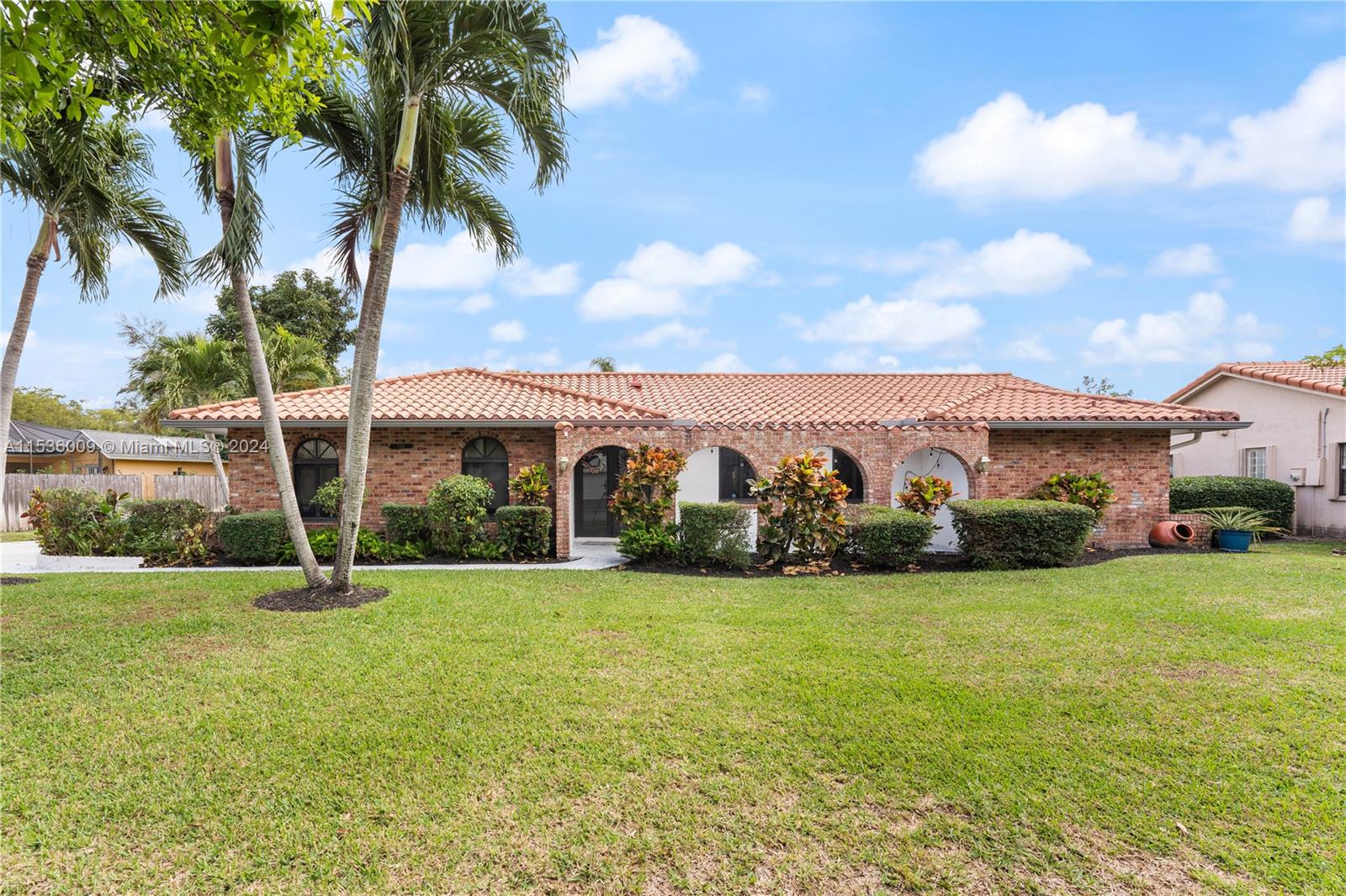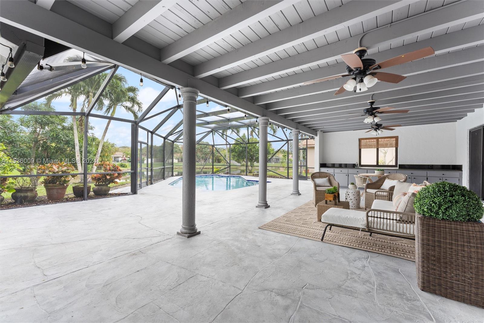 Experience luxury in this meticulously maintained ranch-style home in prestigious Jacaranda Lakes. With four bedrooms and three full bathrooms, the residence offers comfortable living space and breathtaking water views. The updated custom kitchen features incredible storage, space and top-of-the-line appliances. Updated bathrooms add sophistication and skylights offer ample natural light, illuminating tile floors throughout. Impact windows and doors enhance security and energy efficiency. The pool, nestled in a screened lanai, overlooks the serene lake, complemented by a built-in bar/outdoor kitchen area, perfect for entertaining. Centrally located near shops, dining, entertainment and the renowned American Heritage School, this upscale gem with a thoughtful design awaits its new owner!