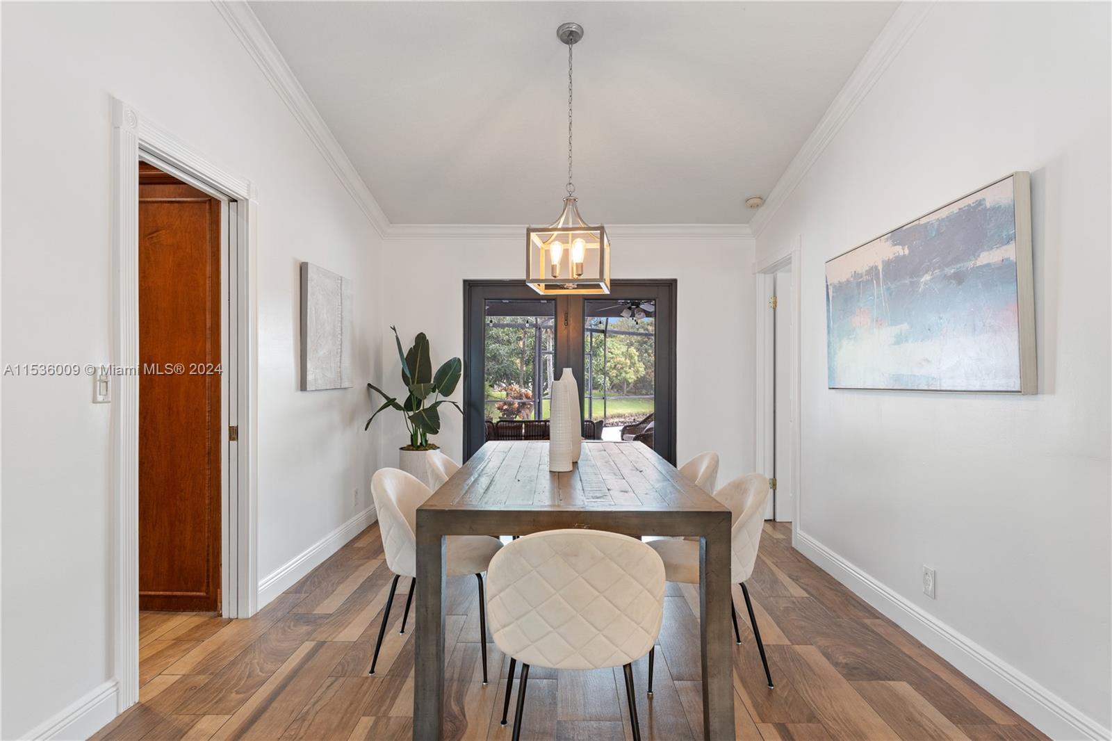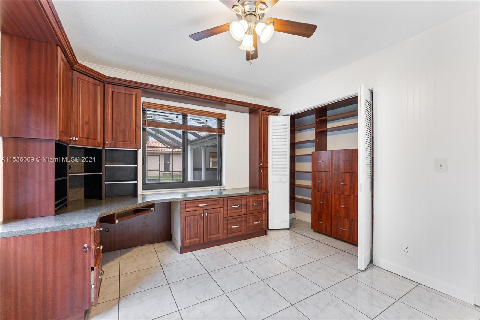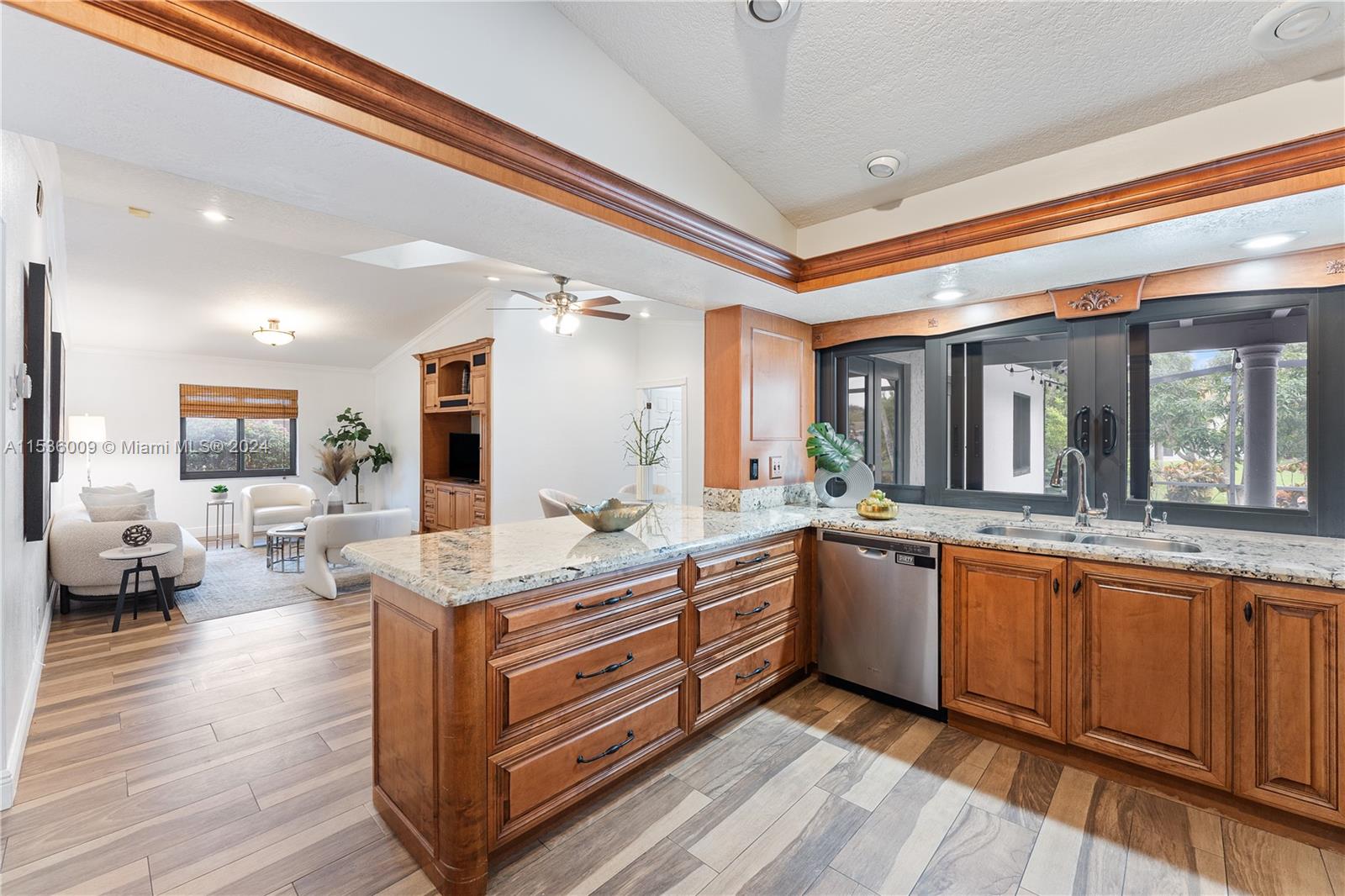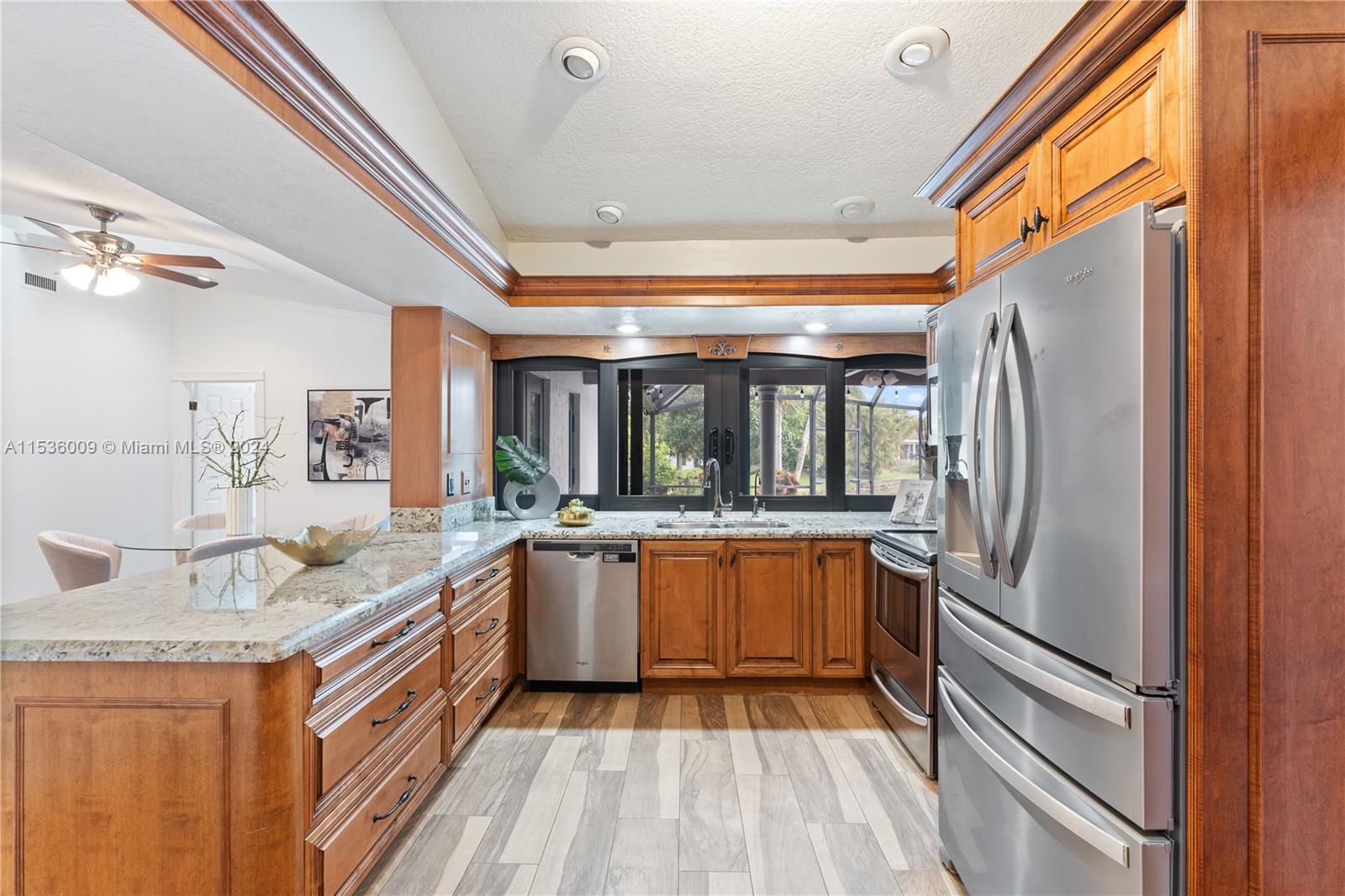 Experience luxury in this meticulously maintained ranch-style home in prestigious Jacaranda Lakes. With four bedrooms and three full bathrooms, the residence offers comfortable living space and breathtaking water views. The updated custom kitchen features incredible storage, space and top-of-the-line appliances. Updated bathrooms add sophistication and skylights offer ample natural light, illuminating tile floors throughout. Impact windows and doors enhance security and energy efficiency. The pool, nestled in a screened lanai, overlooks the serene lake, complemented by a built-in bar/outdoor kitchen area, perfect for entertaining. Centrally located near shops, dining, entertainment and the renowned American Heritage School, this upscale gem with a thoughtful design awaits its new owner!