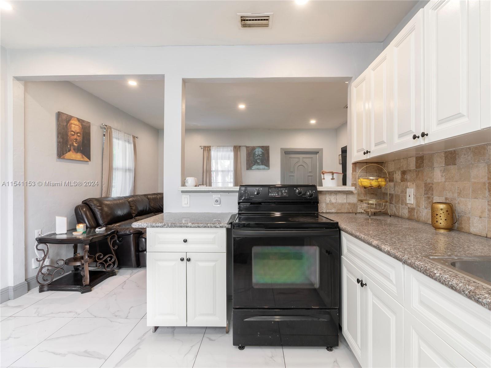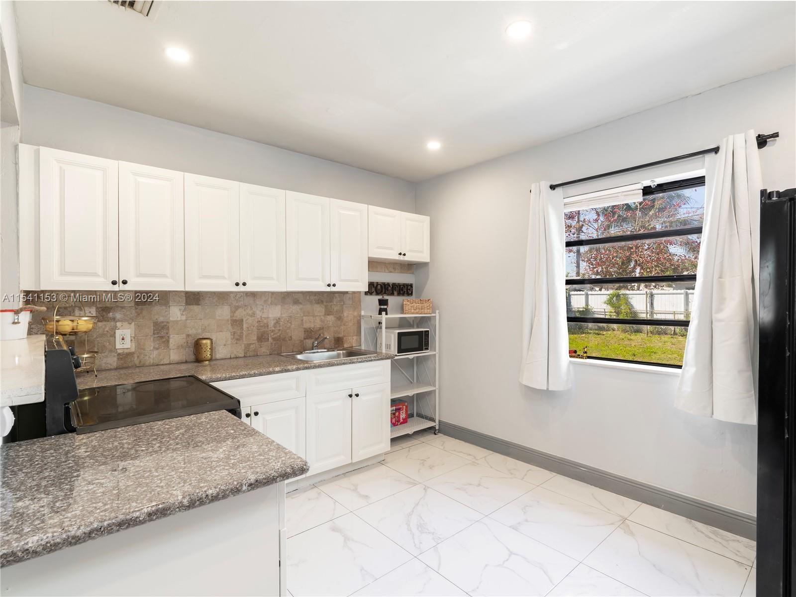 Welcome to your new home in Fort Lauderdale! This property catches your eye with its modern look and sits on a big lot, giving you plenty of space for a dream backyard. It features a freshly updated kitchen with white cabinets and black appliances, and marble tile floors all through the house. The bathroom is also newly renovated with gray tiles and a black vanity. The house has a great layout and is filled with natural sunlight, making it feel cozy and welcoming. There's an attached carport, which is great for parking your car or for hosting outdoor fun. This home is ready for you to move in and make it yours!