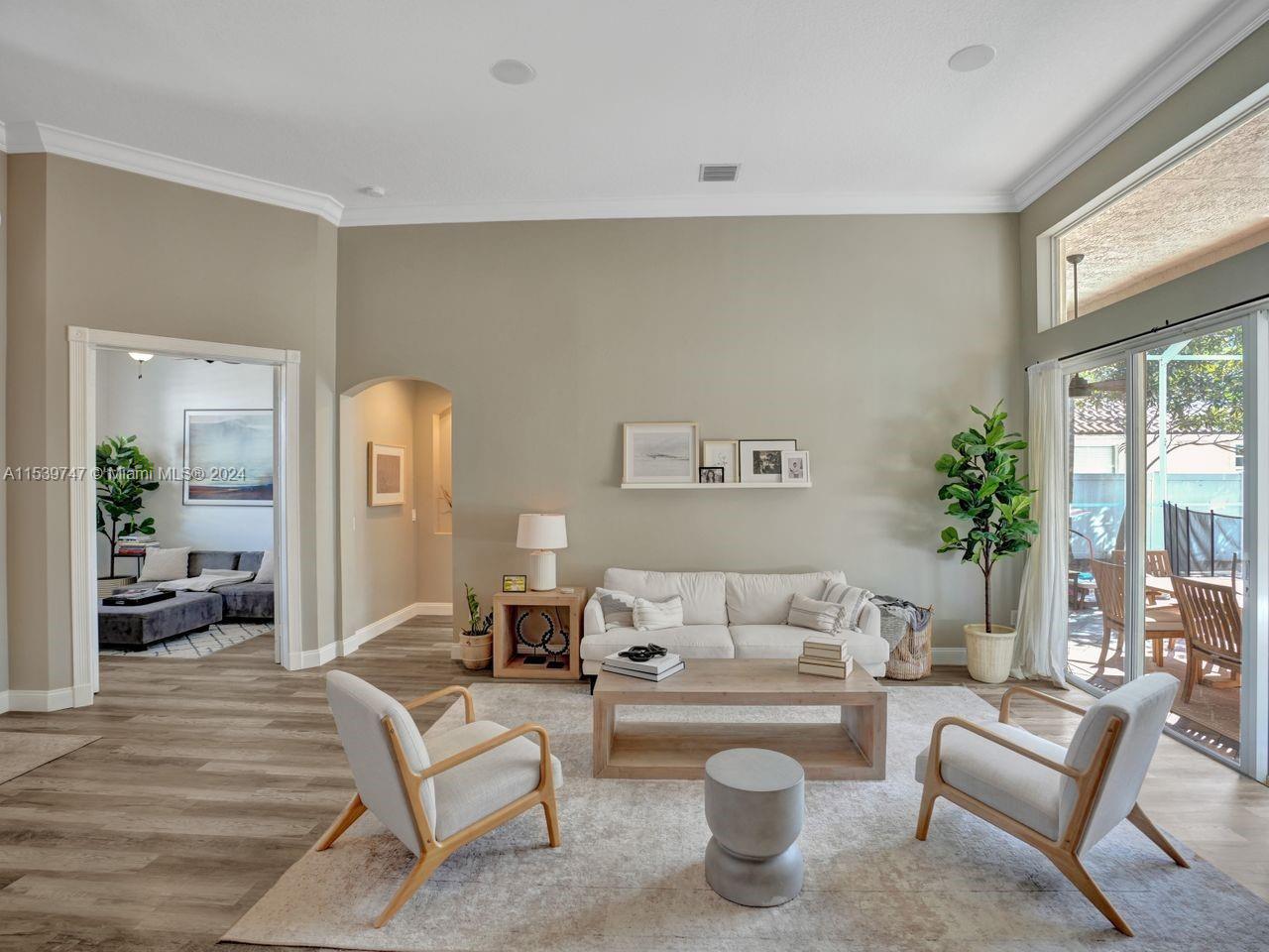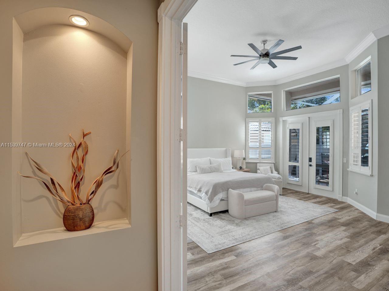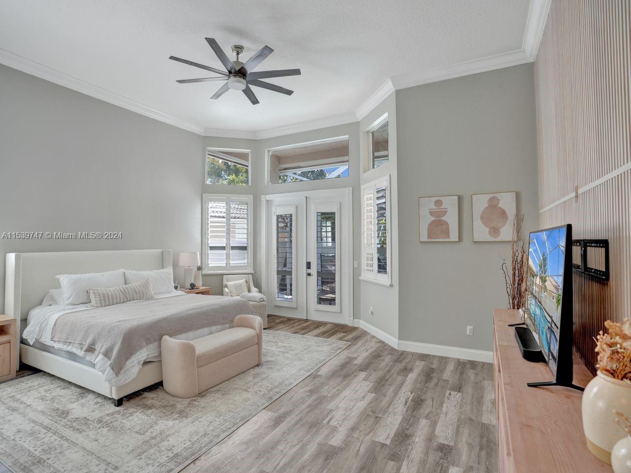 Behind the gates at Crystal Cove Estates is your new pool home. Tastefully updated, designer finishes. 3000+SF, 1/4 acre lot, triple-split floorplan w/no neighbors behind. 4BR w/5BR used as office/3BA. Step inside foyer, seamless luxury vinyl providing warmth of wood w/o maintenance. Plantation shutters & crown molding add classic charm. Primary suite-wood accent wall, new AC, 2 walk-ins, jacuzzi & open shower. Chef's kitchen boasts island, counter bar & dining area. New appliances. Laundry room w/new W&D, sink. 3-car garage, Sonos pre-wired. Outdoor space fully fenced-in w/pool & spa, baby gate & turf backyard. Only 30 homes in community. Make the most of this rare opportunity to experience West Boca Raton living at its finest. Shops, parks & more nearby. A-rated school district.