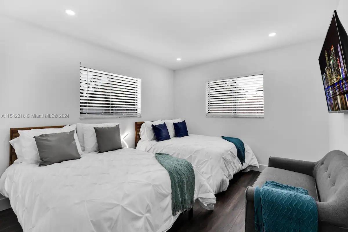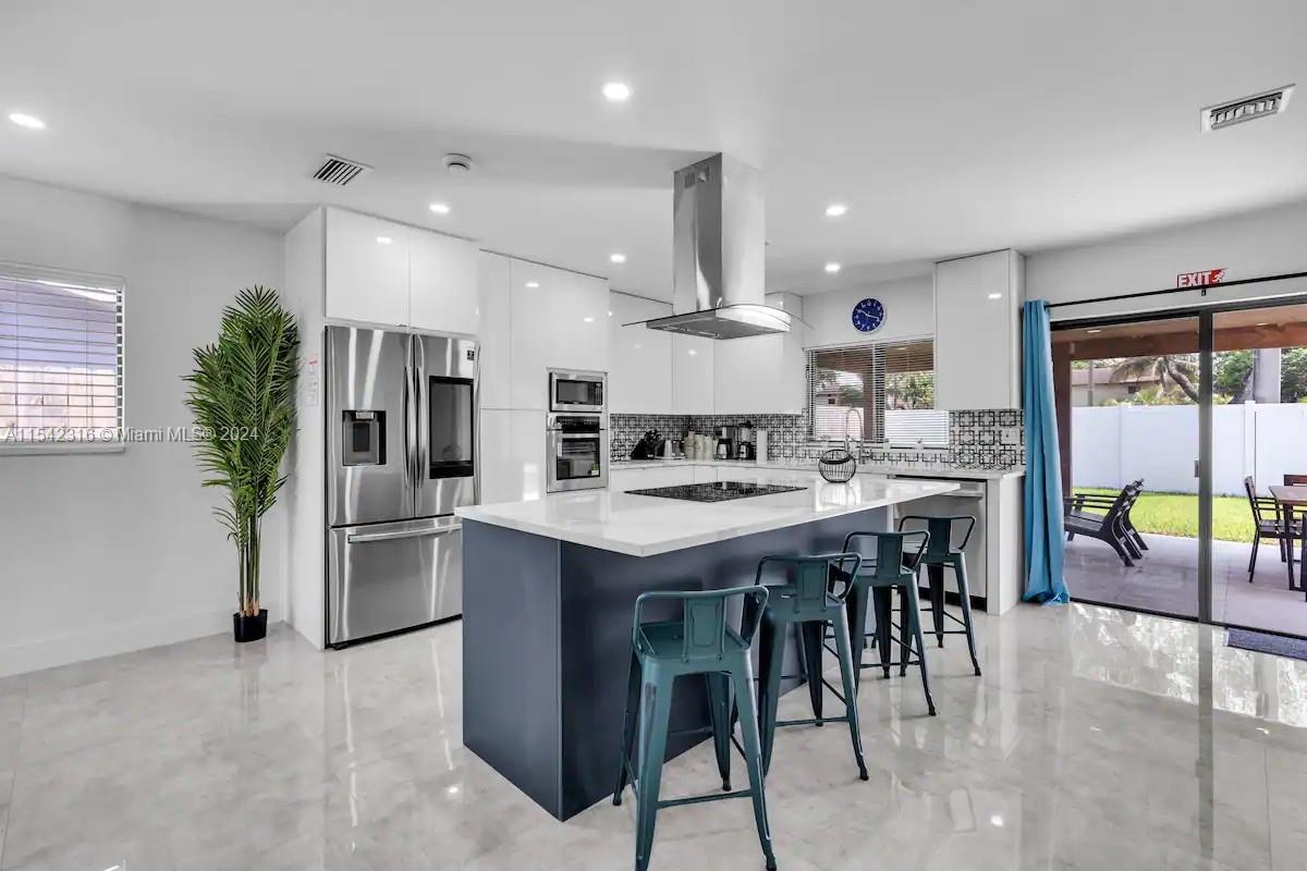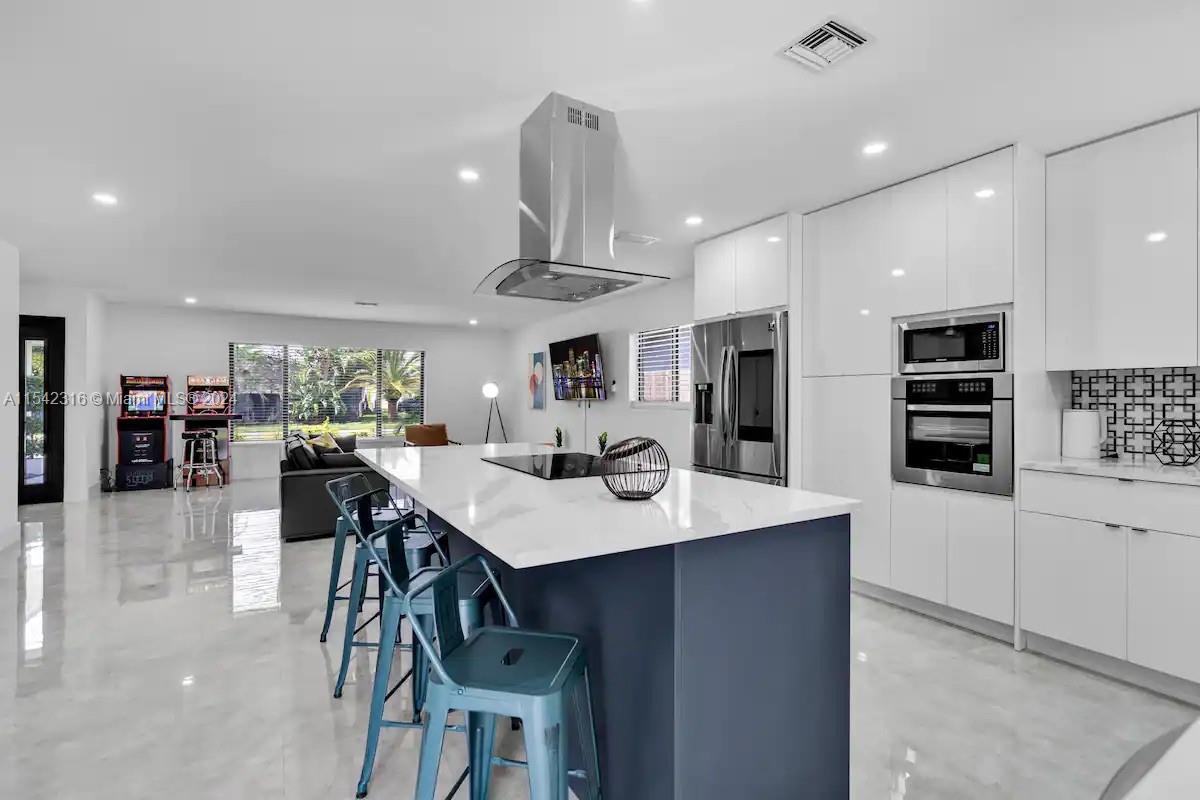 Welcome to a stylish haven with four bedrooms, each featuring plush bedding and Smart TVs. The primary bedroom has a king-sized bed, private ensuite, and an office desk, while the second bedroom offers a queen-sized bed with a Smart TV. Bedrooms three and four have two full-sized beds and a bunk bed with twin-sized beds, respectively. The two full bathrooms offer comfort with high end finishes. The well-appointed brand new kitchen has high end stainless appliances, ample counter space, and all culinary essentials. The living room, styled with a modern sofa, Smart TV with Xfinity Stream, and two arcade games, sets the scene for leisure and entertainment. Step outside into vibrant Ft. Lauderdale living with a private pool, sun-beds, and an outdoor area with a gas grill. Call Listing agent.
