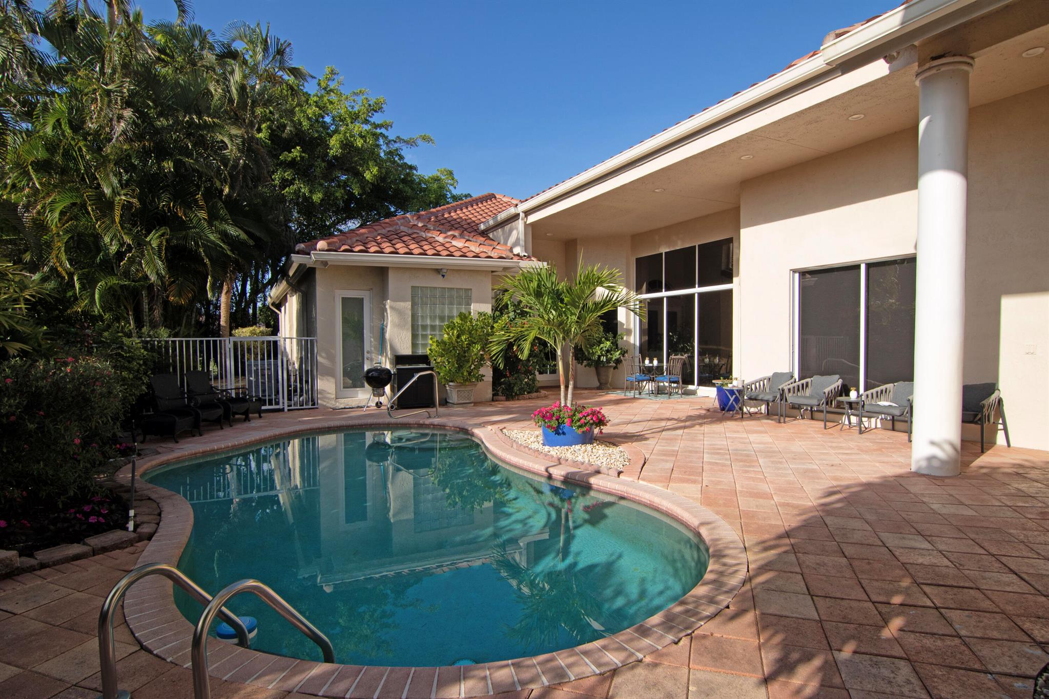 TOTALLY TOTALLY UPDATED A MUST SEE! TRANQUIL COURTYARD HEATED POOL HOME with 3 Bedrooms & 3 Baths in main home with SEPARATE GUEST HOUSE. 2 1/2 Car Garage on private Cul-de-sac. Home sits on the GOLF COURSE in the ELEGANT GOLF COURSE FULL IMMEDITY COMMUNITY of WYCLIFFE. NEW Barrel Tile S ROOF (2020), UPDATED kitchen, Baths, Window Treatments, NEW AC's, NEW Hot Water Heaters.