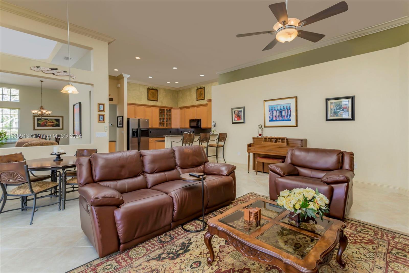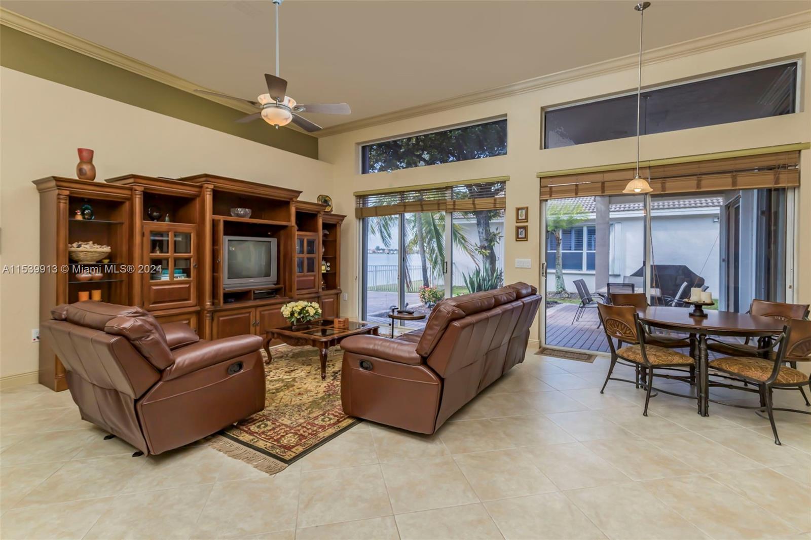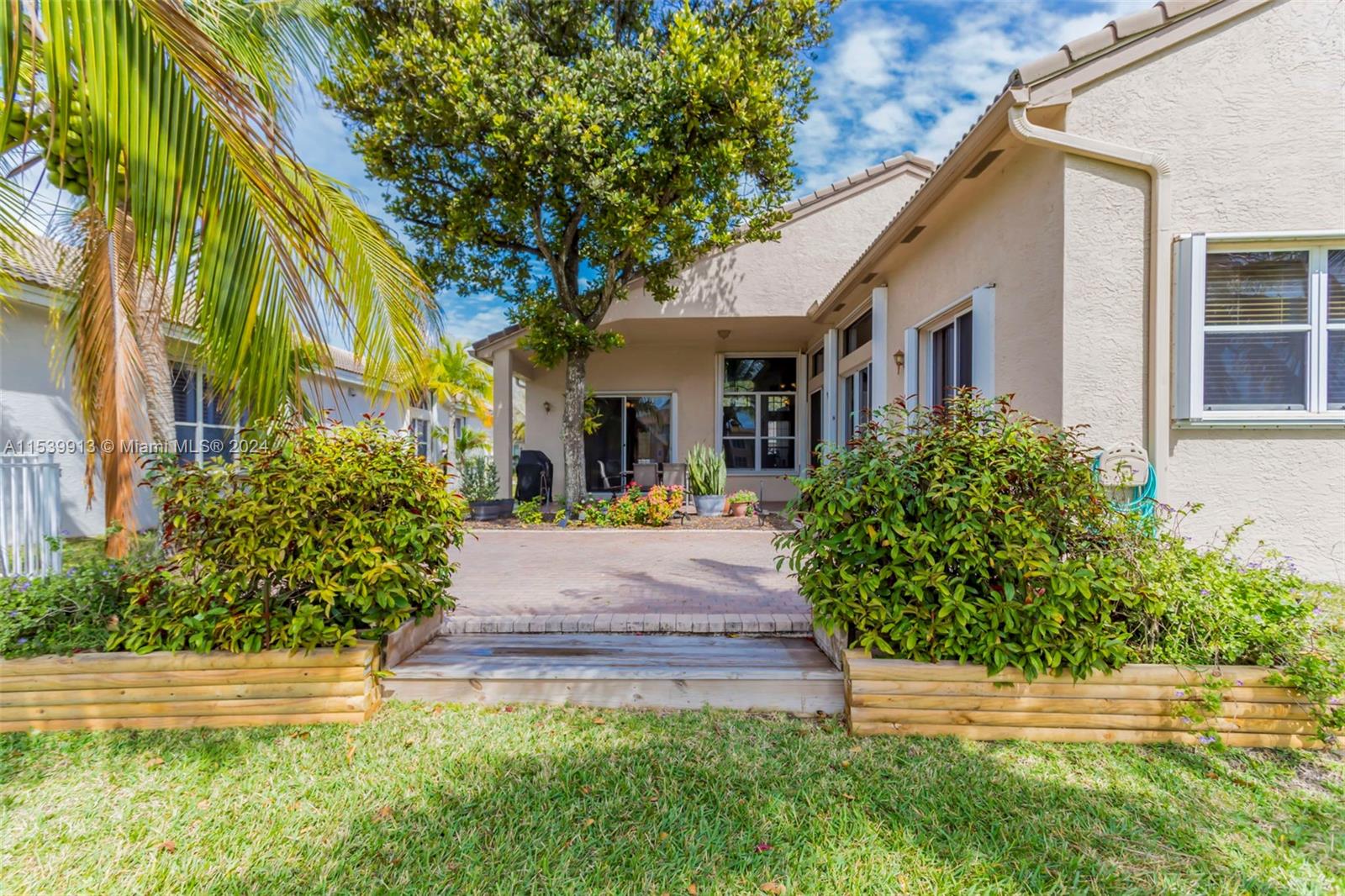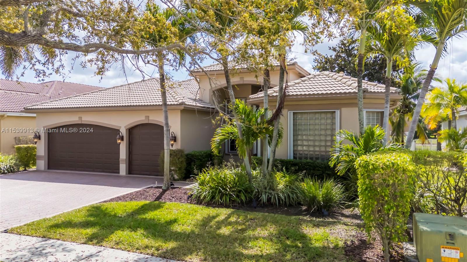 Impeccable one story home with wide lake views in the resort style community of Sunset Lakes. This triple split floor plan has 5 bedrooms, 3 bathrooms & 3 car garage, features volume ceilings and tile flooring in the main living areas. The large kitchen is complete with wood cabinetry, double ovens, wine cooler, granite countertops, snack bar & breakfast area. Covered outdoor sitting area & pavered patio overlooks the lake. This home is protected by accordion shutters.