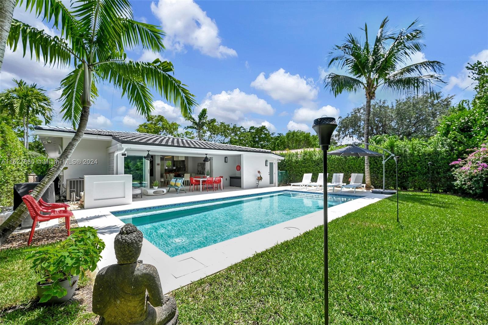 Excellent opportunity to own this modern home on prime location of coral gables golden triangle steps from Biltmore Hotel. Located in much desired tree lined street within walking distance to parks, recreation, markets and downtown coral gables. House has been updated with new bathrooms, high impact windows,italian kitchen with Miele and Sub zero appliances, bright spaces with separate dining, living and extra area to entertain. One car garage. Walk into a foyer which separates both entertaining spaces and your private 3 bedroom suites with many closet space. Walk out to private terrace/patio area from both dining living through wall to wall glass modern sliding doors combining the inside with the outside of home. Salt water pool and patio is privately fenced with surrounding landscaping.