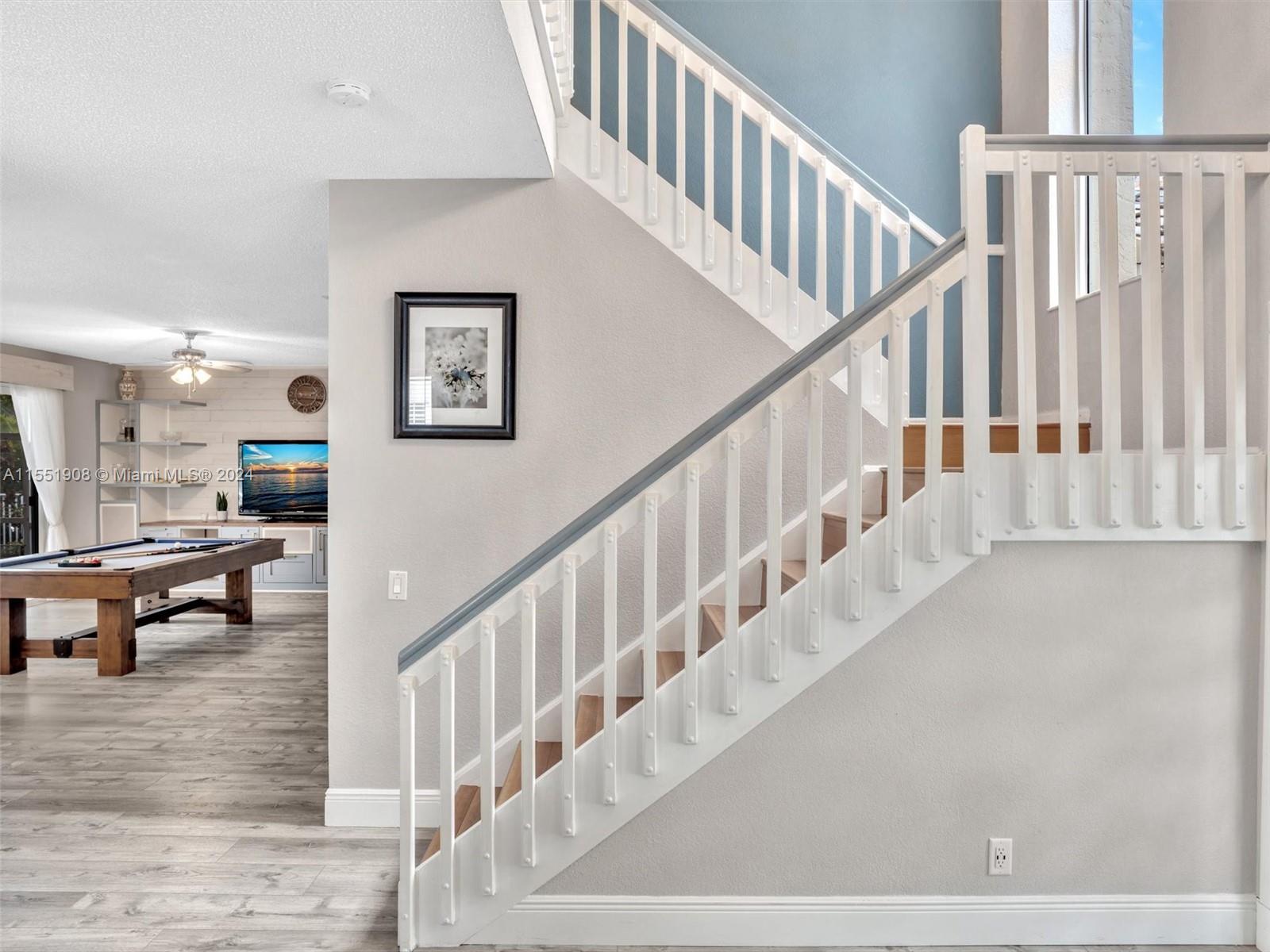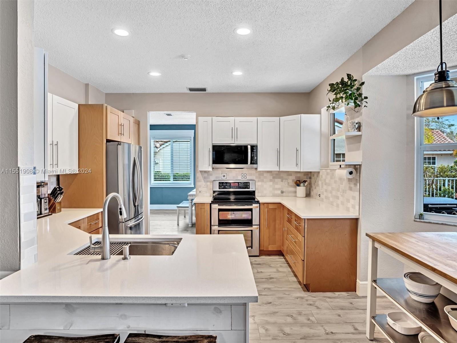 Create memories in this newly updated, coastal chic 4 bed/2.5 bath home nestled on private waterfront lot w/no neighbors behind. Entertain or relax on expansive screened patio accompanied by inviting salt pool surrounded by sprawling fenced yard. Step inside where comfort meets casual sophistication. Kitchen boasts wood cabinets, ss appliances, quartz countertops, snack bar and breakfast nook overlooking generous family rm. Upstairs, retreat to the spacious master bed featuring sitting area and spa-like bathroom complete w/artistic flair. All bathrooms are uniquely updated. Other major improvements include luxury vinyl flooring downstairs, roof 2021, pool resurfaced 2022, impact windows/doors 2021-2023. Guard gated neighborhood w/community pool, play area, soccer field etc. A Must See!