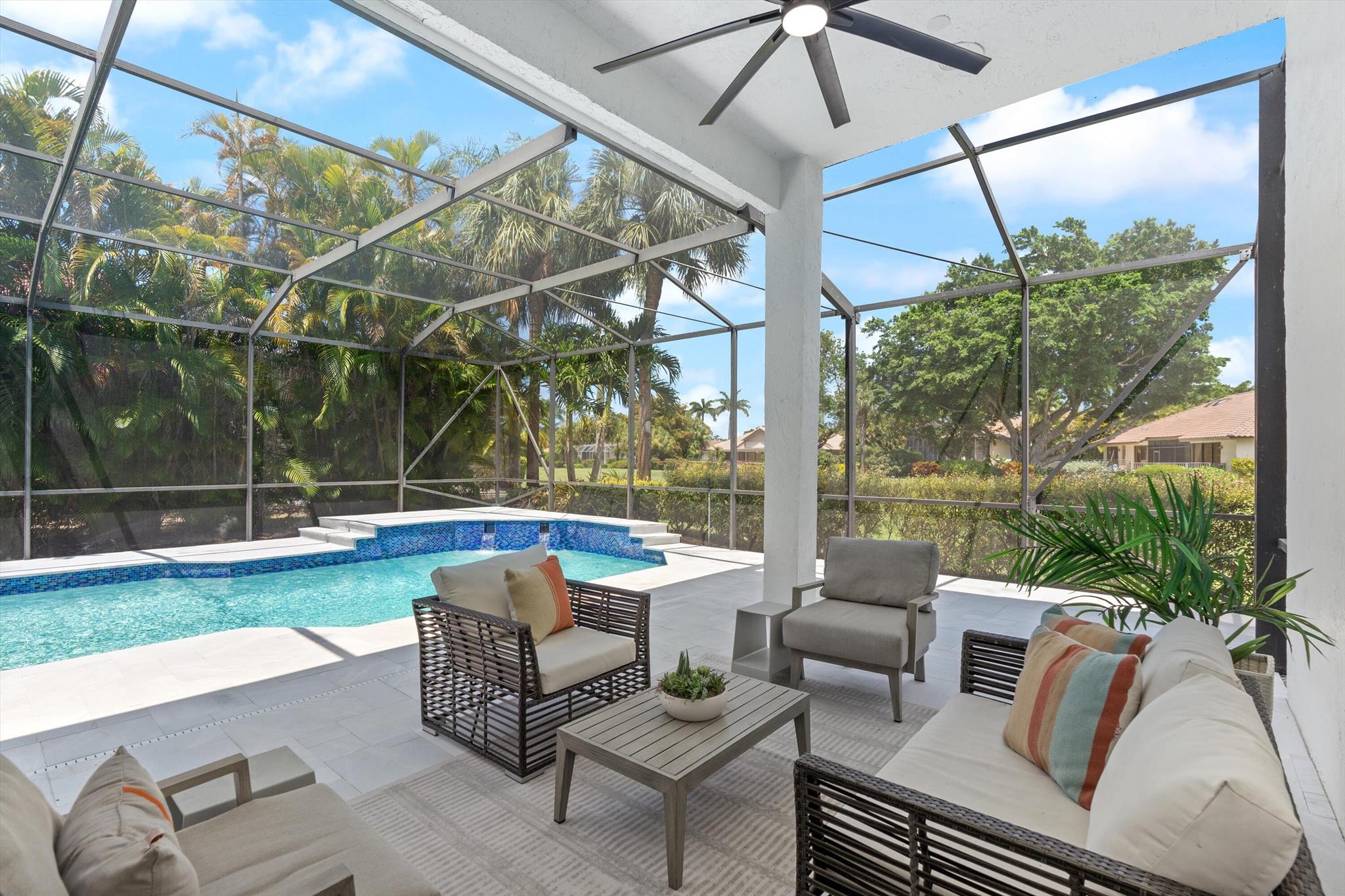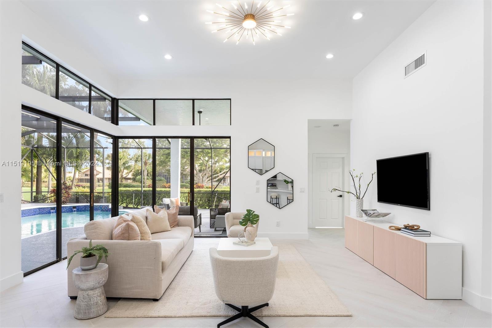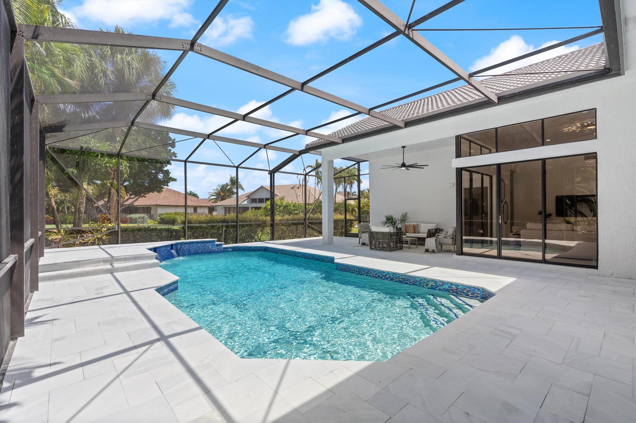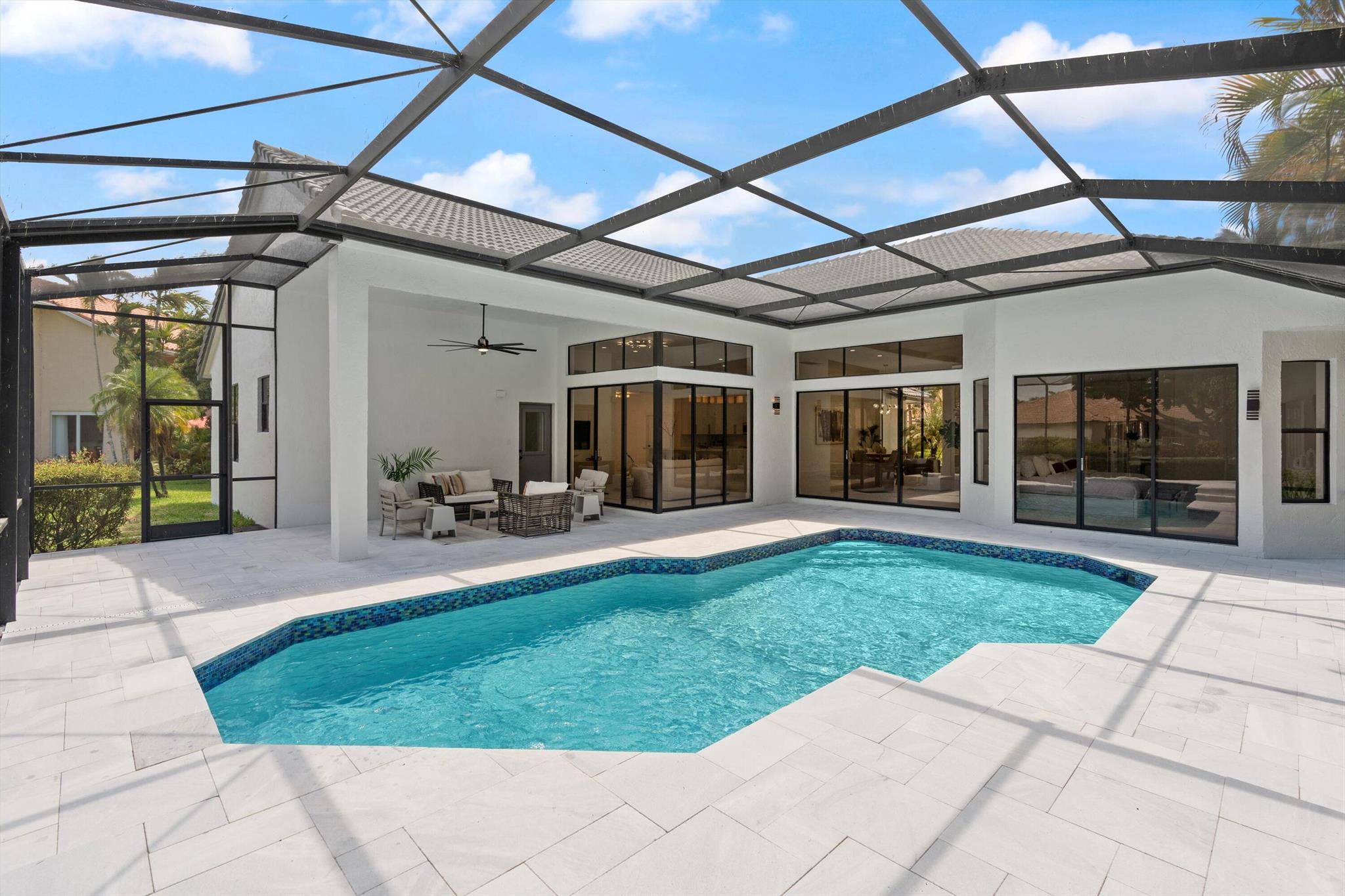 Stonebridge country club in West Boca Raton fully remodeled and stunning 4 bedroom showcase home with screened in swimming pool. A newer roof punctuates this gorgeous and large home that has been renovated to the highest exacting standards. Chevron laid porcelain wood look tile floors, brand new EVERYTHING, including all new kitchen with top of the range model stainless steel appliances, lighted custom cabinetry, and hosting island with quartzite waterfall countertops plus seating. Floor to ceiling windows with 24' ceilings highlight the outside pool area and give the home an immense feel and look. Master bath with slipper tub, and walk in flush laid infinity tile shower with rain head and individual handheld wand. This custom masterpiece is truly second to none with tons of upgrades.