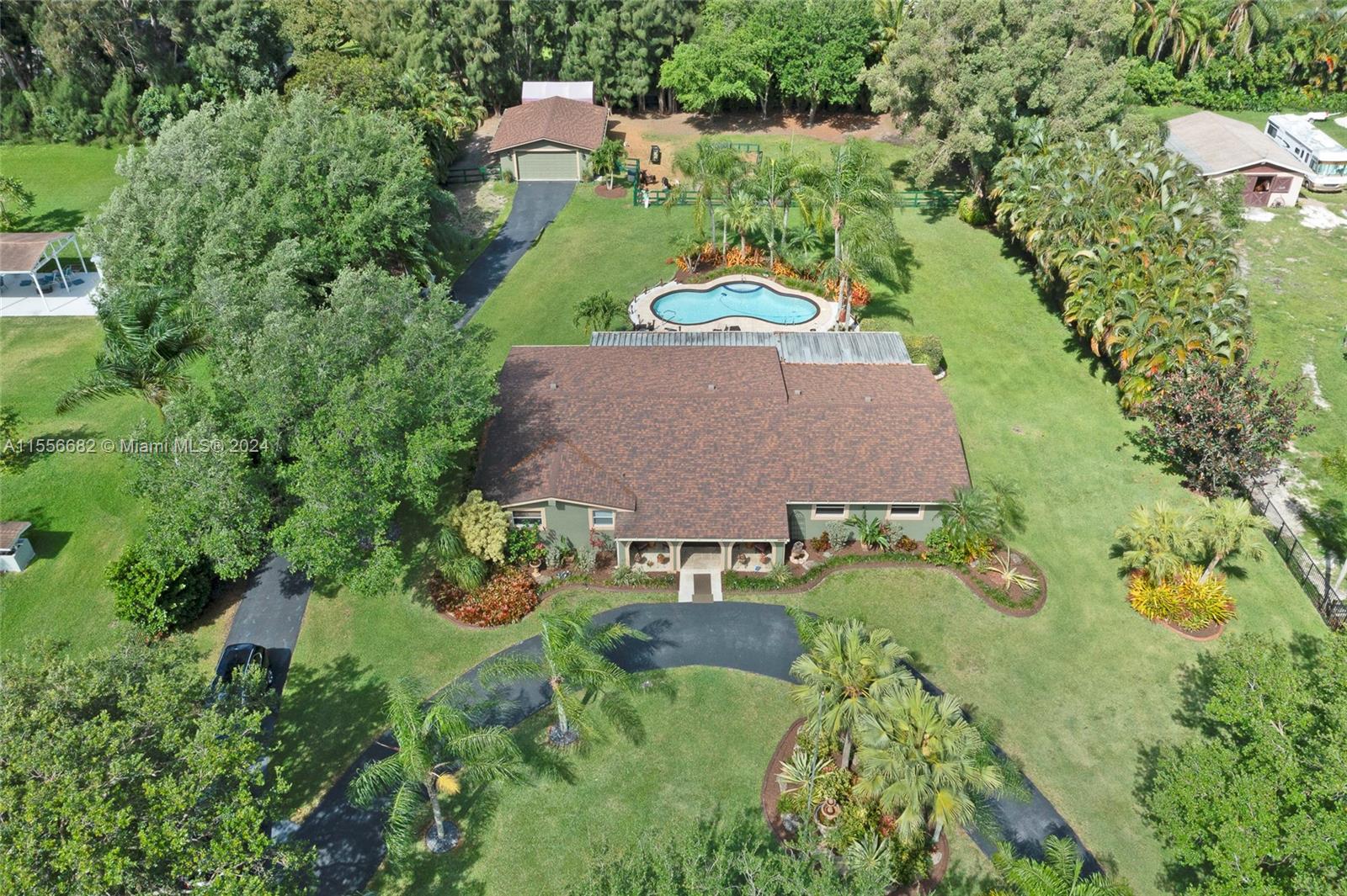 Stunning, spacious home 5 bedroom 4 bath split floor-plan. Private Poolside Oasis and amazing landscaping features throughout entire area ! Huge Master bedroom with Jacuzzi. Open concept gourmet kitchen featuring premium stainless-steel Viking appliances, granite counters, Cathedral wood bean Ceilings. Nice big screened porch looking over the pool. Electric fenced gate, approx. 400 feet of driveway. Impact windows, your own petting zoo, roof is 4 years old. Garage is a stand alone structure with dual entrances, excellent storage area. Complete oversize shed-storage-tool room plenty of storage. Livestock not included.