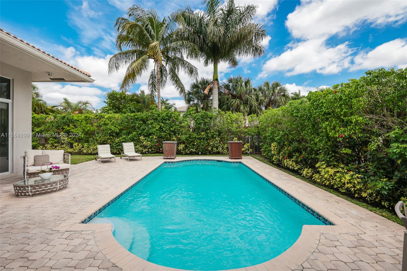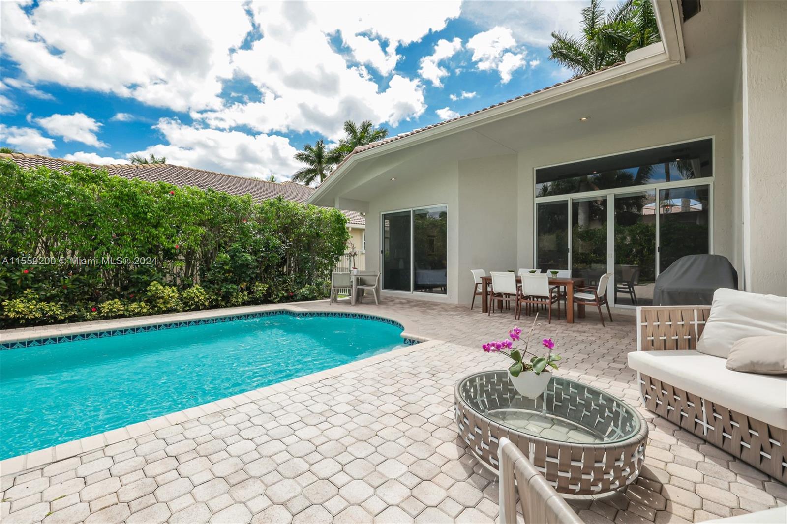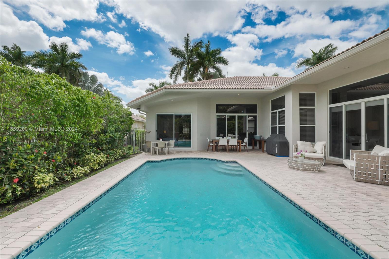 Nestled within the prestigious Weston Hills Country Club this elegant residence is sophisticated and meticulously maintained. The property features 4 bedrooms and 3 bathrooms with porcelain flooring across all common spaces. The Primary Suite offers luxurious engineered wood flooring, a cozy sitting area, a spacious bathroom with dual sinks and a separate shower. The kitchen comes with stainless steel appliances and new countertops, ensuring a ready-to-enjoy home experience from the moment you step in. The outdoor area with pool and brand new diamond bright, is perfect for gatherings. The home seamlessly combines style and functionality. Steps from School Bus Stop, Park, Playground, Basketball and Pickleball Court. A+ schools. Near north gate and Highways.