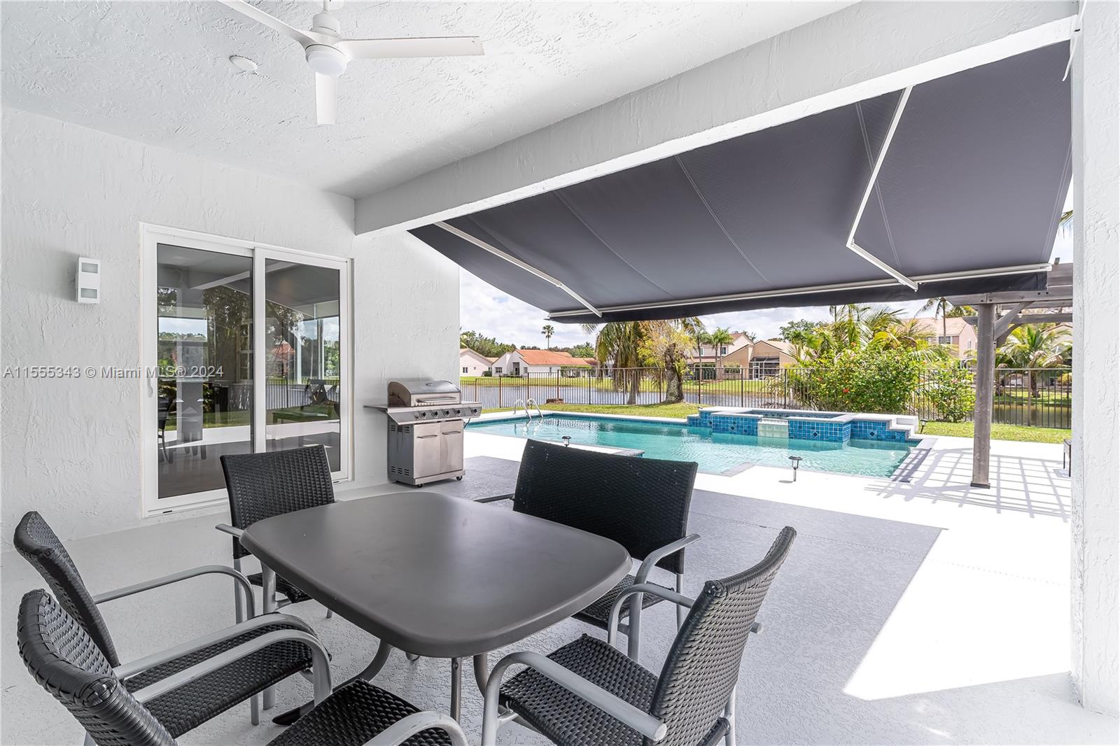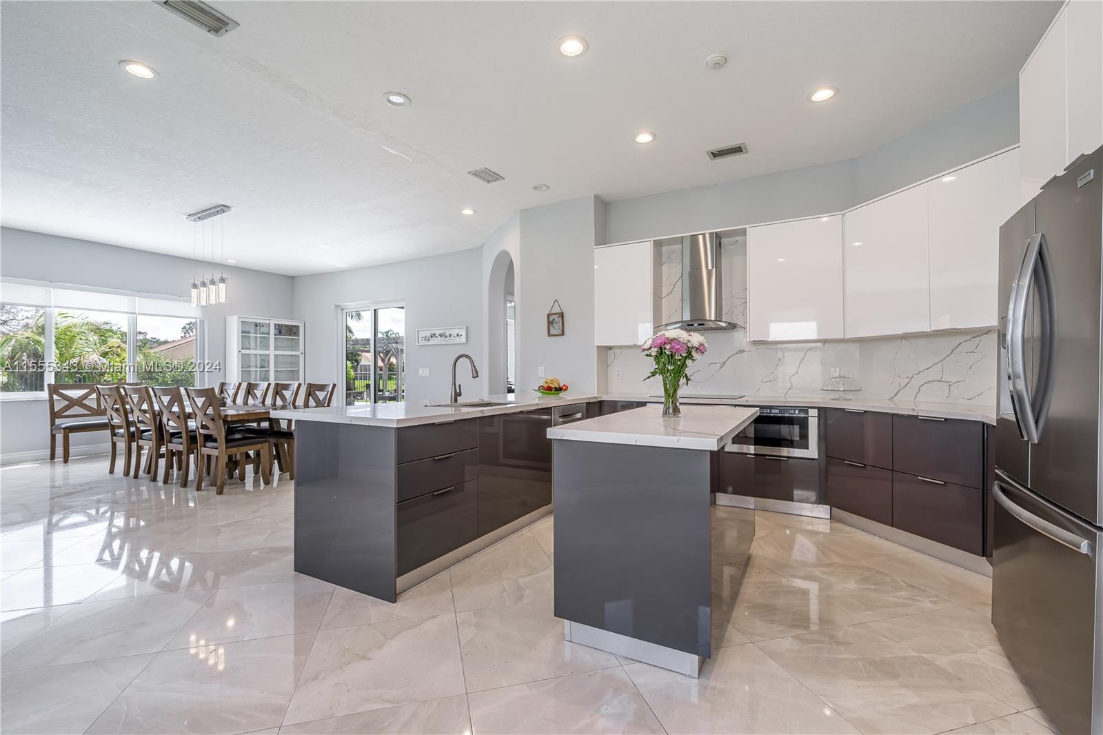 Beautiful 6b/4b Lakefront Pool Home nested on a pie shaped .39 Acre Cul-De-Sac Lot at The Hamptons in The Lakes! Be captivated by the spectacular panoramic lake views! 157 ft water frontage. Tons of natural light flows through the windows. This Home features a two story volume foyer, 10ft ceilings in first floor, 2020 Roof, 2022 Impact Windows & Sliding Doors, 2022 2 ACs, 2022 wood floors, stairs & baseboards, stunning marble floors, a gorgeous custom 2024 Chef's Kitchen w/quartz countertops & SS Appliances opens to an oversized FR & breakfast area, oversized main bedroom with lake views, 2023 window treatments, expansive concrete terrace with 2023 electrical awning extending the already large covered area, 2022 pool pump & more. Fully fenced. Beautifully landscaped. SEE VIRTUAL TOUR!