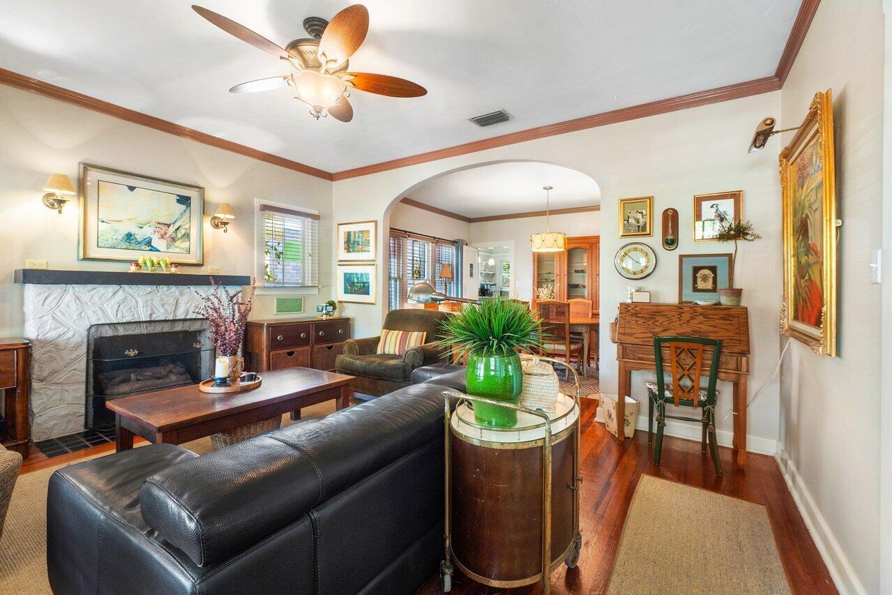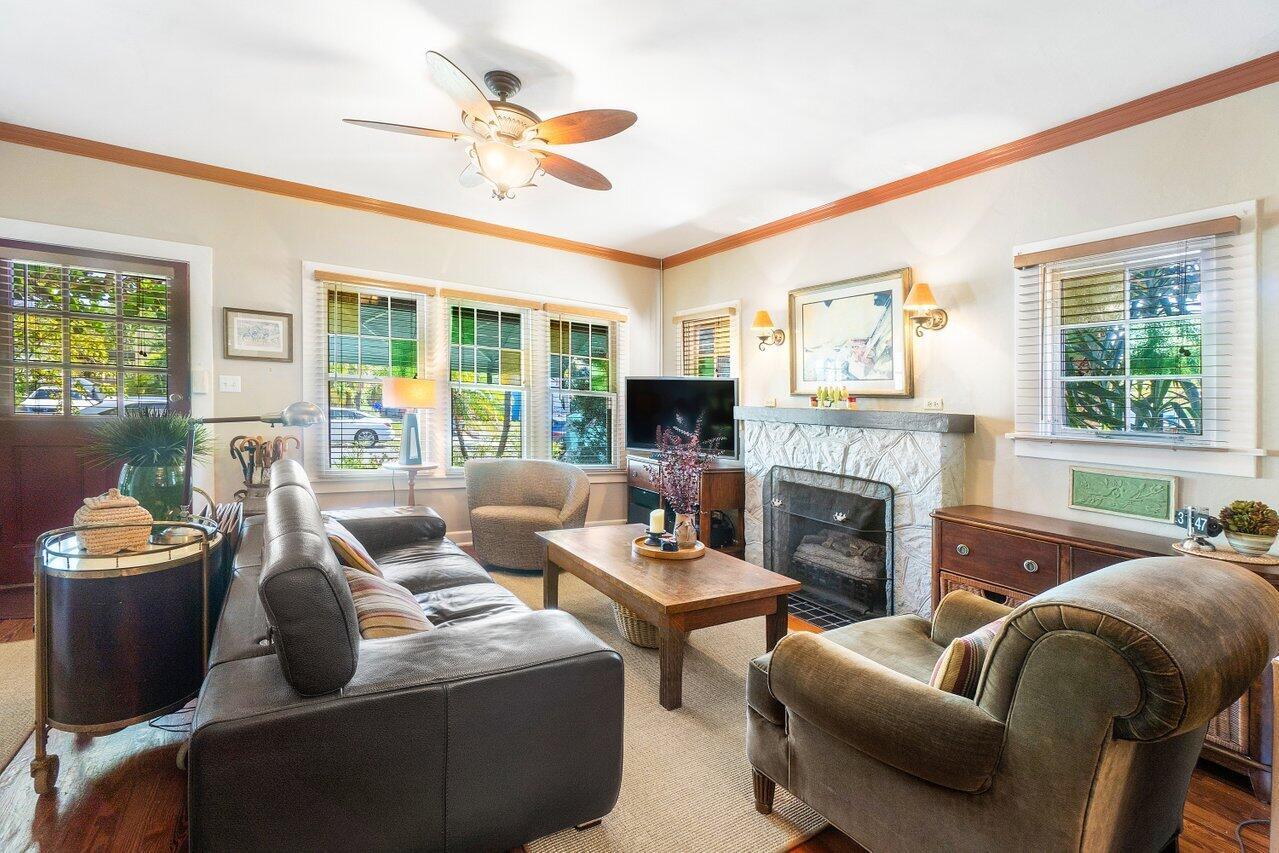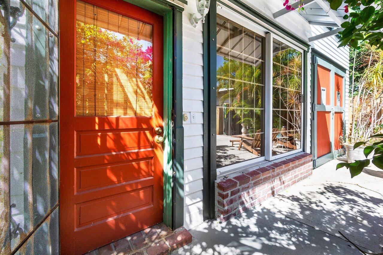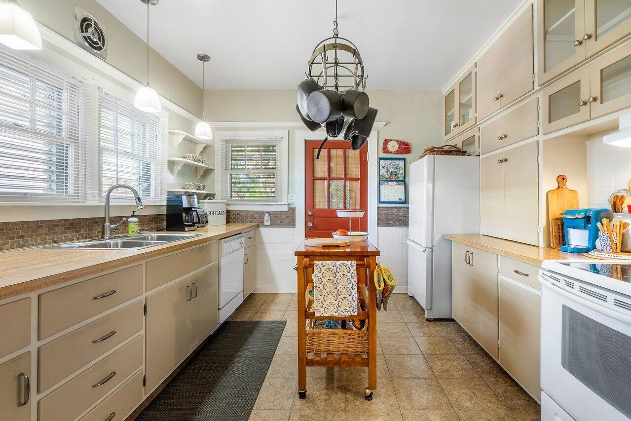 Classic 1930's Americana. White wood-sided 3 bed/1 bath bungalow and a companion 2-story guest house. Unbelievably maintained true to its style and construction with a wonderfully peaceful traditional garden in which to enjoy both shade and sun (room for a pool). The house has 30's features of fireplace and mantle, arches, Dade County pine floors, original wood windows, built-ins and old charm seamlessly incorporated with modern features. Bet you've never seen this before: tongue and groove wood sheathing in the attic, which has a lot of clearance to make it into an additional room. The 2-story building has a 2-bedroom 1-bath apartment for your guests or to escape and read your book. Downstairs in a kitchen and lots of space for a living room (currently a workshop). High lot-no flooding.