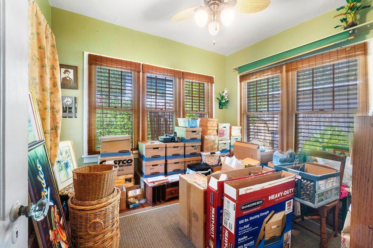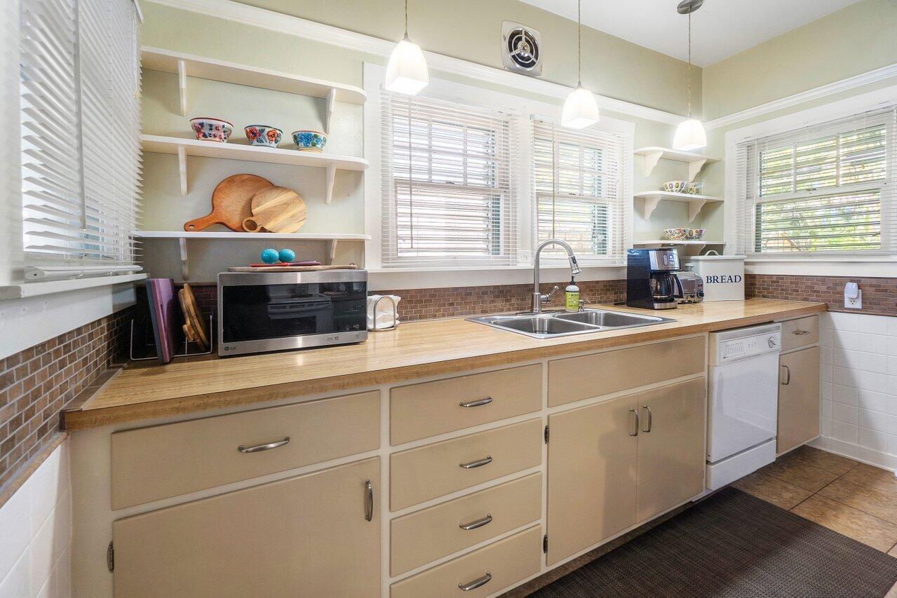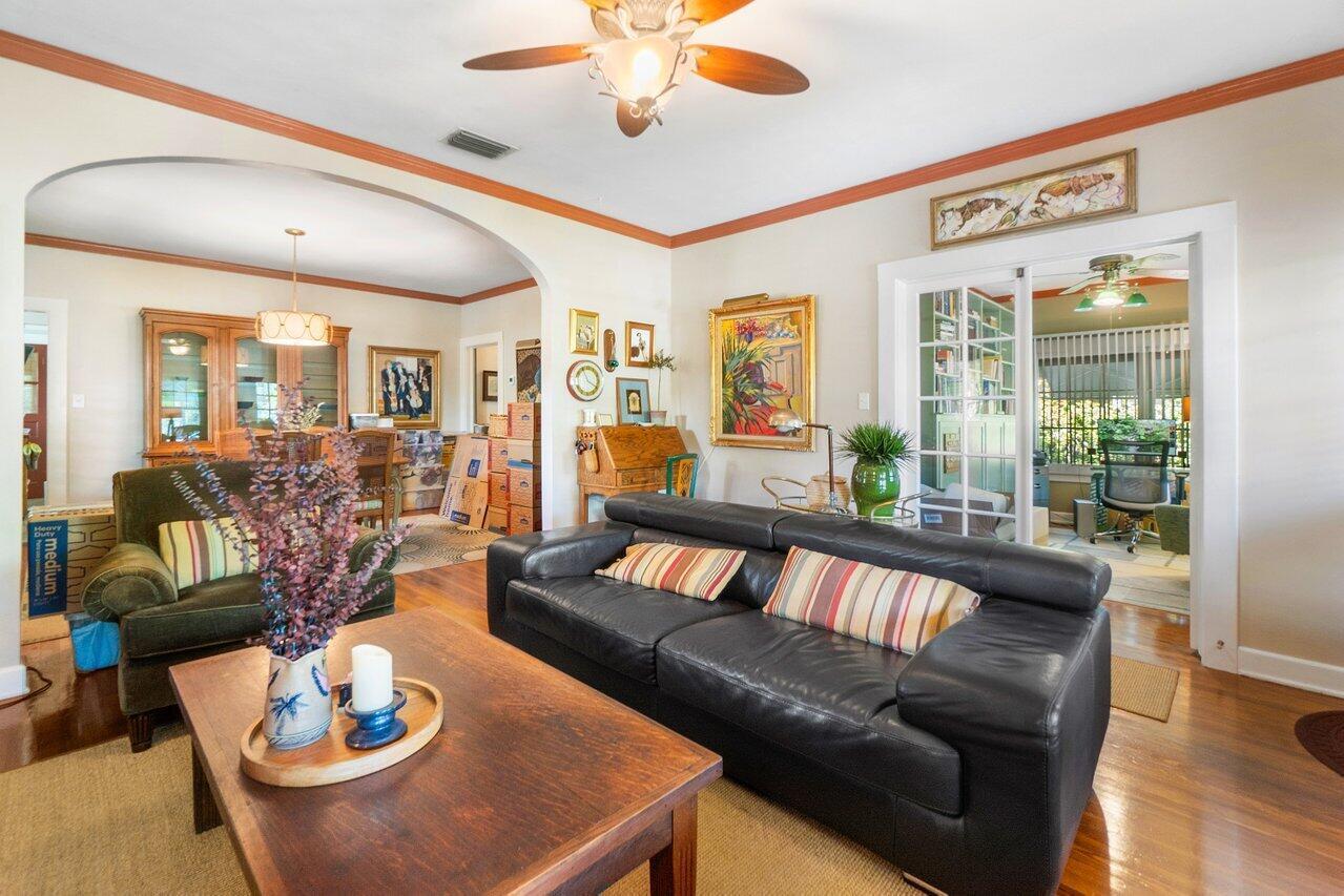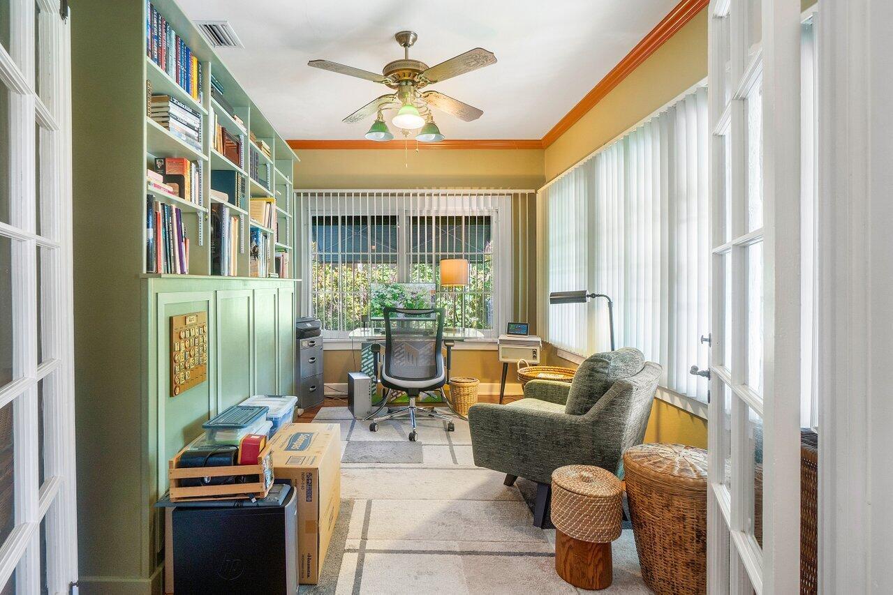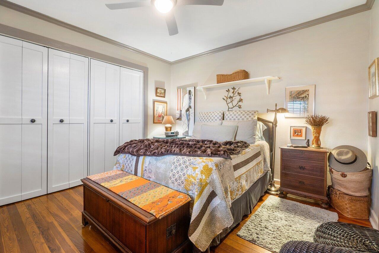 Classic 1930's Americana. White wood-sided 3 bed/1 bath bungalow and a companion 2-story guest house. Unbelievably maintained true to its style and construction with a wonderfully peaceful traditional garden in which to enjoy both shade and sun (room for a pool). The house has 30's features of fireplace and mantle, arches, Dade County pine floors, original wood windows, built-ins and old charm seamlessly incorporated with modern features. Bet you've never seen this before: tongue and groove wood sheathing in the attic, which has a lot of clearance to make it into an additional room. The 2-story building has a 2-bedroom 1-bath apartment for your guests or to escape and read your book. Downstairs in a kitchen and lots of space for a living room (currently a workshop). High lot-no flooding.