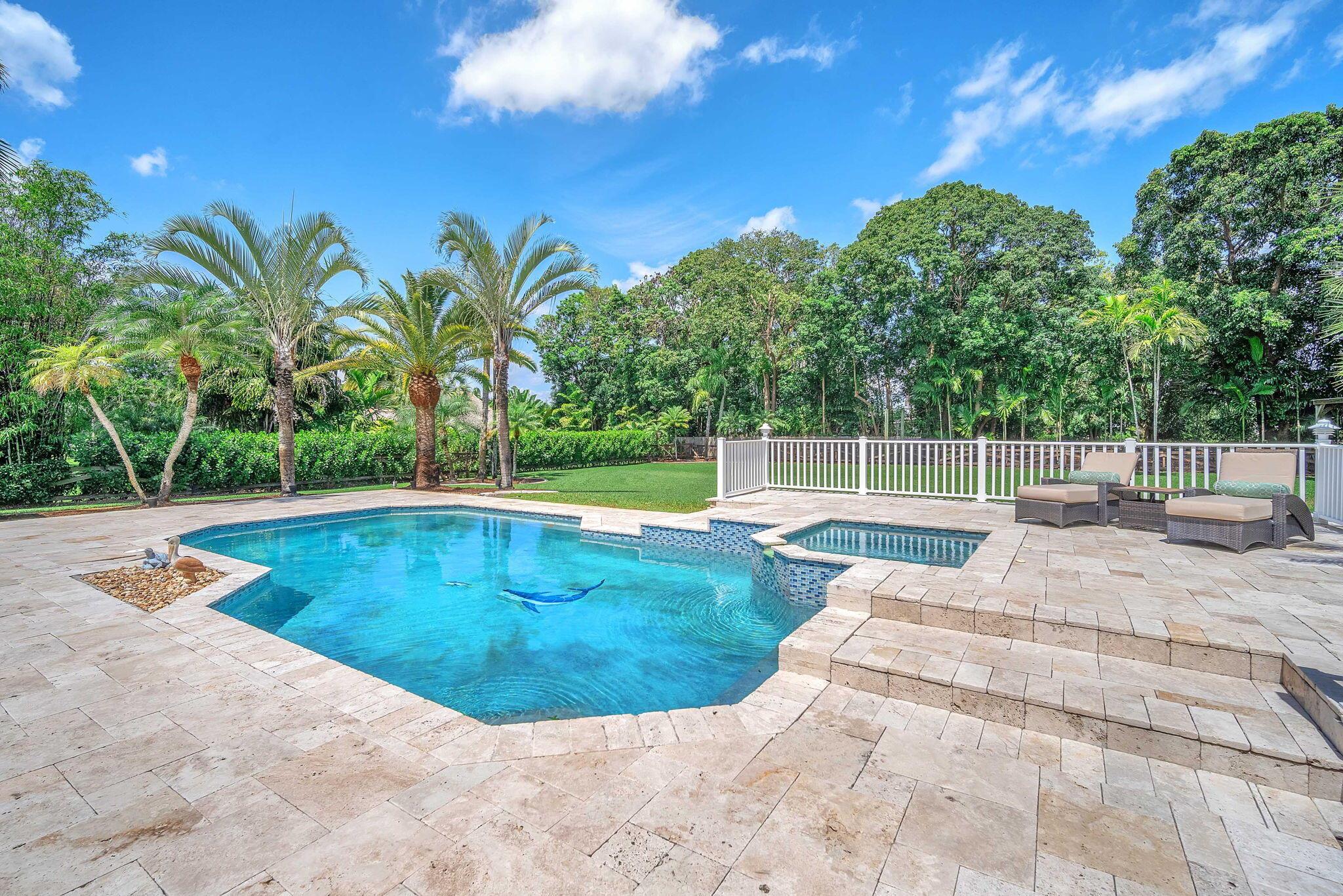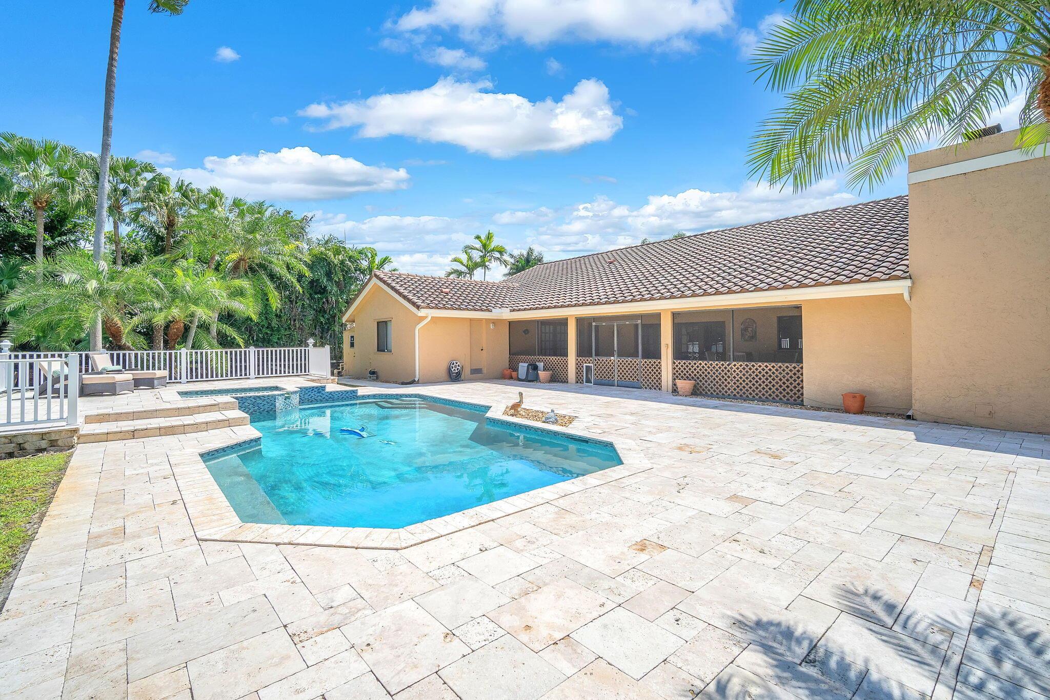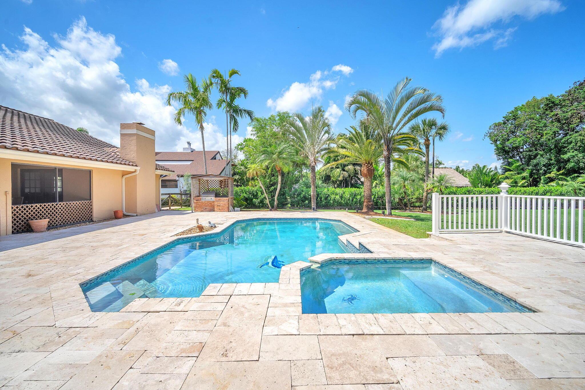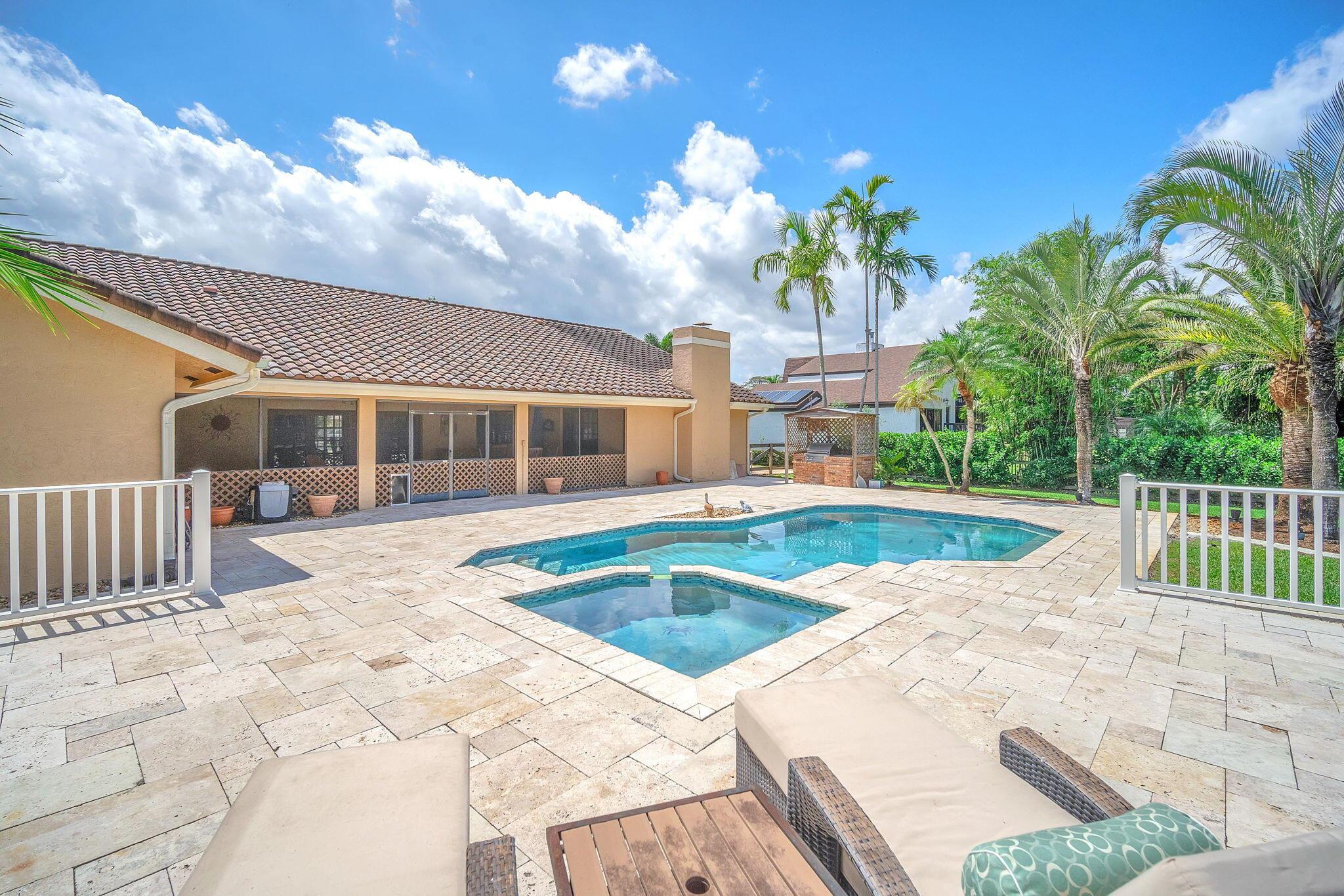 This stunning 4-bed, 3-bath home offers a haven of luxury & comfort. Step inside to discover a formal living room & dining room, ideal for entertaining guests. The large open kitchen featuring double ovens & stainless steel appliances is just perfect for culinary enthusiasts. The master bedroom is a spacious retreat, complemented by a large master bath boasting a soaking tub & walk-in shower. Outside, a screened lanai w/ travertine tile sets the stage for relaxation & outdoor dining, complete w/ an outdoor kitchen. The pool & spa provide a refreshing escape, surrounded by ample space for sunbathing & lounging. The property is fenced in, offering security & privacy. This home is a sanctuary of upscale living, blending indoor elegance and outdoor charm