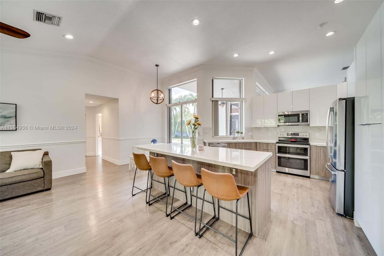 Beyond the double doors, you’ll find a personal oasis in the heart of Weston‘s coveted, guard-gated “Lakes” community: double-volume ceilings & oversized windows provide tons of natural light & views of the saltwater pool, travertine patio area & large backyard. No expense was spared in the kitchen design fit for a chef: GE appliances, 30” sink, European-style cabinetry...stylish & durable Calcutta quartz countertops offer plenty of space to gather & entertain. Bathrooms are spacious, light & bright with neutral contemporary finishes & Kohler fixtures. Enjoy peace of mind knowing the tile roof was replaced in 2019 & with hurricane protection for the entire home. The community has a private park, a game field & a swimming pool. Minutes from shopping & dining, top-rated schools & highways.