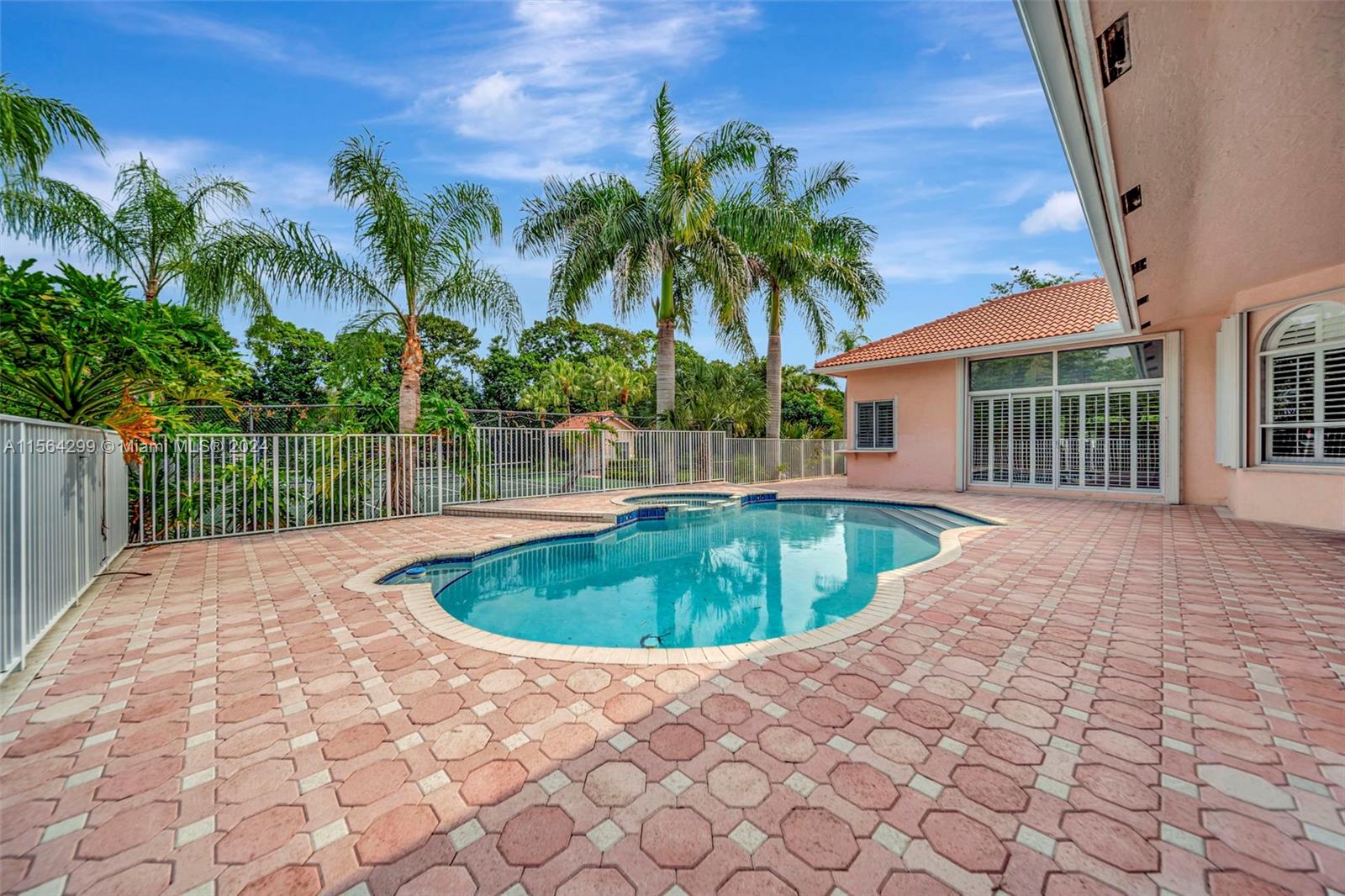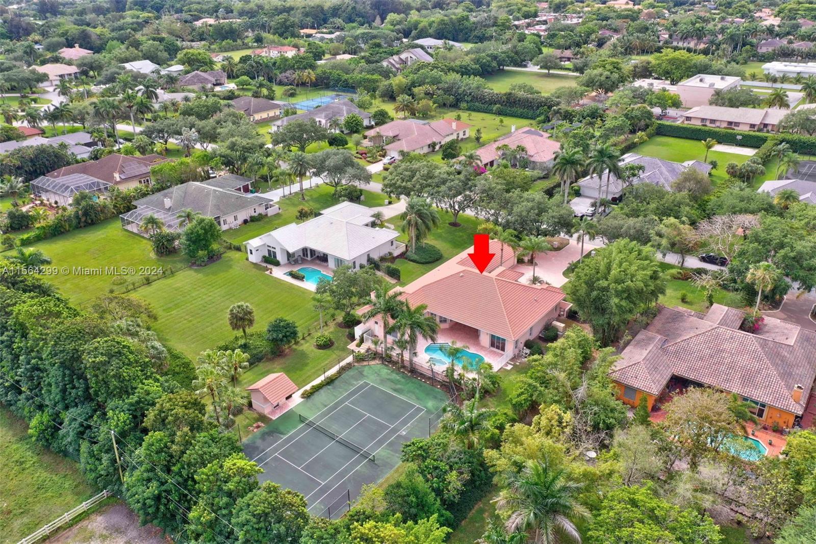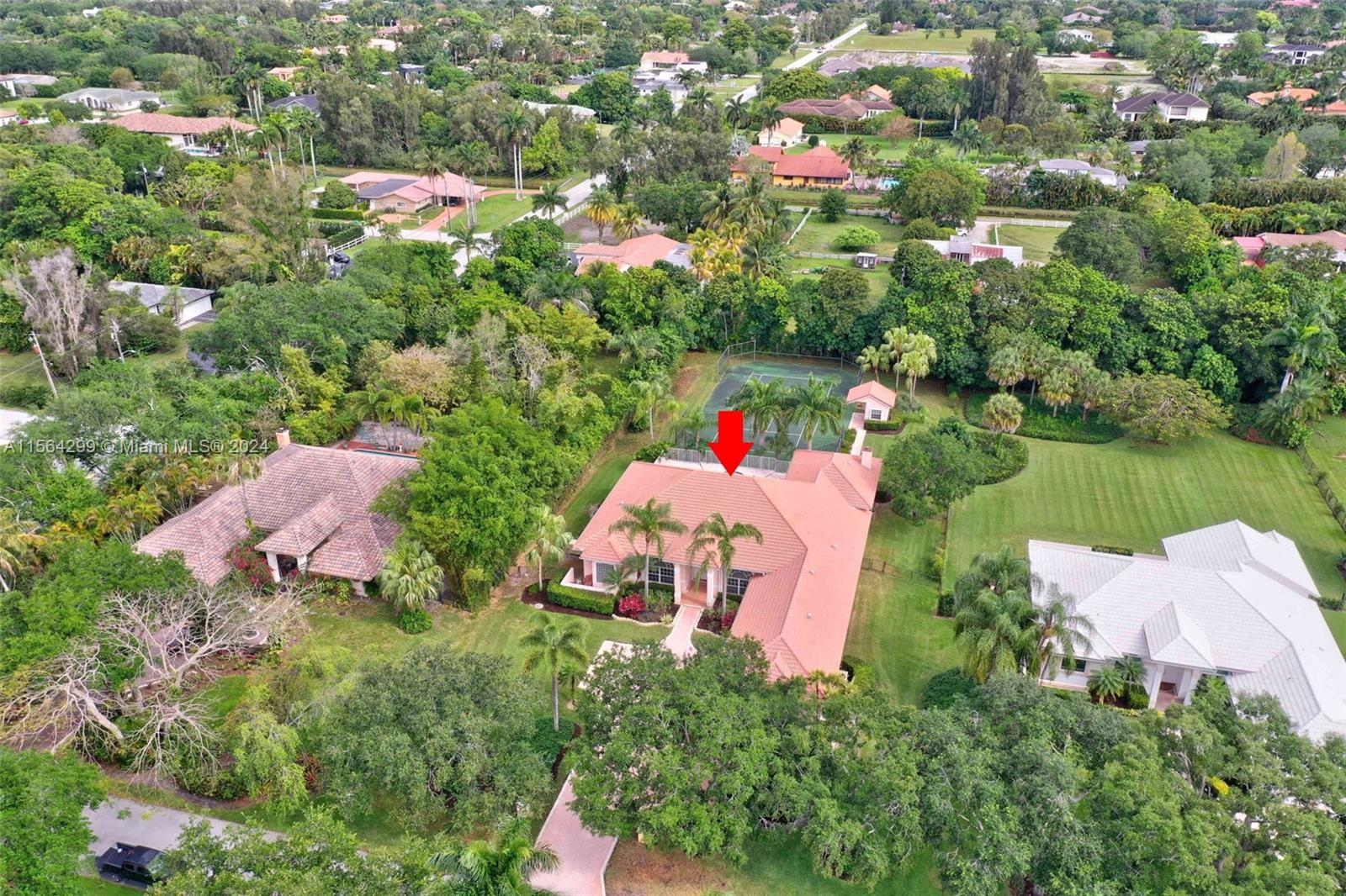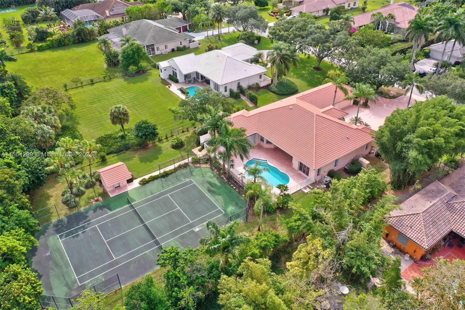 Tucked away in the desirable Plantation Acres, this exquisitely cared-for home boasts 5 bedrooms plus a Den, and 4 bathrooms, occupying a splendid builder's acre. Cherished by its owners for over three decades, it features soaring 12-foot ceilings, vast areas for social gatherings, a wood burning fireplace, hardwood floors across all bedrooms, and a massive master suite with breathtaking views of the outdoors. The kitchen is complete with a cooking island and ample storage. Outside, relax in the pool and spa or watch tennis games on your private court. The property also includes a versatile art studio/storage building. Equipped with a whole house generator and secured by accordion shutters throughout, it's ideally situated near American Heritage School, major highways, and shopping hubs.