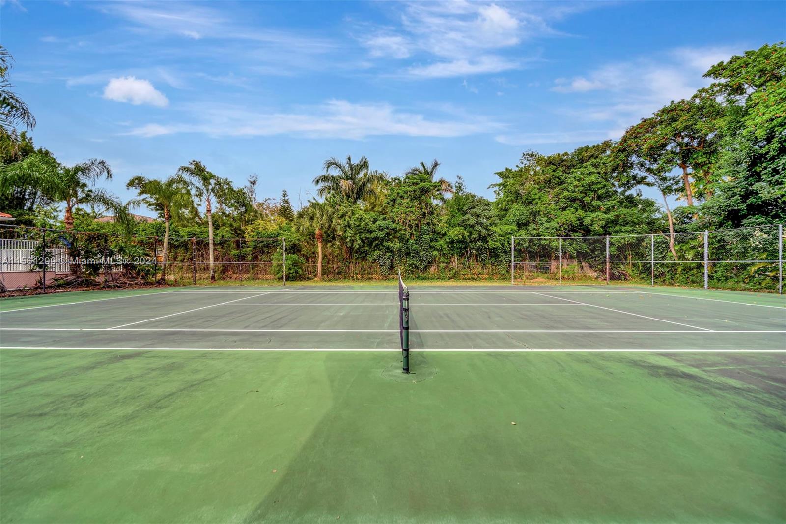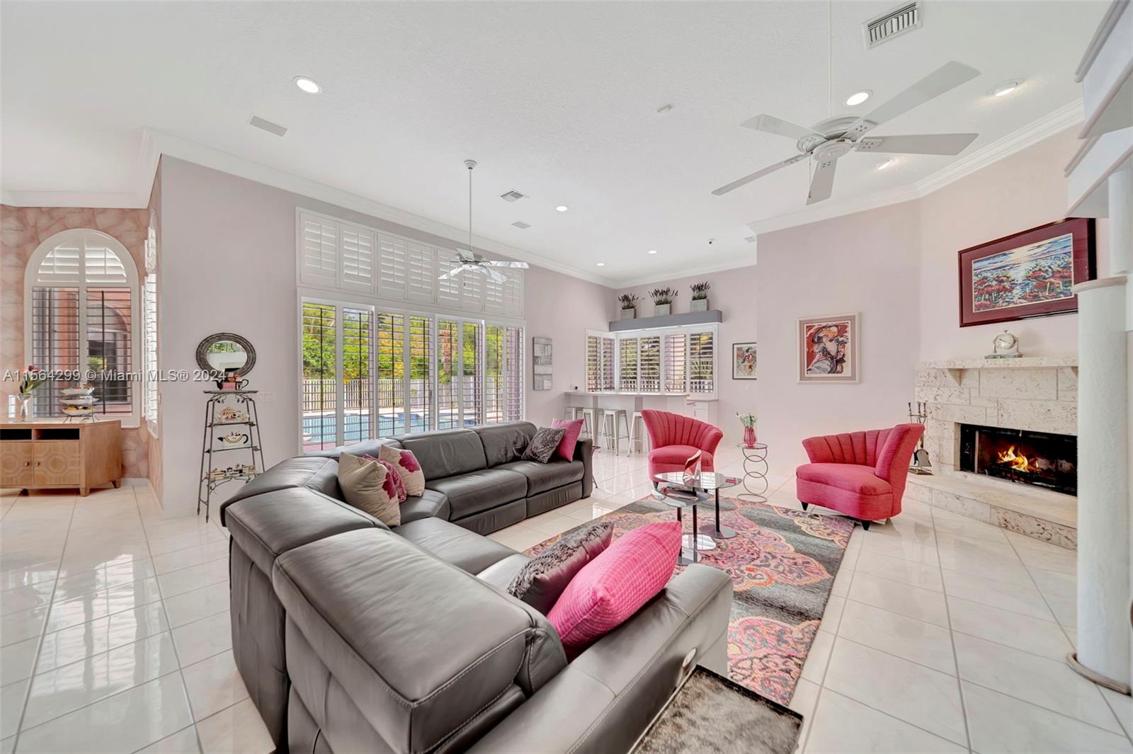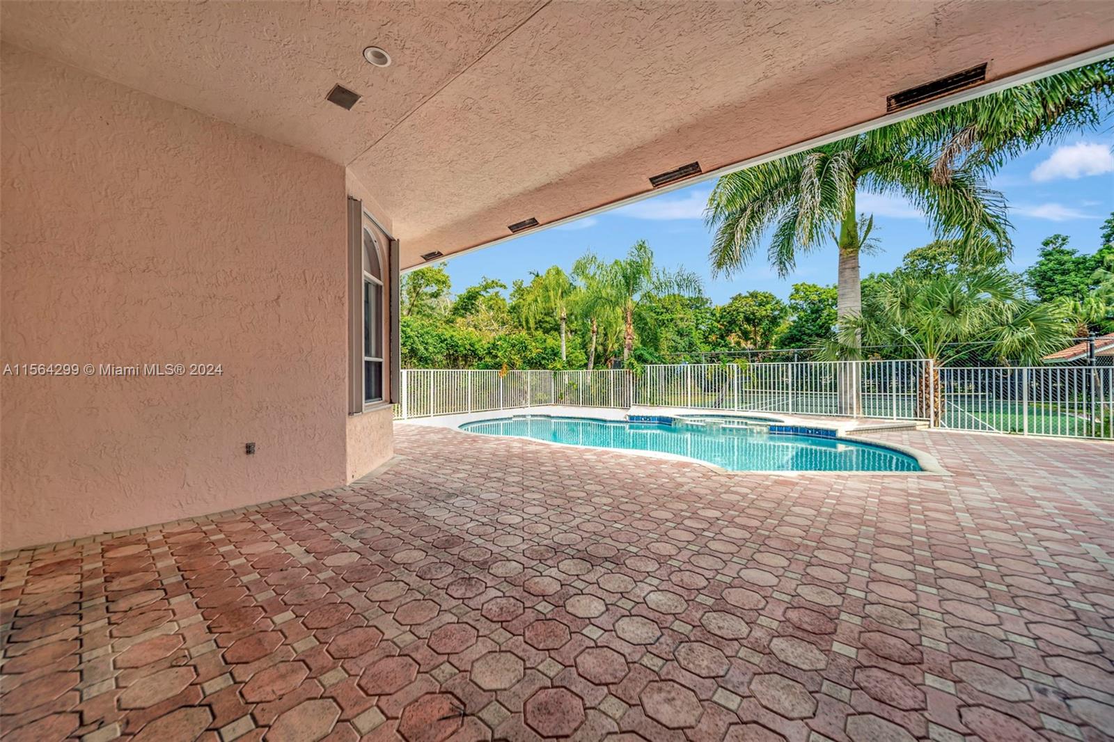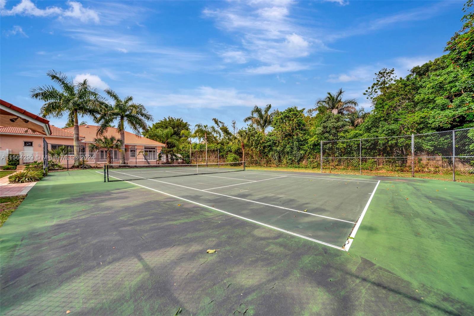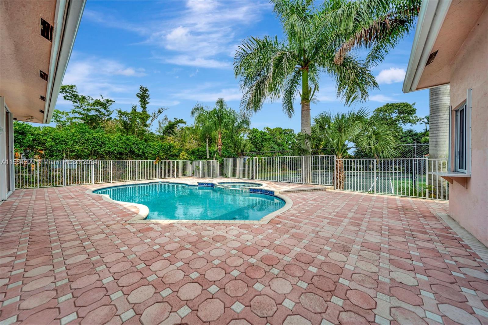 Tucked away in the desirable Plantation Acres, this exquisitely cared-for home boasts 5 bedrooms plus a Den, and 4 bathrooms, occupying a splendid builder's acre. Cherished by its owners for over three decades, it features soaring 12-foot ceilings, vast areas for social gatherings, a wood burning fireplace, hardwood floors across all bedrooms, and a massive master suite with breathtaking views of the outdoors. The kitchen is complete with a cooking island and ample storage. Outside, relax in the pool and spa or watch tennis games on your private court. The property also includes a versatile art studio/storage building. Equipped with a whole house generator and secured by accordion shutters throughout, it's ideally situated near American Heritage School, major highways, and shopping hubs.