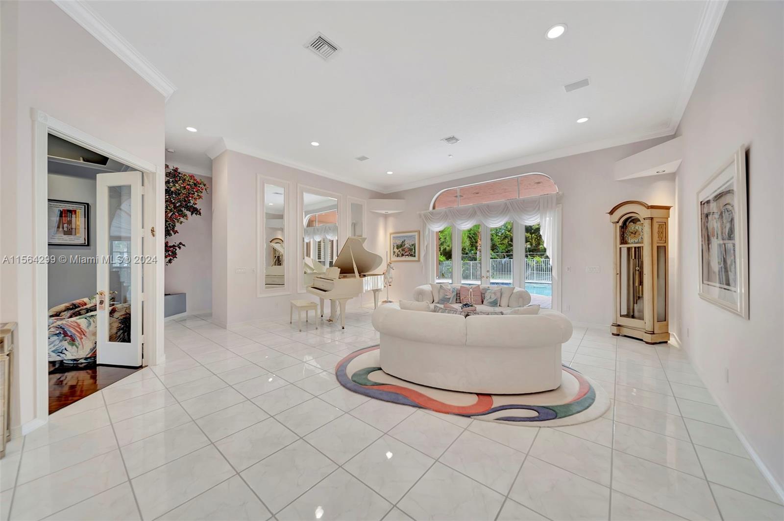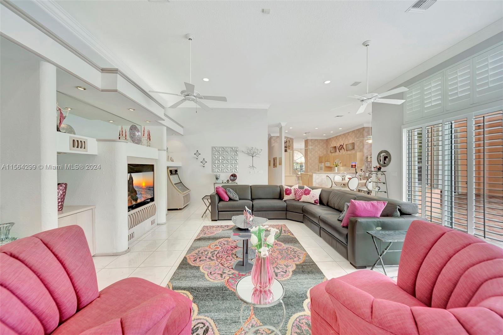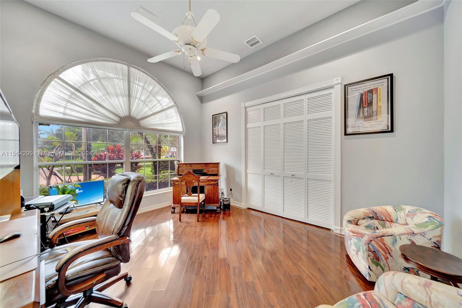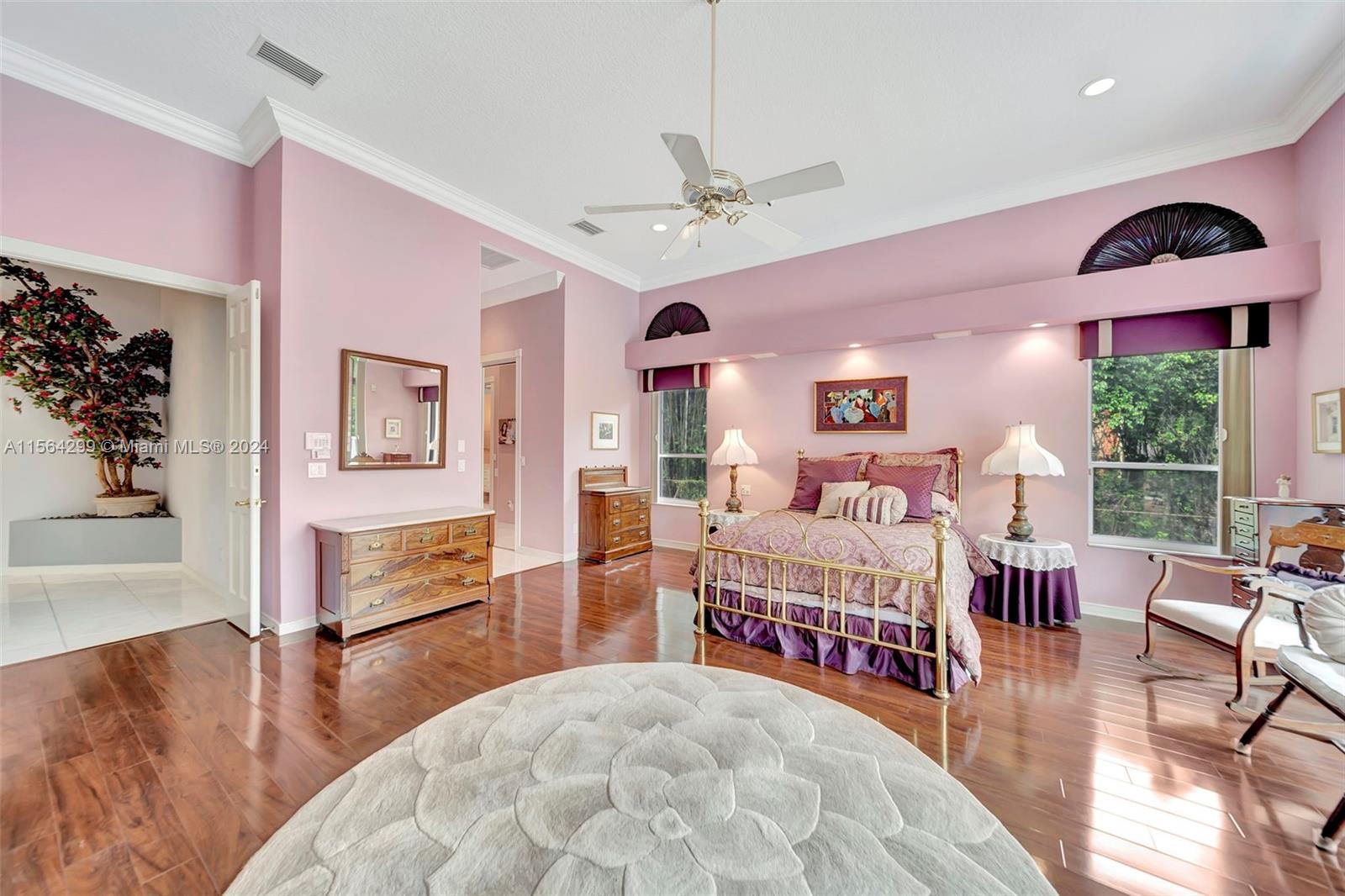Tucked away in the desirable Plantation Acres, this exquisitely cared-for home boasts 5 bedrooms plus a Den, and 4 bathrooms, occupying a splendid builder's acre. Cherished by its owners for over three decades, it features soaring 12-foot ceilings, vast areas for social gatherings, a wood burning fireplace, hardwood floors across all bedrooms, and a massive master suite with breathtaking views of the outdoors. The kitchen is complete with a cooking island and ample storage. Outside, relax in the pool and spa or watch tennis games on your private court. The property also includes a versatile art studio/storage building. Equipped with a whole house generator and secured by accordion shutters throughout, it's ideally situated near American Heritage School, major highways, and shopping hubs.