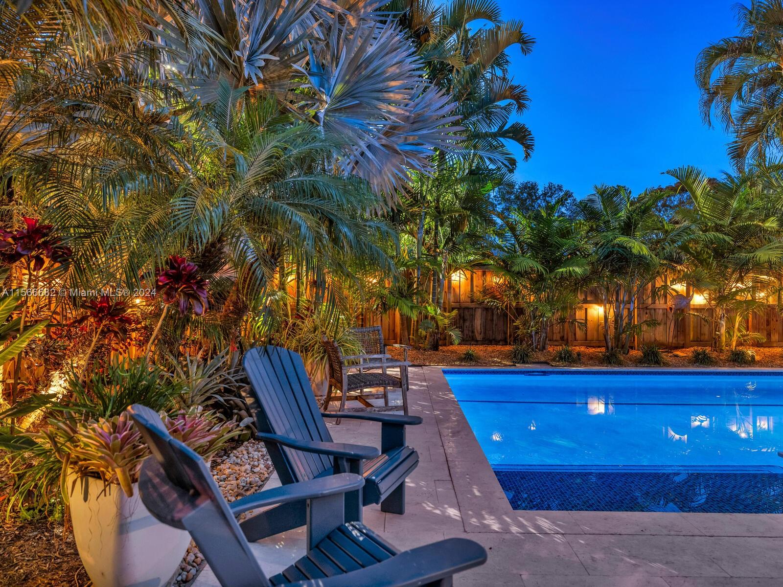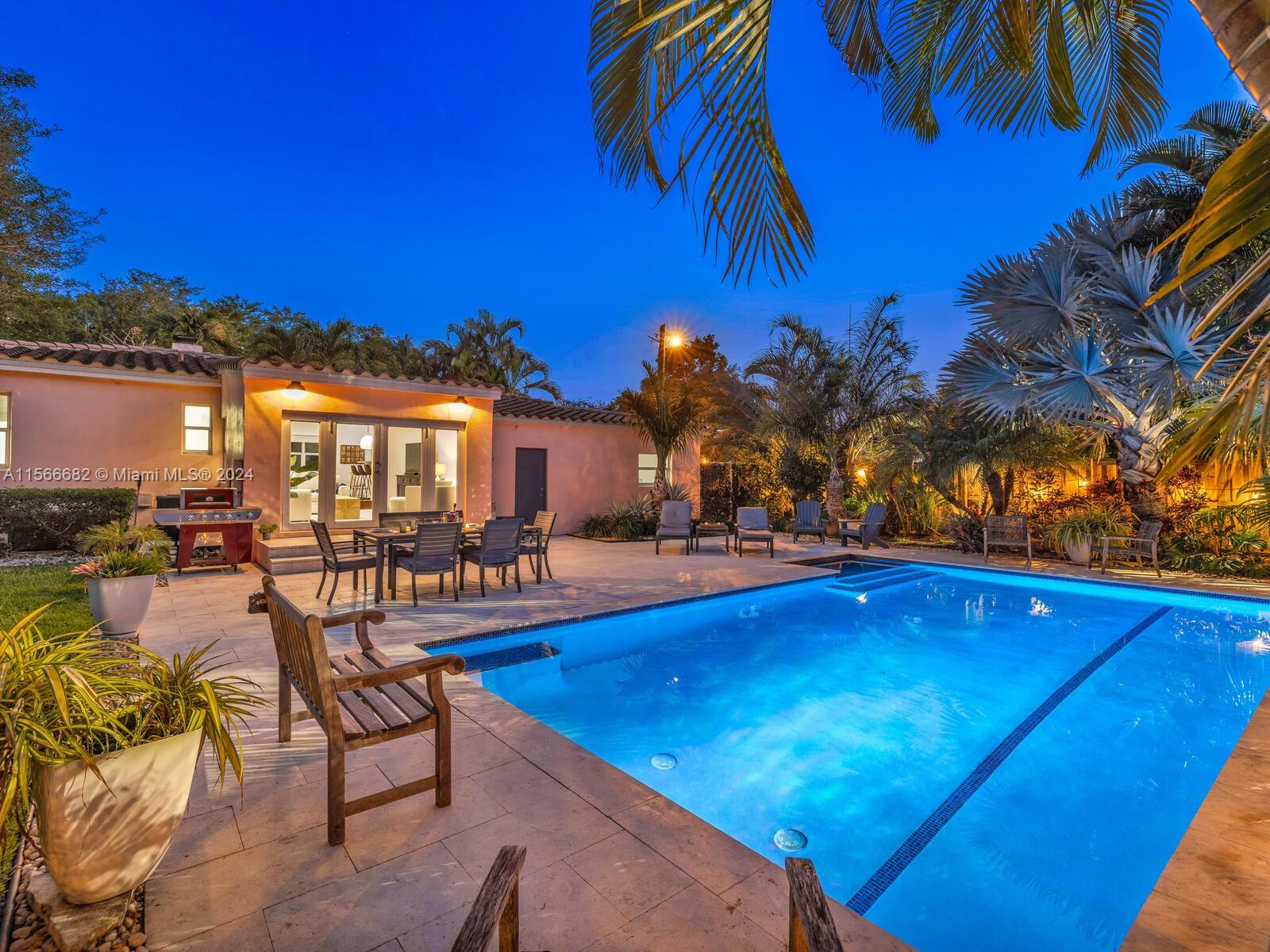 Welcome to Shores Casa Rosa! Discover peace and serenity in this nicely updated Miami Shores pool home. Enter into the light and bright, sun-drenched great open-flow plan with large formal living, dining, updated kitchen, and spacious media room opening to the spectacular tropical gardens, including a fabulous sparkling heated pool, large entertainment patio, and lush privacy landscaping throughout— your own private oasis! Unwind in the lovely main ensuite retreat with updated bath, plus a guest wing with updated bath and two spacious guest rooms. All situated on a corner lot with a side alley garage entry (spacious one-car garage), newer roof and AC, plus impact windows and doors, all in a non-flood zone, just a few blocks to Downtown Miami Shores shops and restaurants. Welcome home!